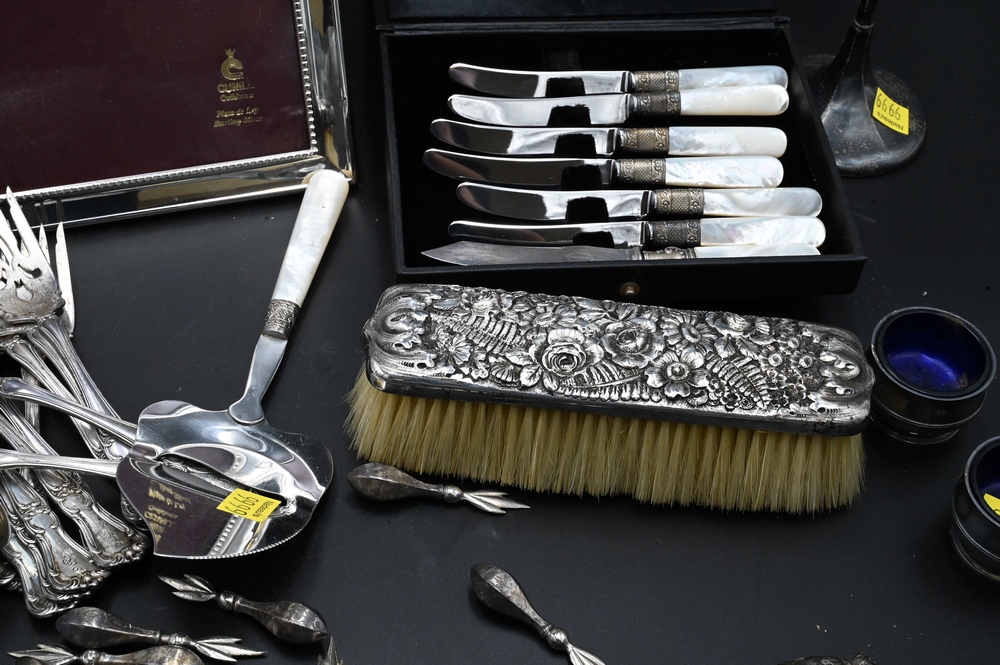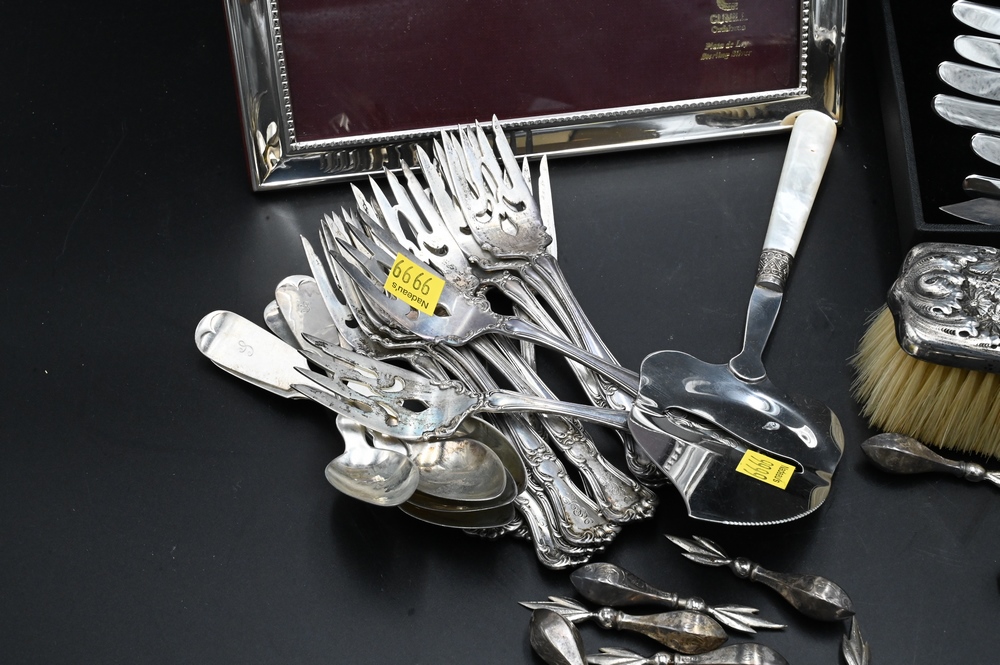 Lot 276: Sterling Silver Lot, to include frames, Tiffany repousse brush and button hook, set of 12 Gorham forks, coin spoons, etc., weighable 21.8 t.oz. weighable.