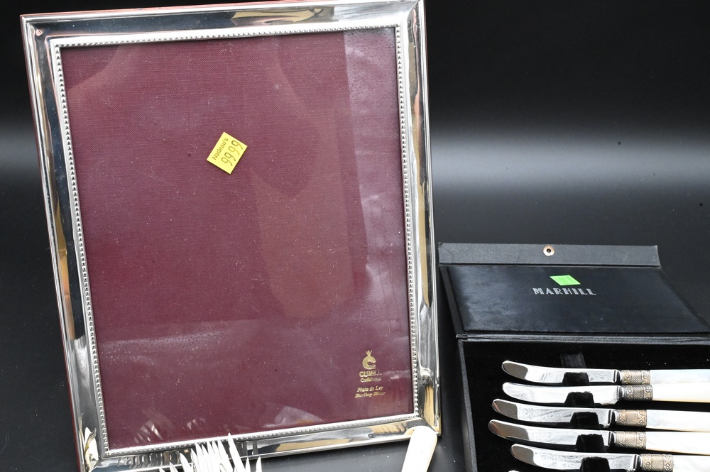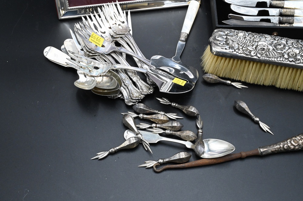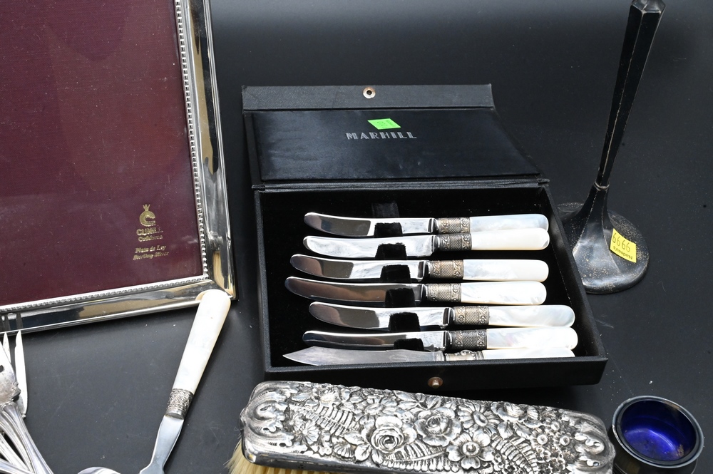 Sterling Silver Lot, to include frames, Tiffany repousse brush and button hook, set of 12 Gorham forks, coin spoons, etc., weighable 21.8 t.oz. weighable.