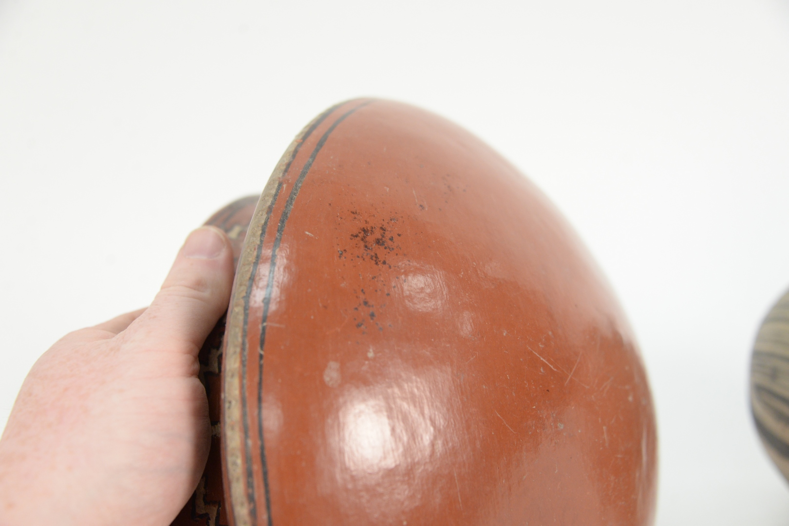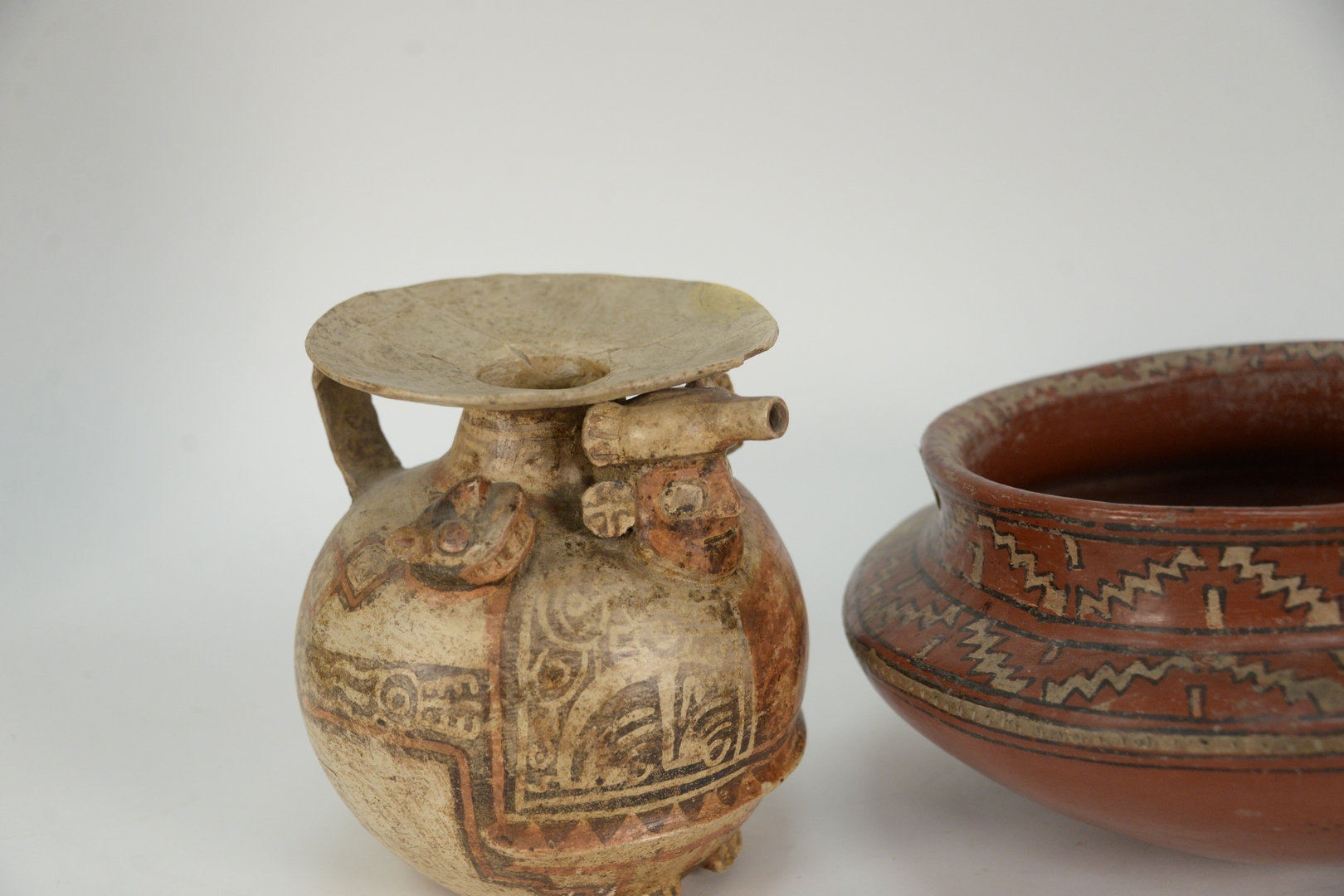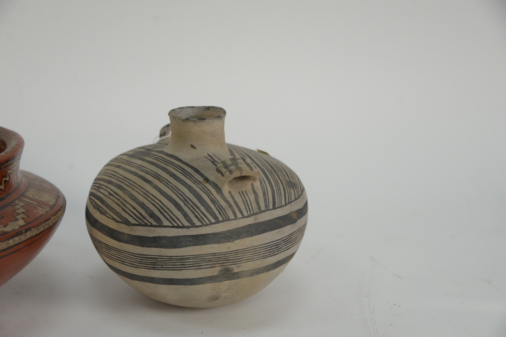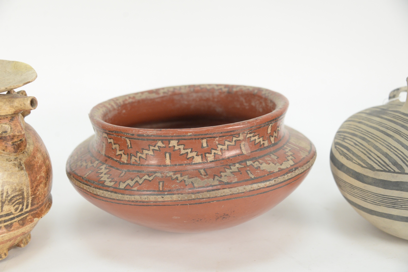 Lot 276: Three Painted Vessels, to include polychrome pottery bowl having geometric design black and white painted vessel with two handles, height 7 1/2 inches along with a figural pot with flared rim and polychrome sides.