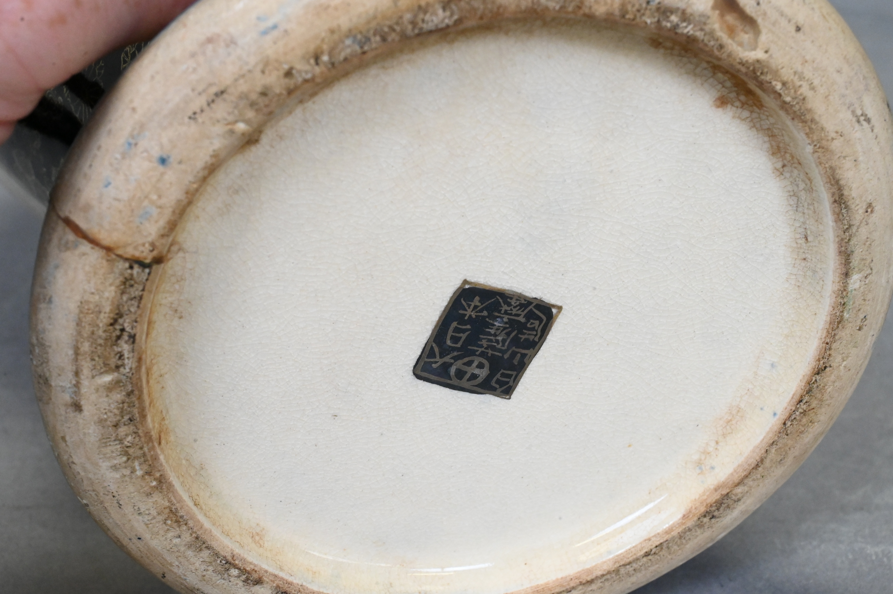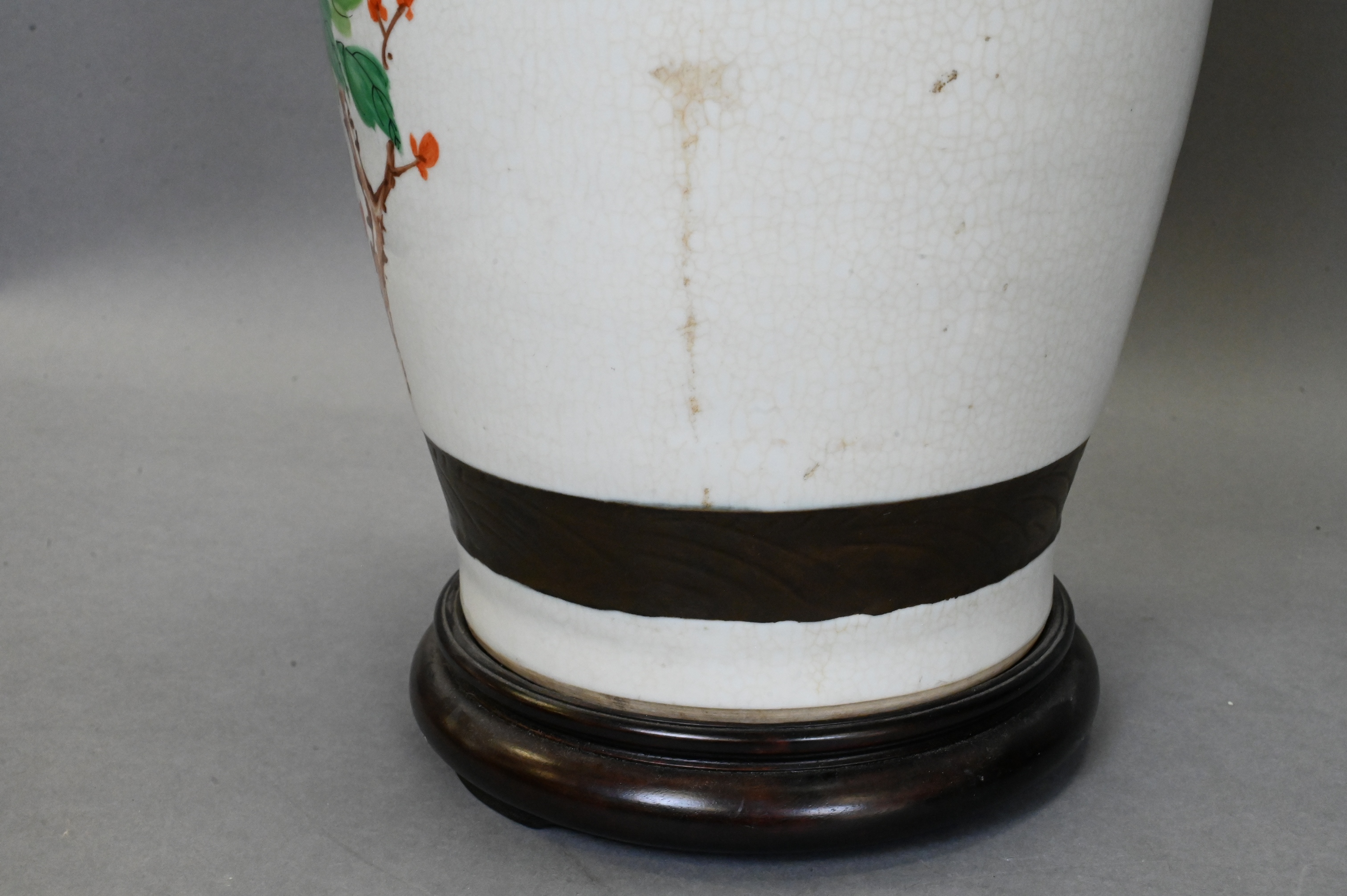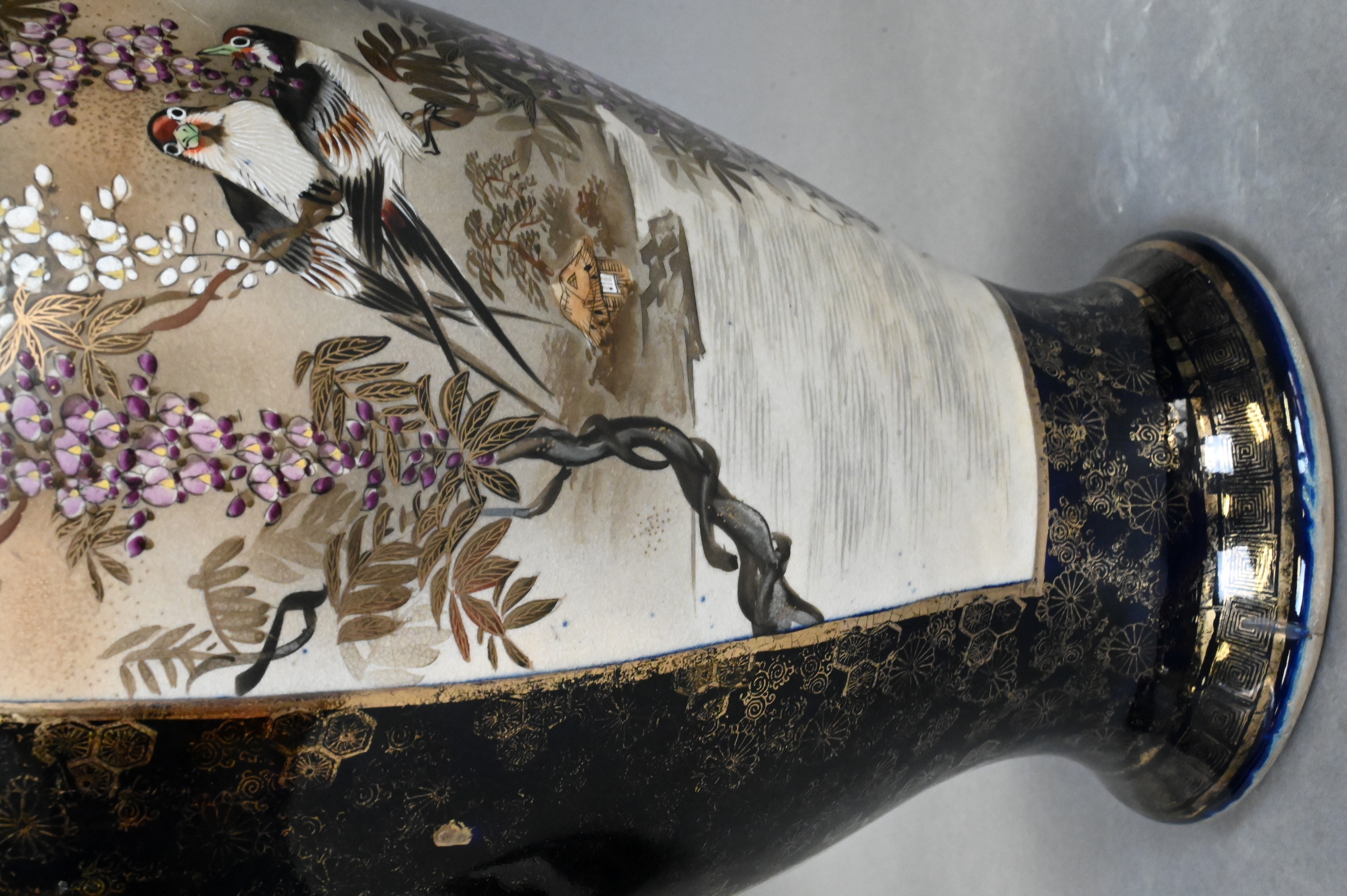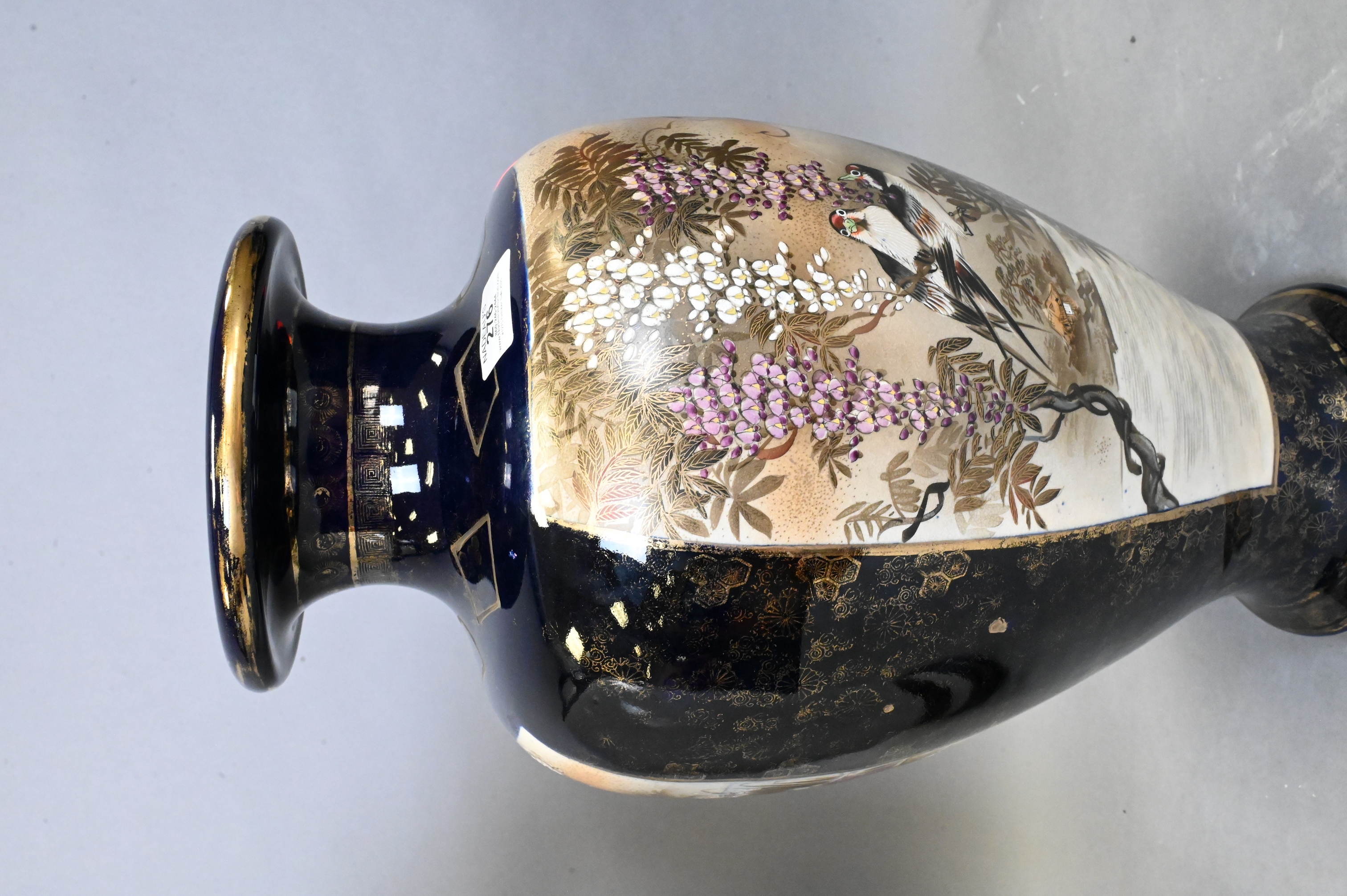 cobalt blue and gilt vase with Geishas in a garden courtyard motif, height 18 inches, along with floral vase with birds and tree branch, metal mounts, height 22 inches