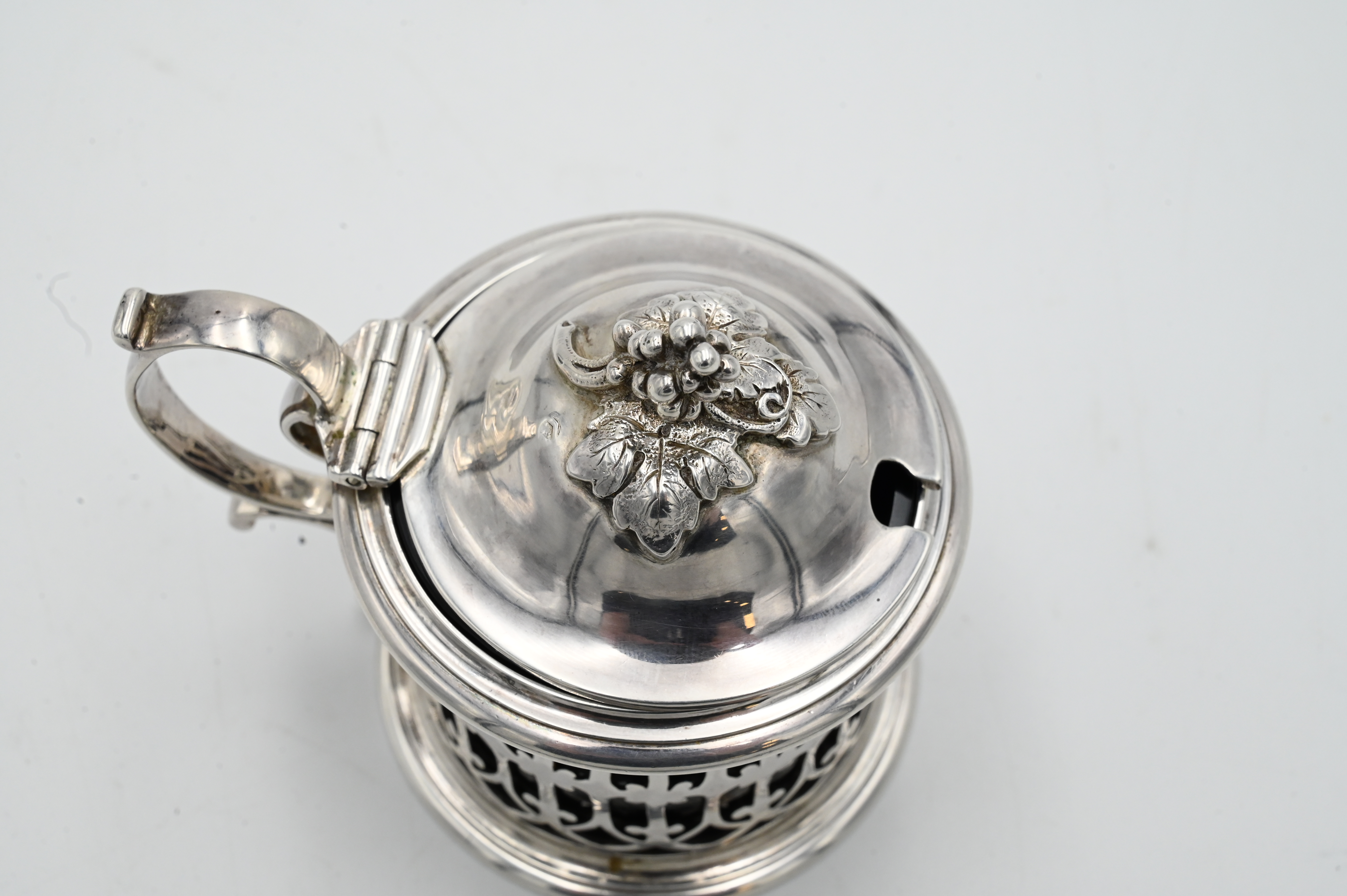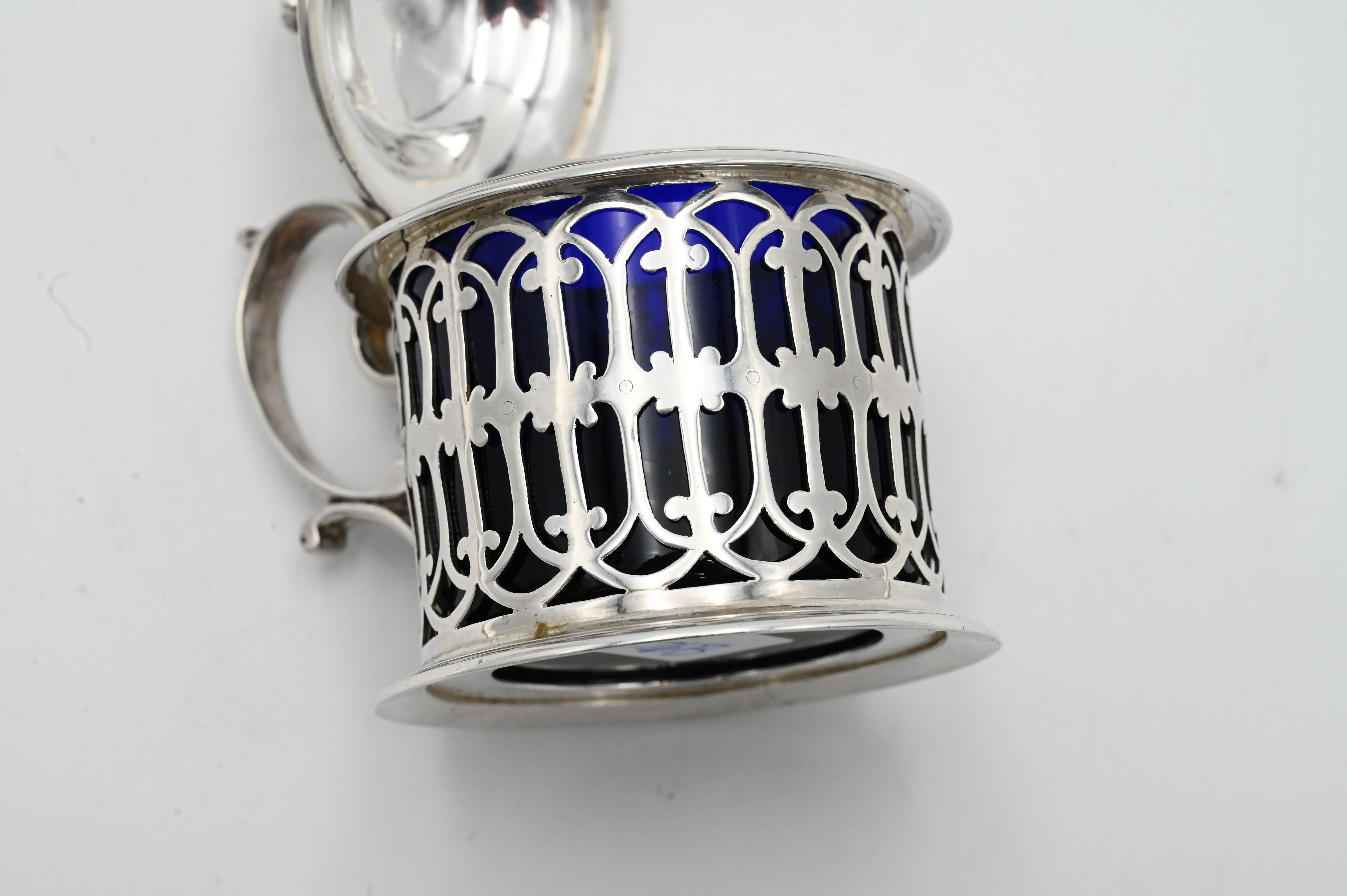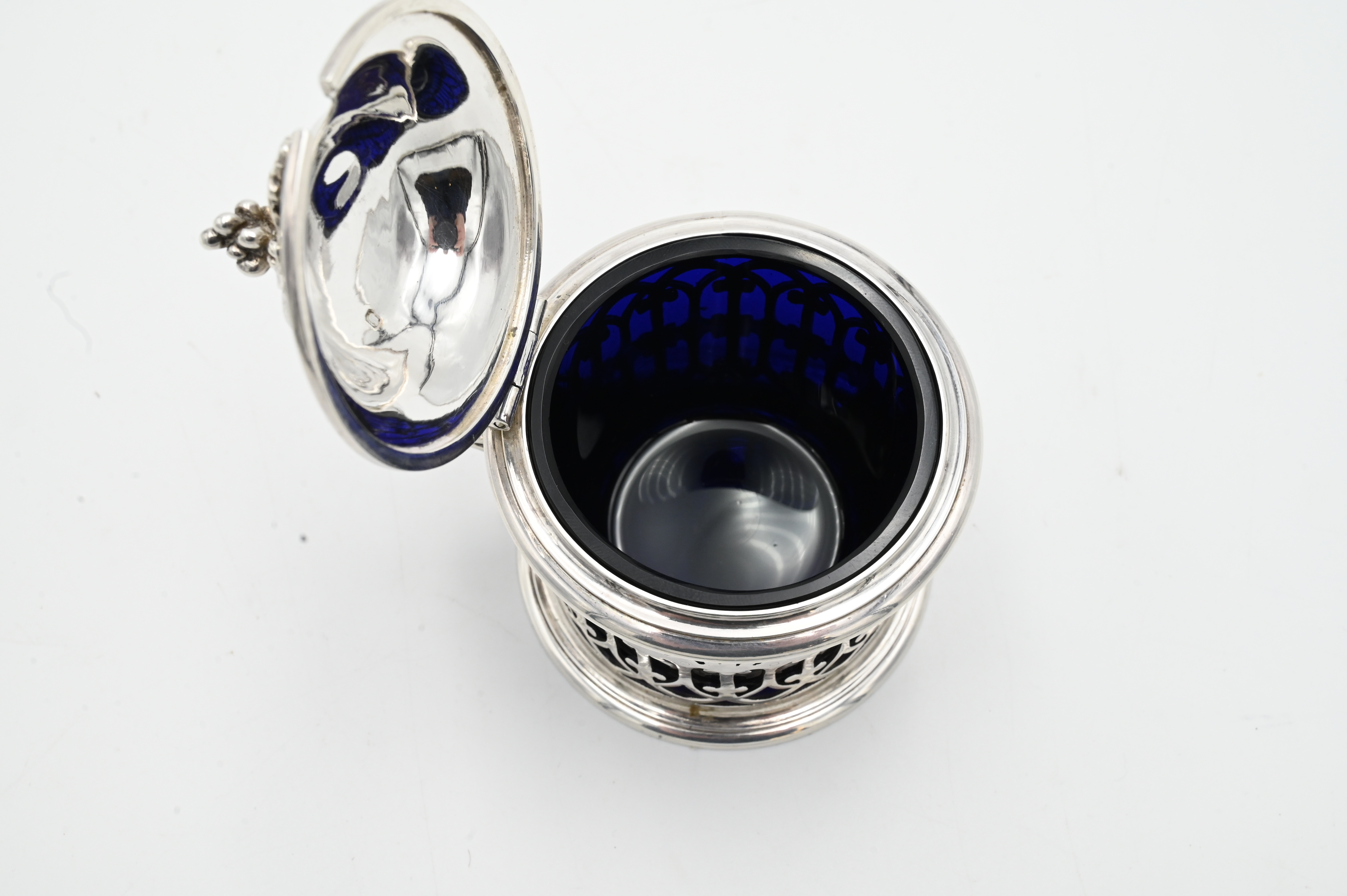 Silver Mustard Pot, having cobalt glass liner, marked “Janisset J. Chaise”