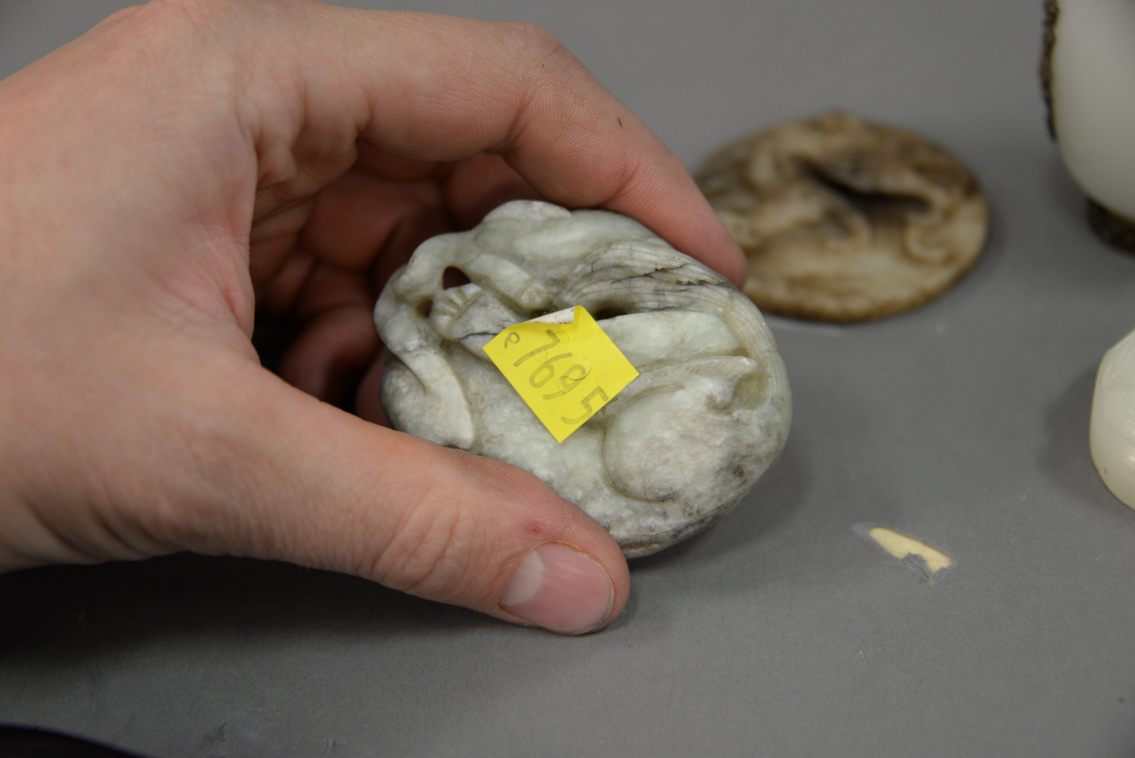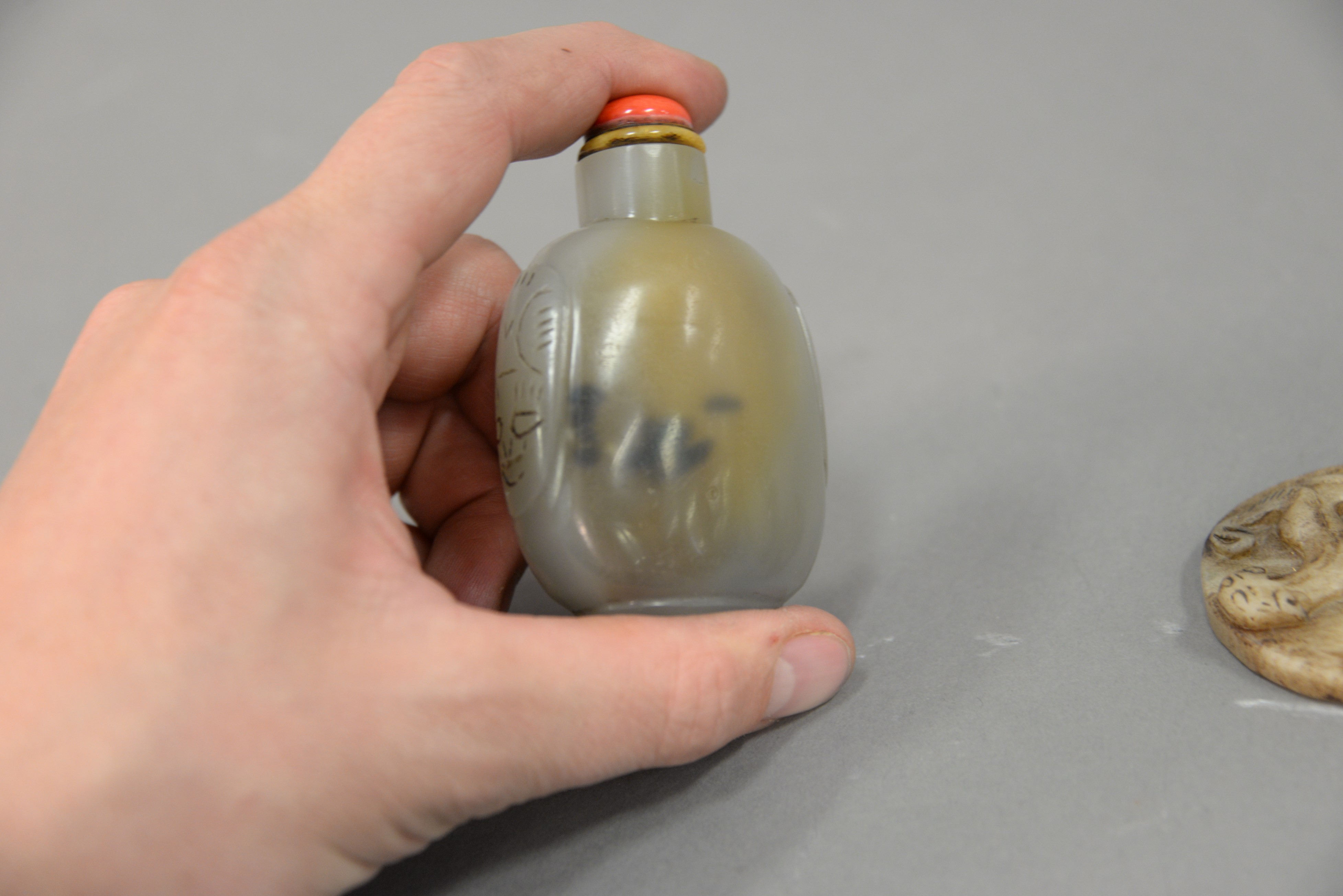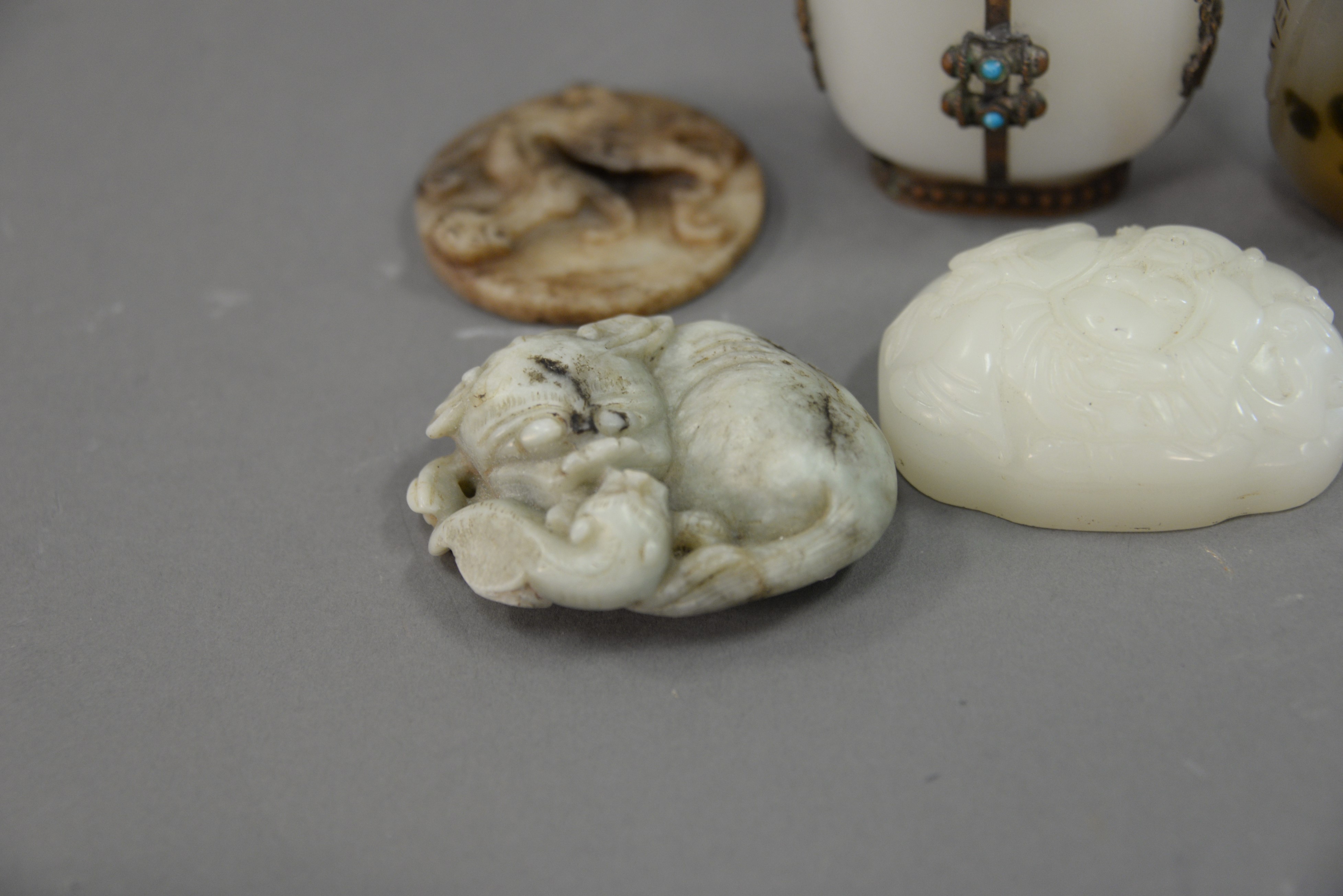 Lot 277: Five Chinese hardstone pieces to include snuff bottle with metal mounts, Agate carved snuff bottle, jade paperweight, and two hardst…