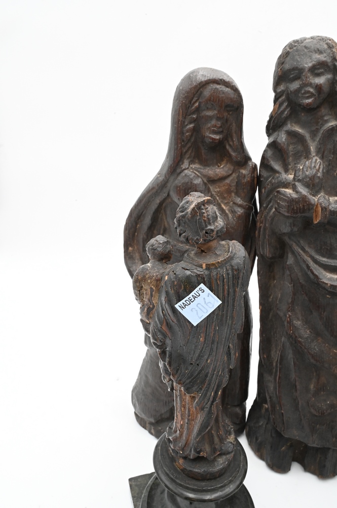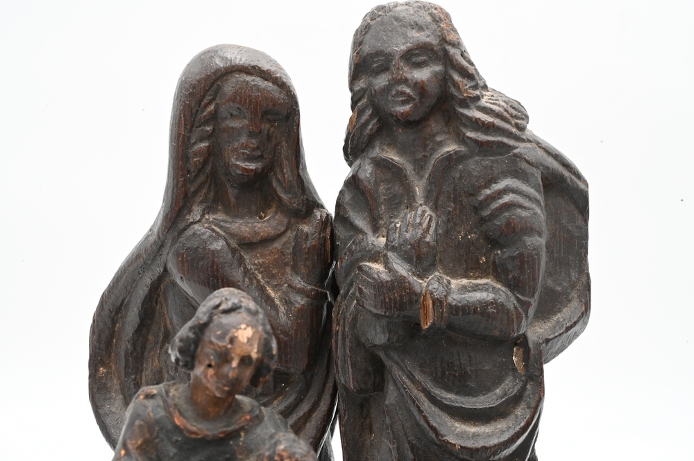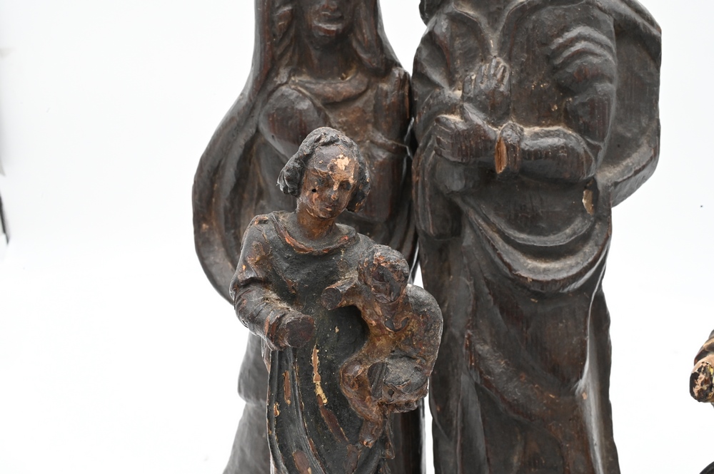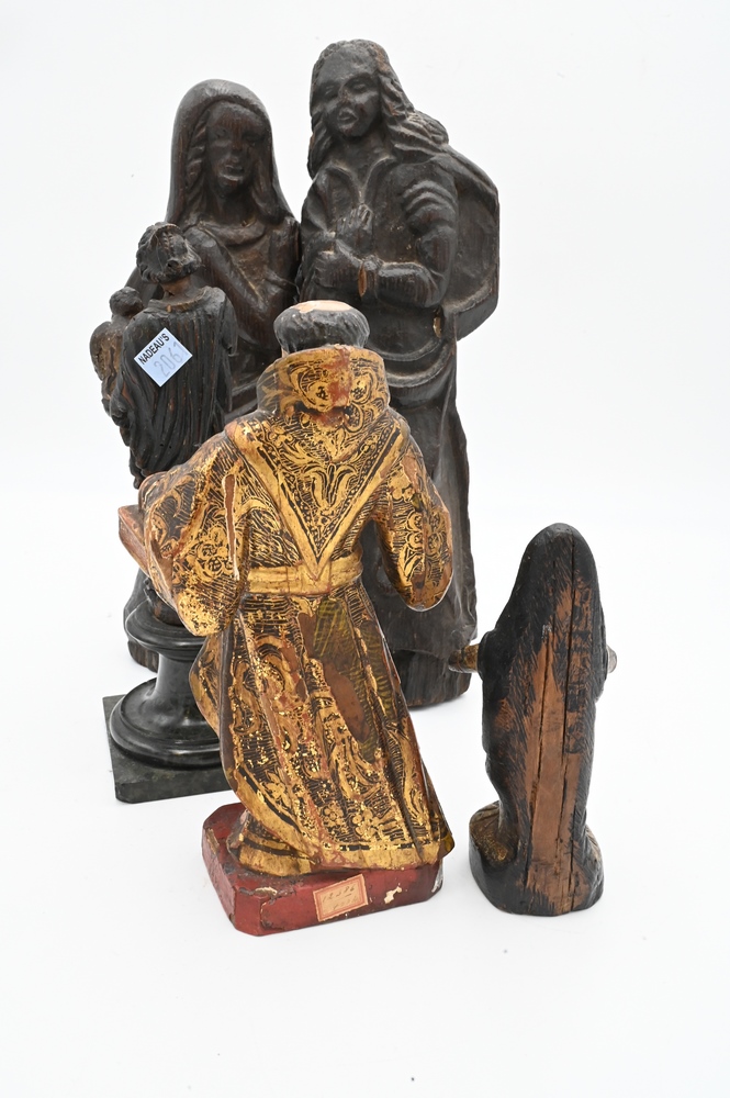 Lot 277: Five Piece Lot of Carved and Polychrome Figures, to include carved Madonna and child figure, figure height 7 inches, Madonna standing in a robe painted in green, red and gold, on granite base, 15th/16th century; a smaller carved figure of woman holding her hands out, height 6 inches; a carved Spanish Colonial gilt and polychrome Santos’ figure of St. Francis depicted in a standing position wearing a gilt gold and black robe holding a closed book; along with two carved oak figures, 16th century or later, heights 9, 13 and 13 3/4 inches.