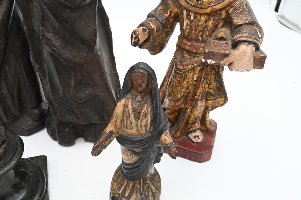 Five Piece Lot of Carved and Polychrome Figures, to include carved Madonna and child figure, figure height 7 inches, Madonna standing in a robe painted in green, red and gold, on granite base, 15th/16th century; a smaller carved figure of woman holding her hands out, height 6 inches; a carved Spanish Colonial gilt and polychrome Santos’ figure of St. Francis depicted in a standing position wearing a gilt gold and black robe holding a closed book; along with two carved oak figures, 16th century or later, heights 9, 13 and 13 3/4 inches.