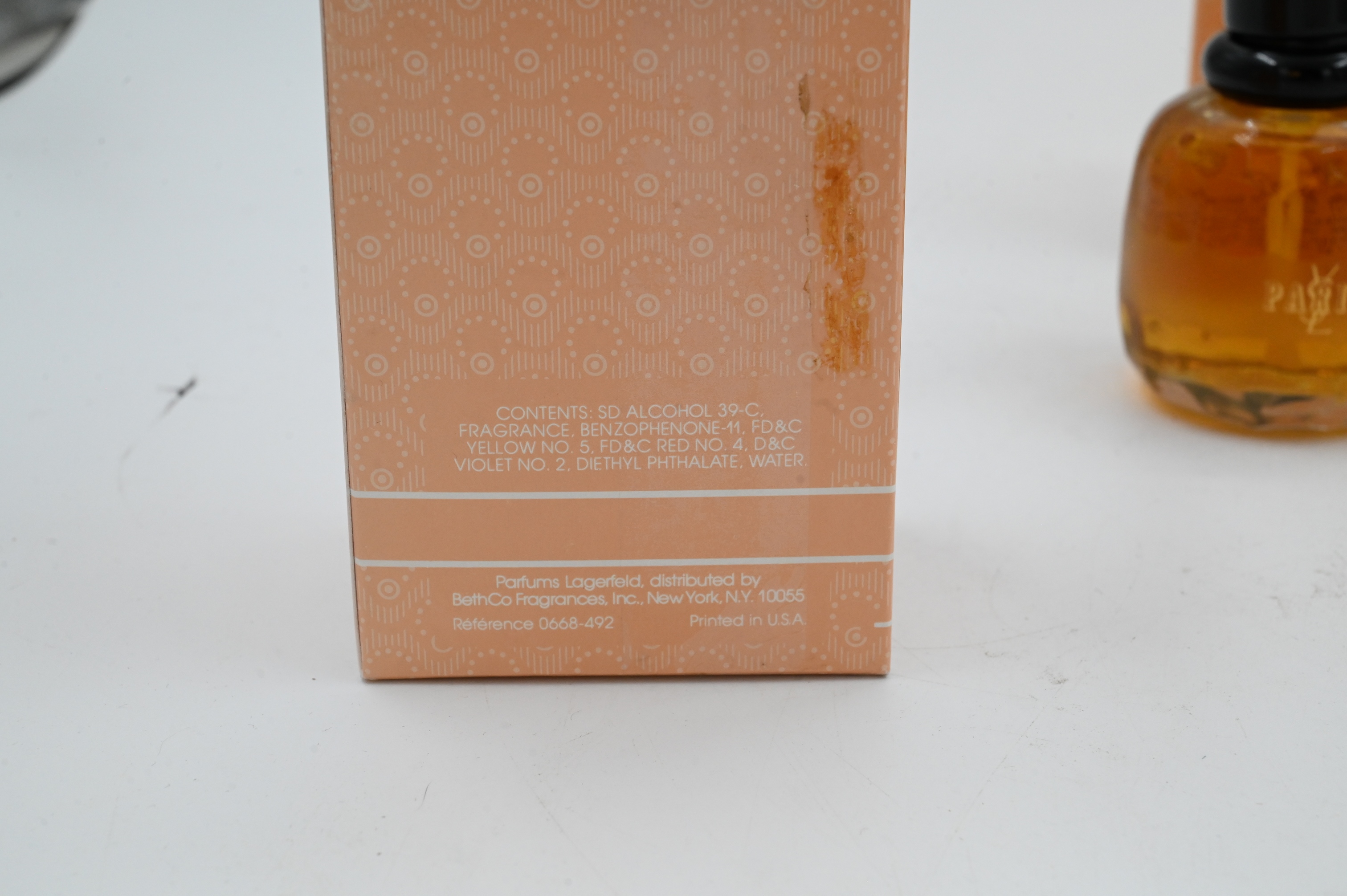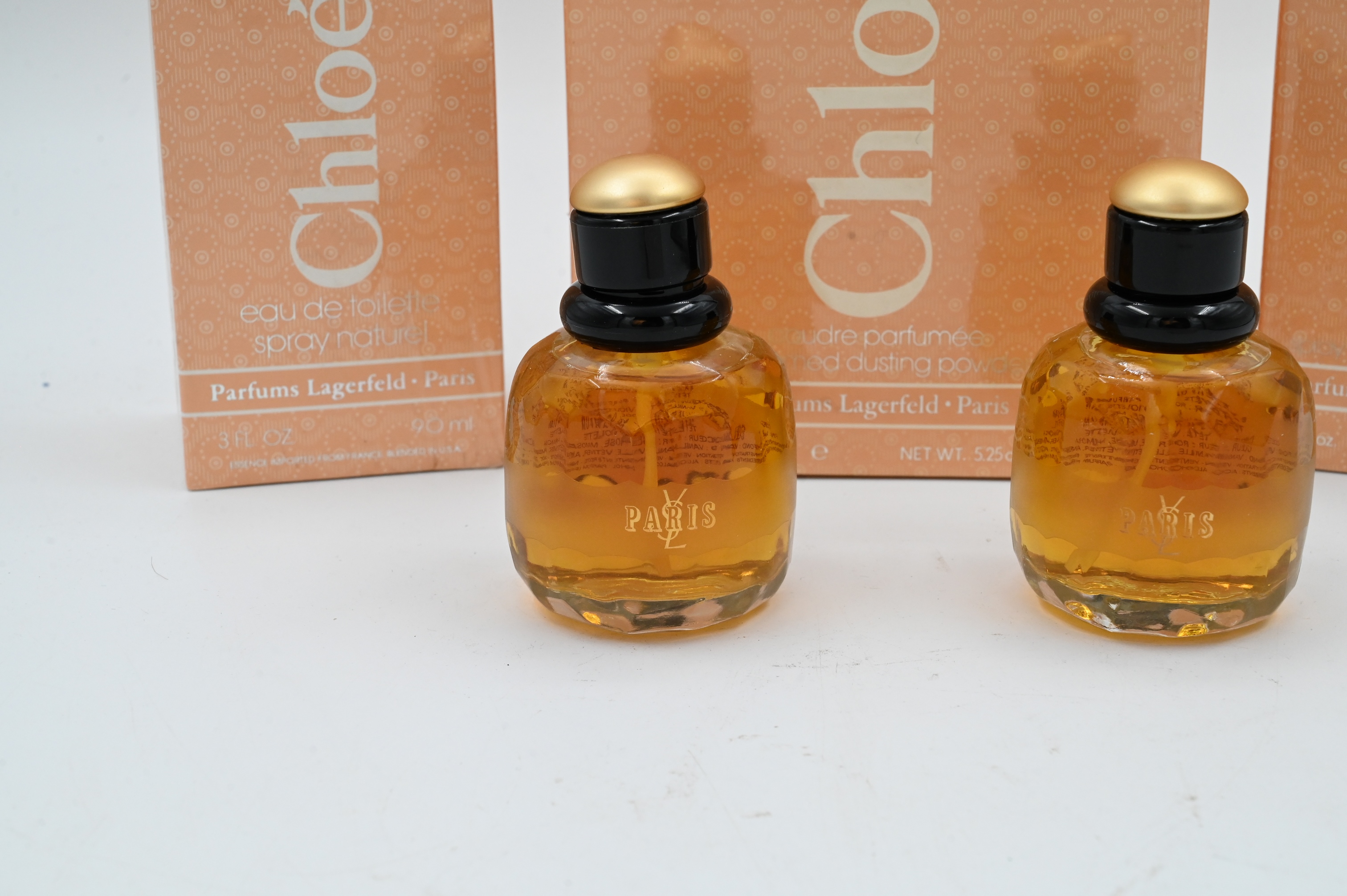 to include two Val St. Laurent Parfums in original boxes, three Chloe one perfumed dusting powder, two eau de toilette spray natural 2025 2311 imprinted on boxes