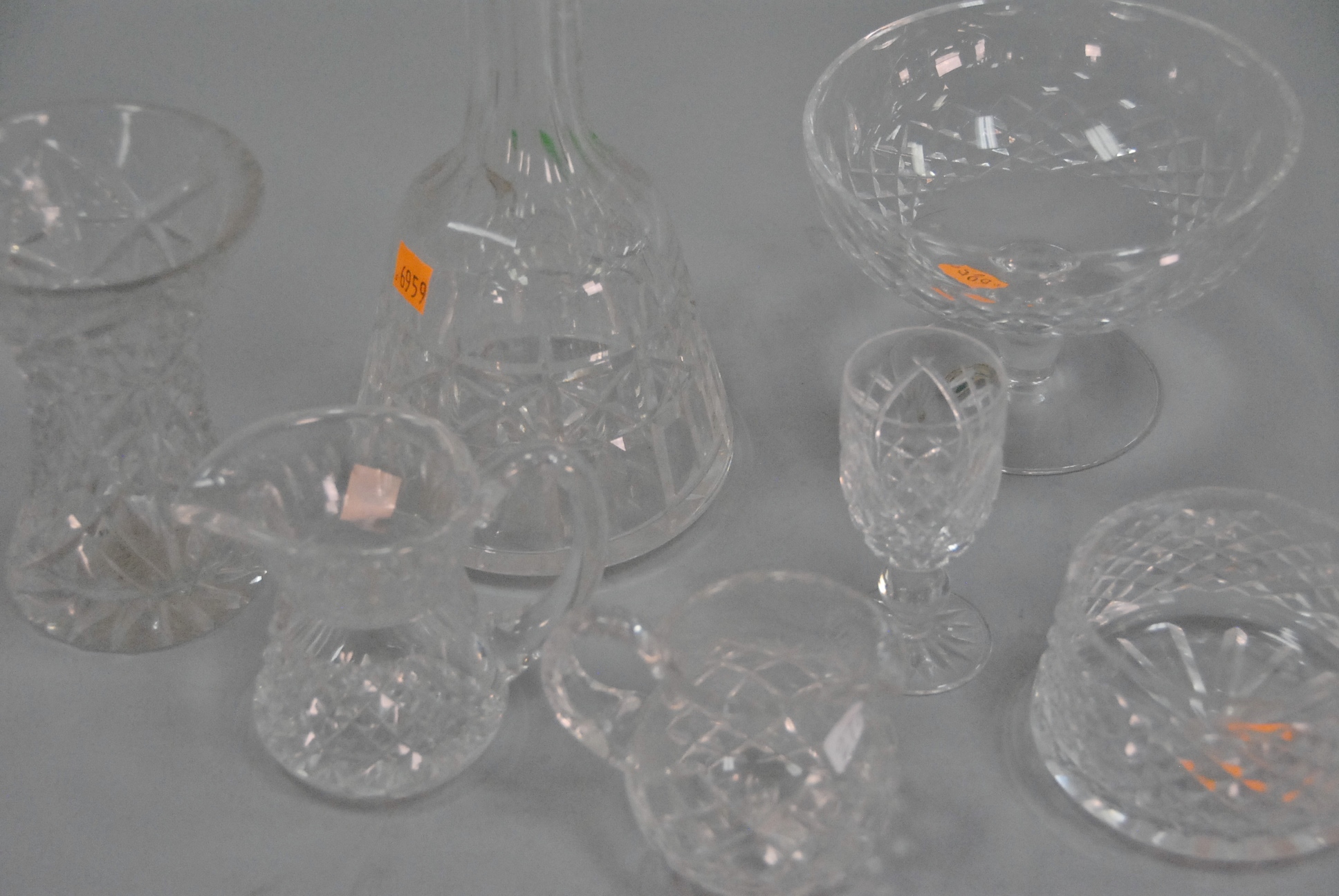 Lot 277: Group of seven pieces of Waterford to include decanter, two small creamers, compote, vase, stemmed glass, and bowl.