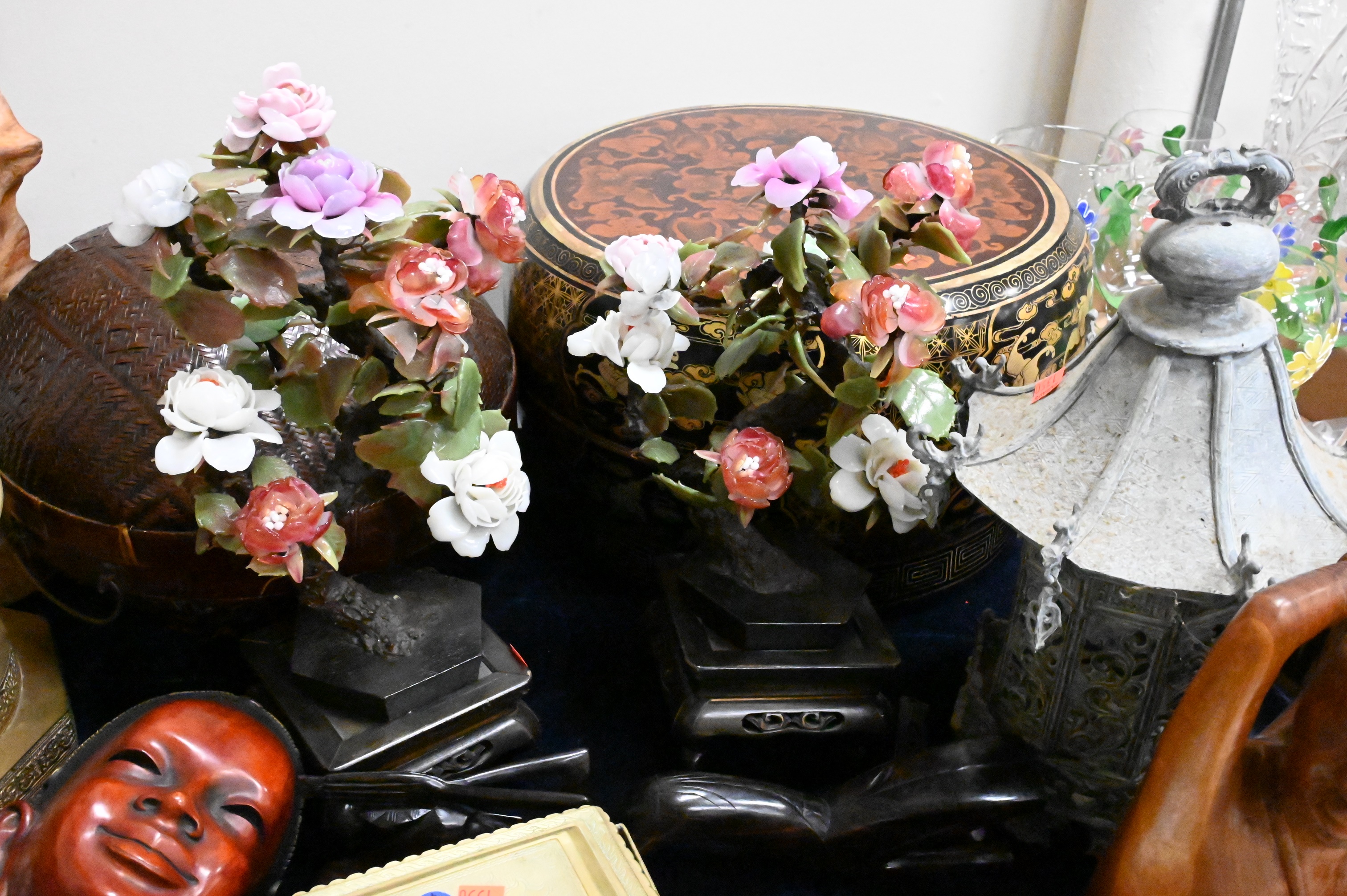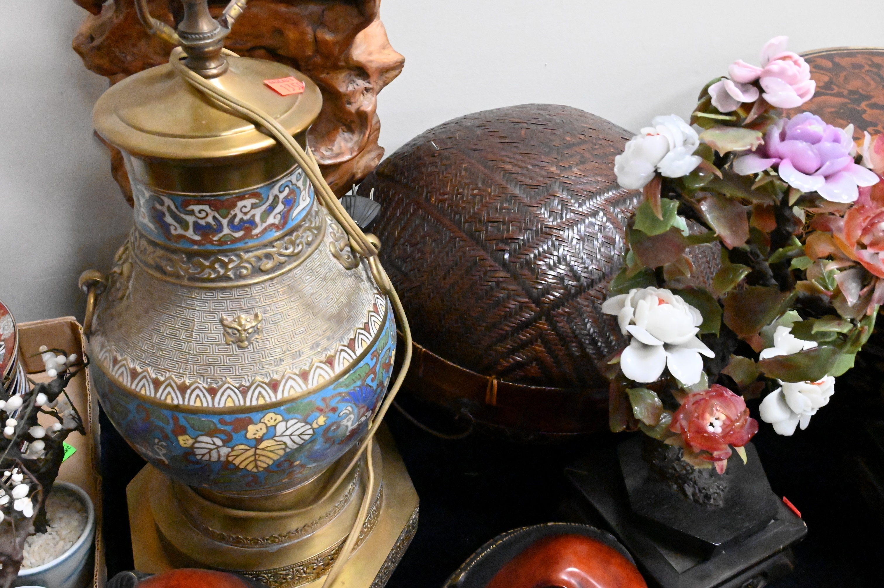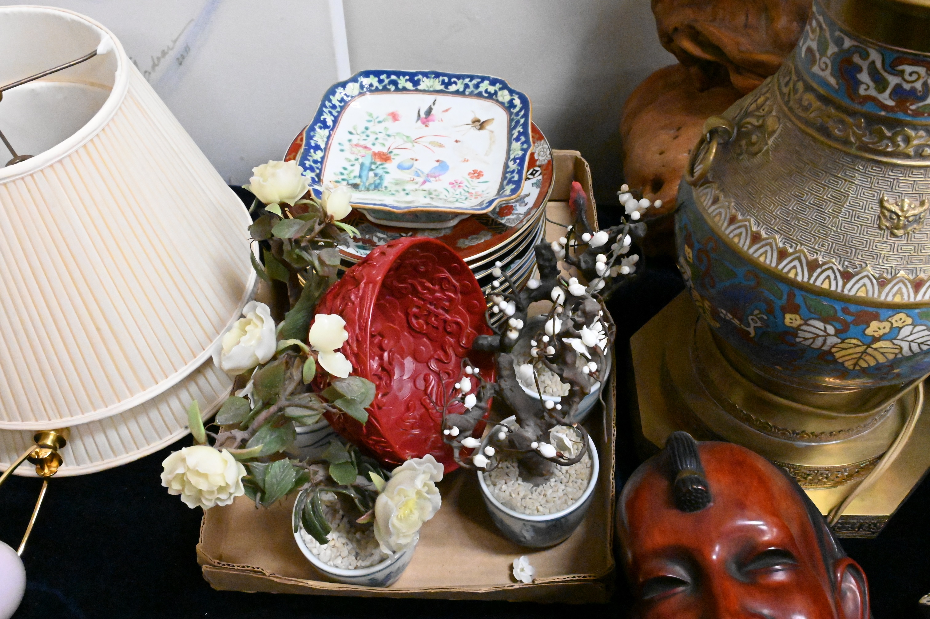 Large Group of Chinese and Asian, to include a Champleve vase, two boxes, stone flowering tree, figures, brass box, burlwood sculpture, set of plates, Chinese dish, etc. Provenance: Property from a private New York collection sold to benefit charitable foundations.