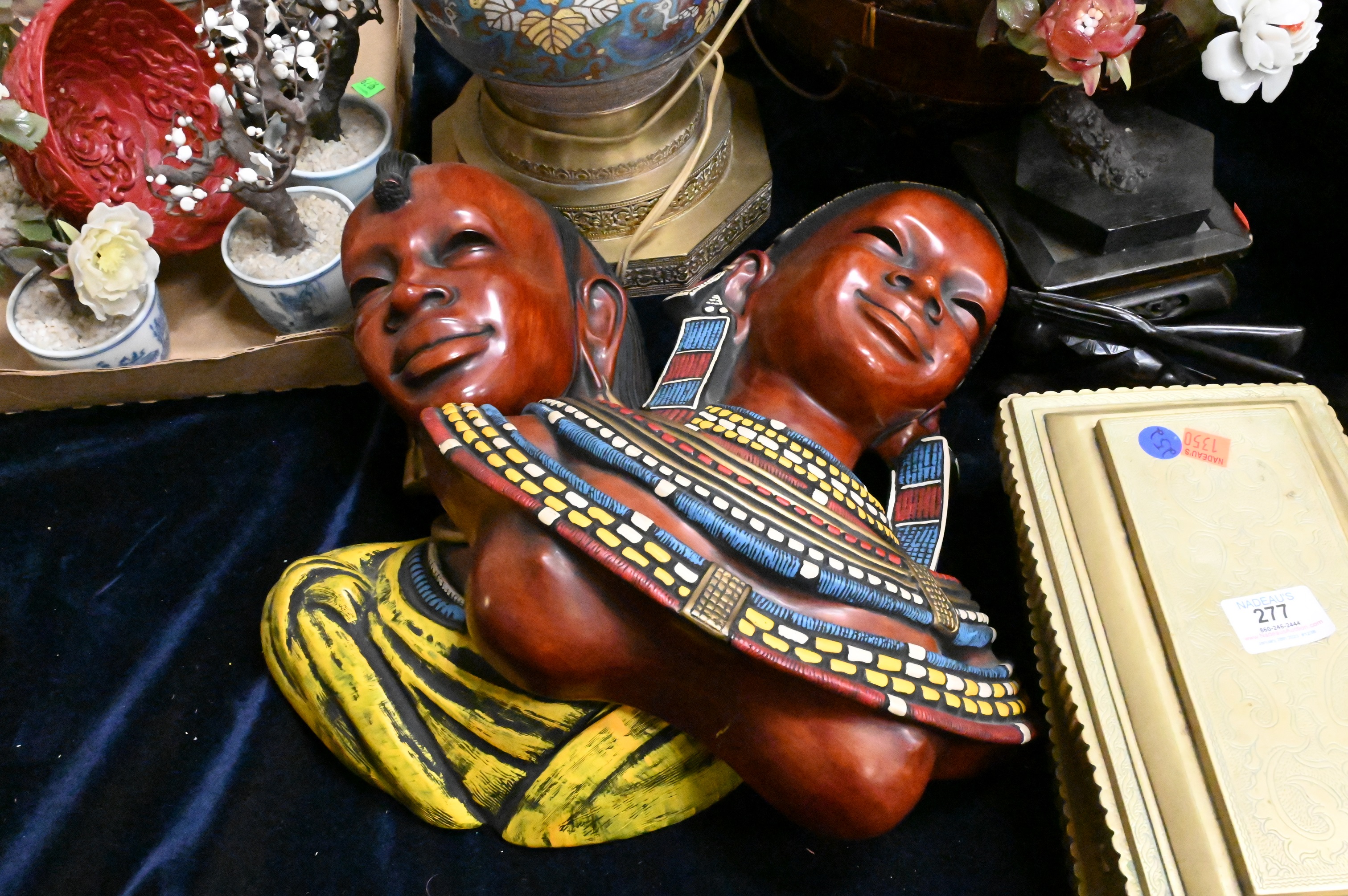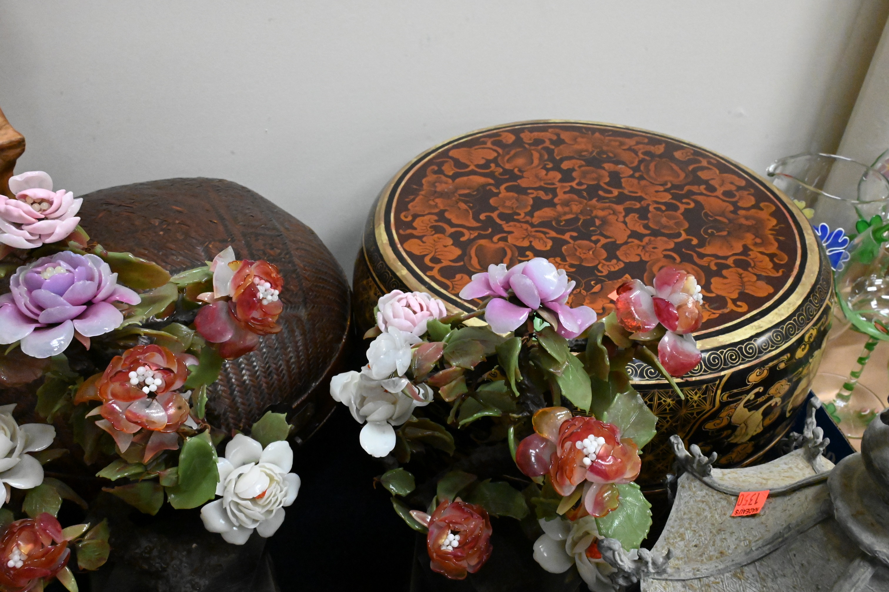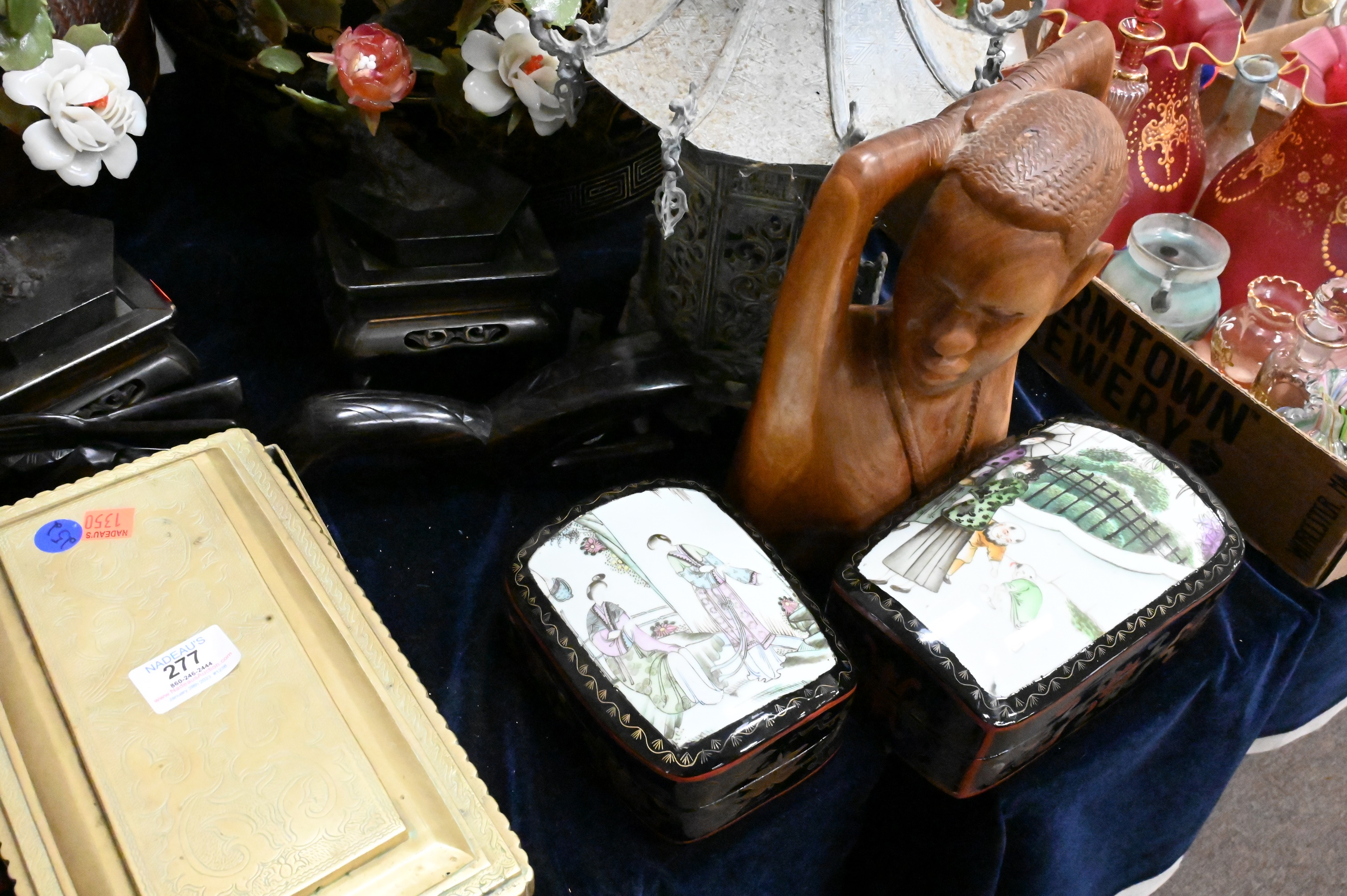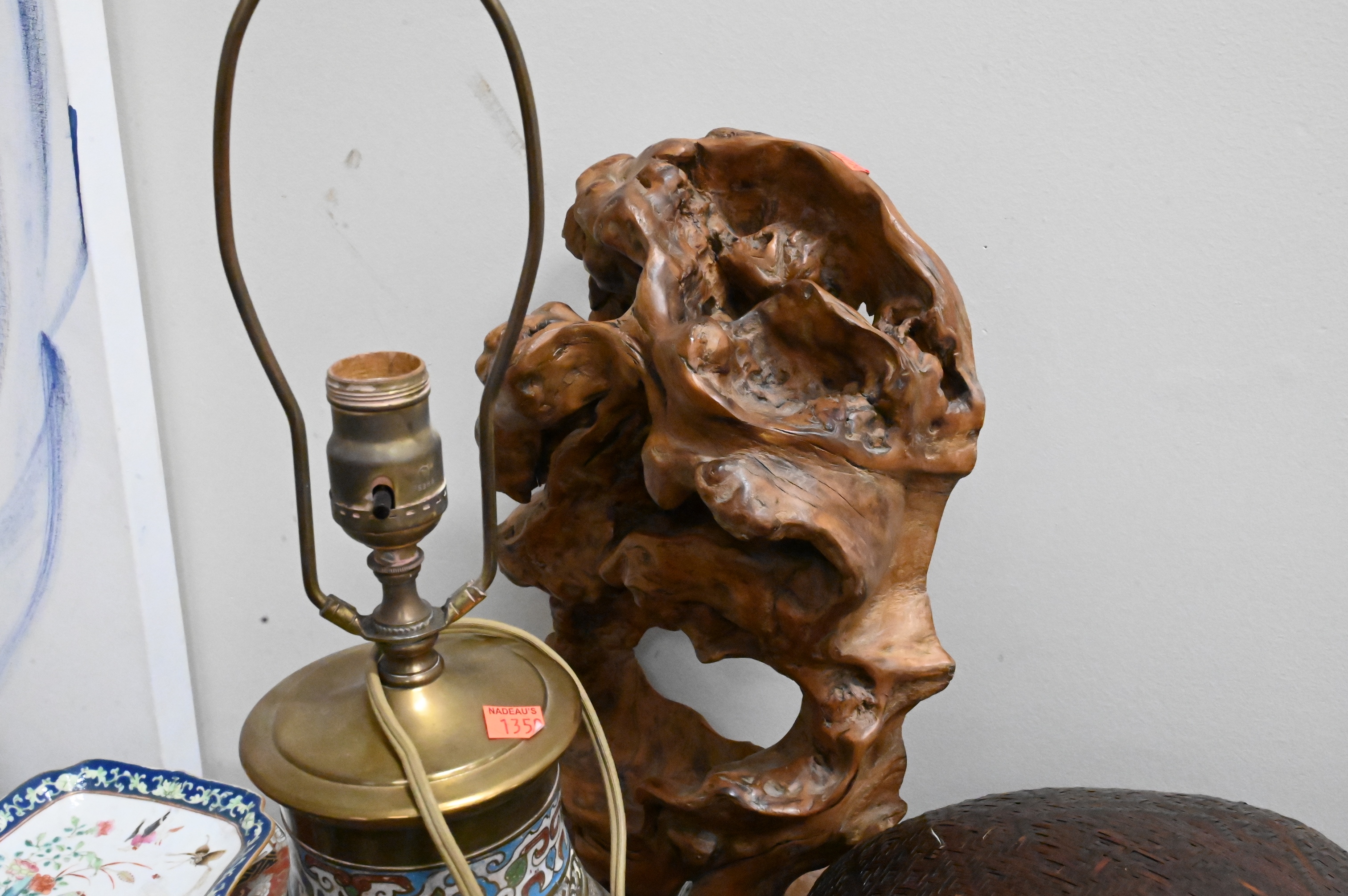 Large Group of Chinese and Asian, to include a Champleve vase, two boxes, stone flowering tree, figures, brass box, burlwood sculpture, set of plates, Chinese dish, etc. Provenance: Property from a private New York collection sold to benefit charitable foundations.