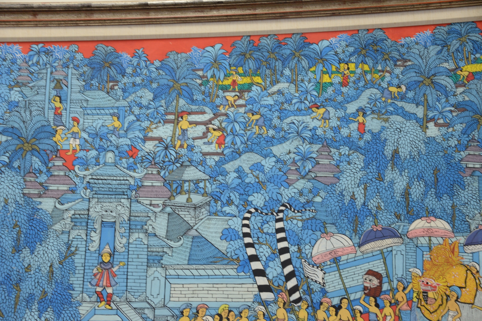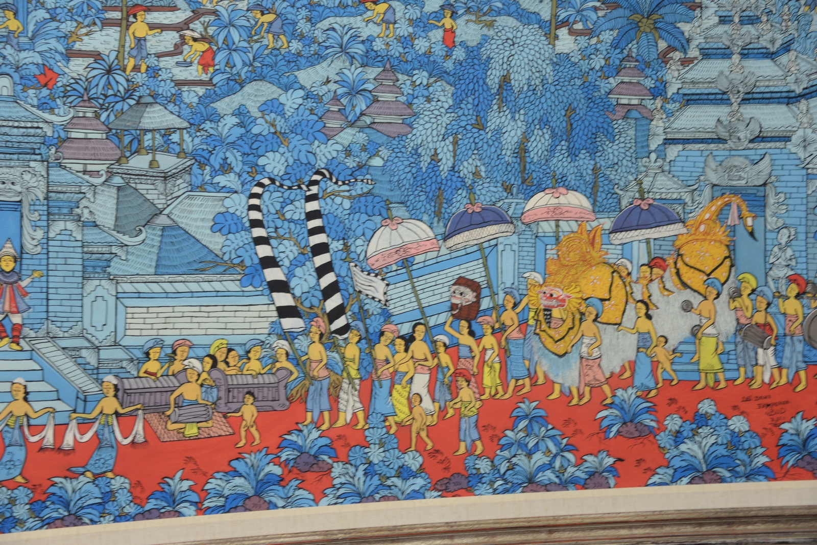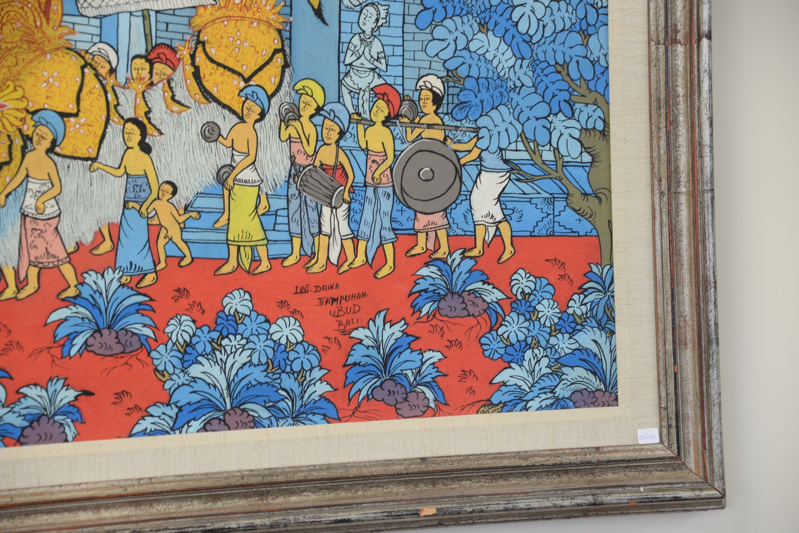 Lot 277: Oil on canvas Balinese landscape of Tjampuhan Valley, Ubud, Bali with a Nyepi Ogoh-Ogoh parade in foreground. 35 x 61