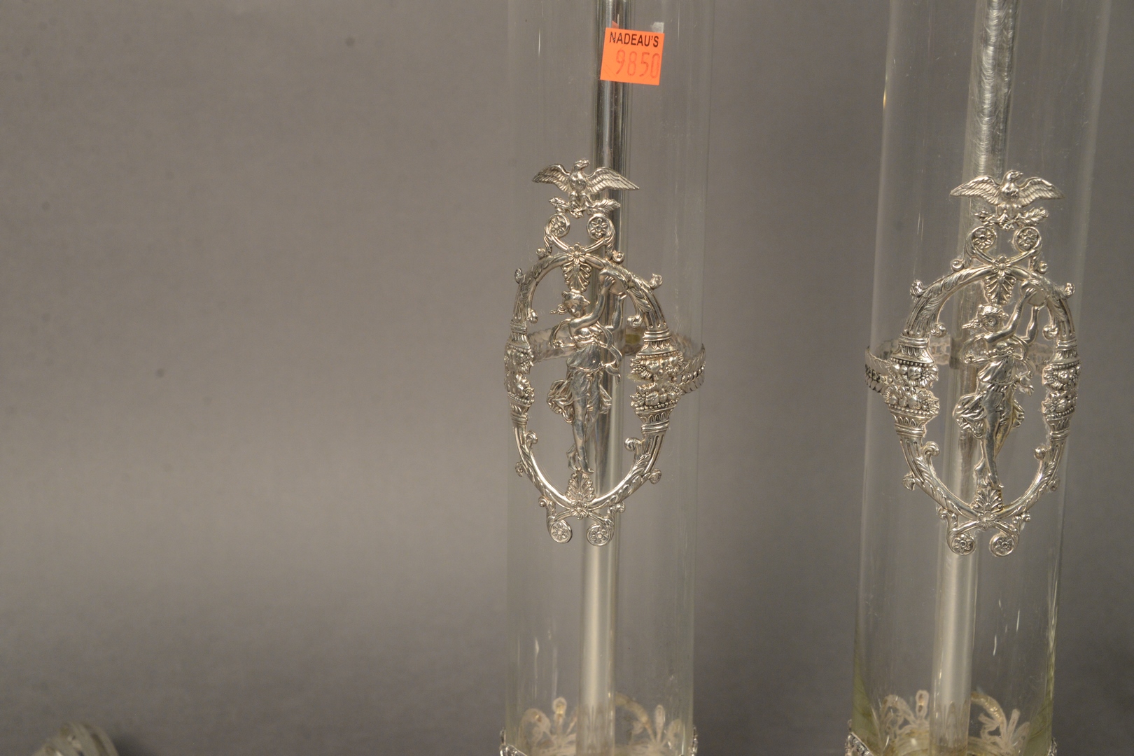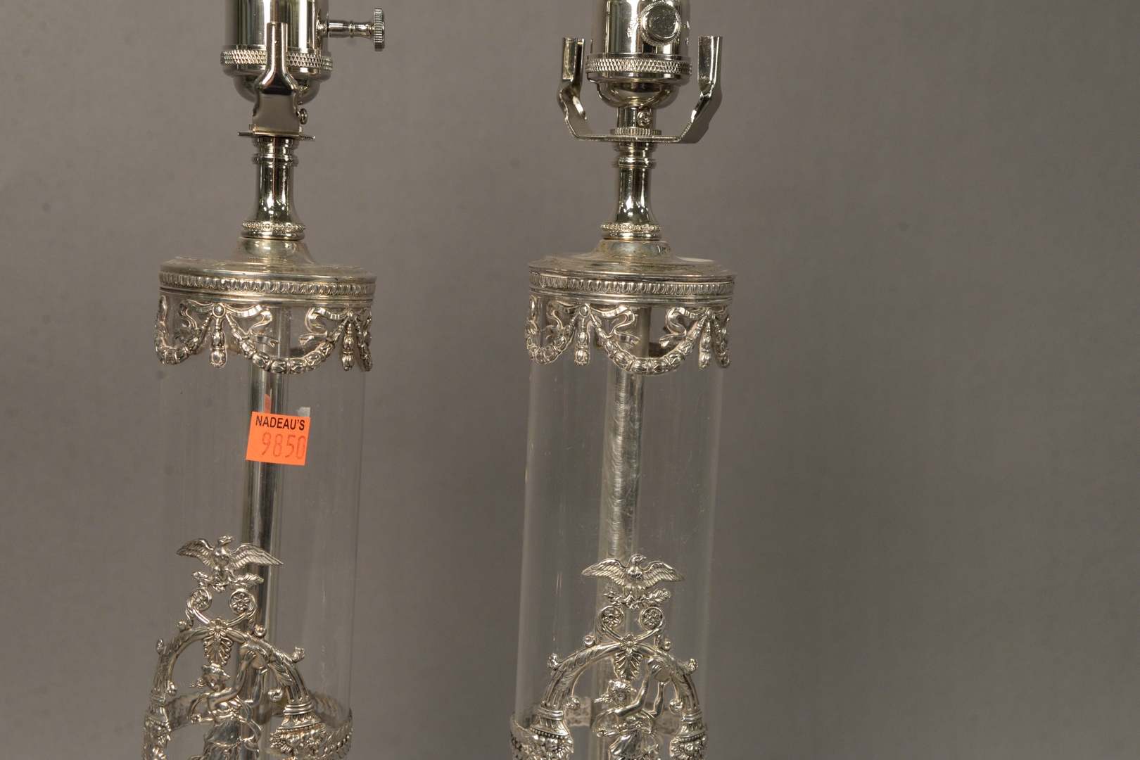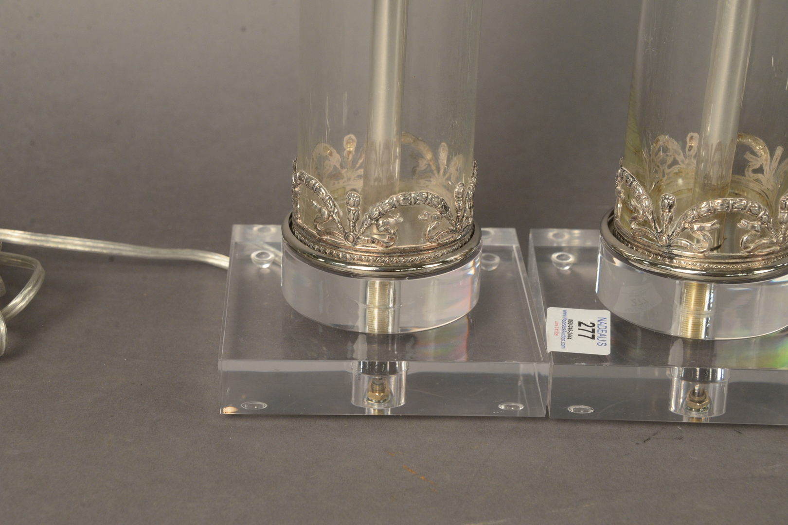 Lot 277: Pair of Silver Mounted Glass Table Lamps on Lucite bases, figural silver mount, height 20 1/2 inches.