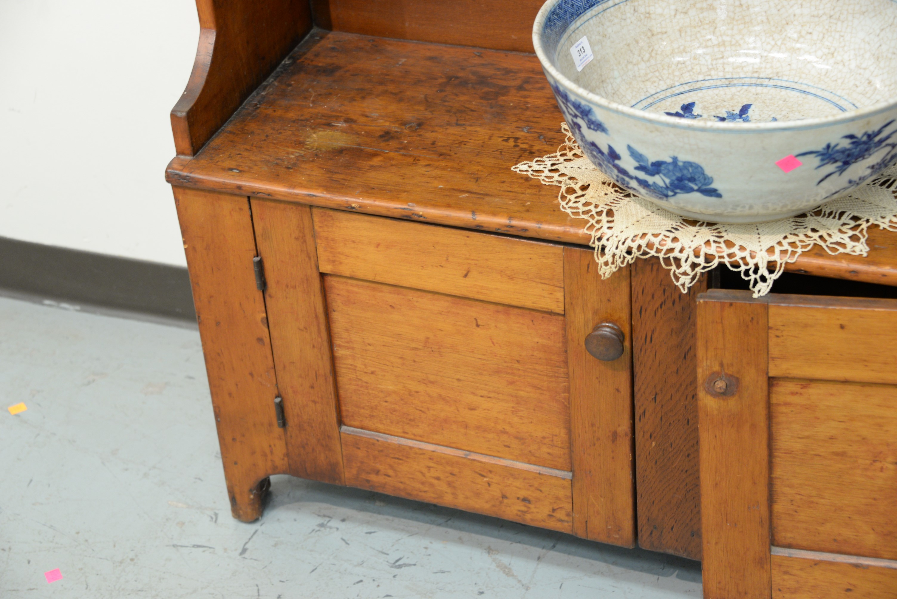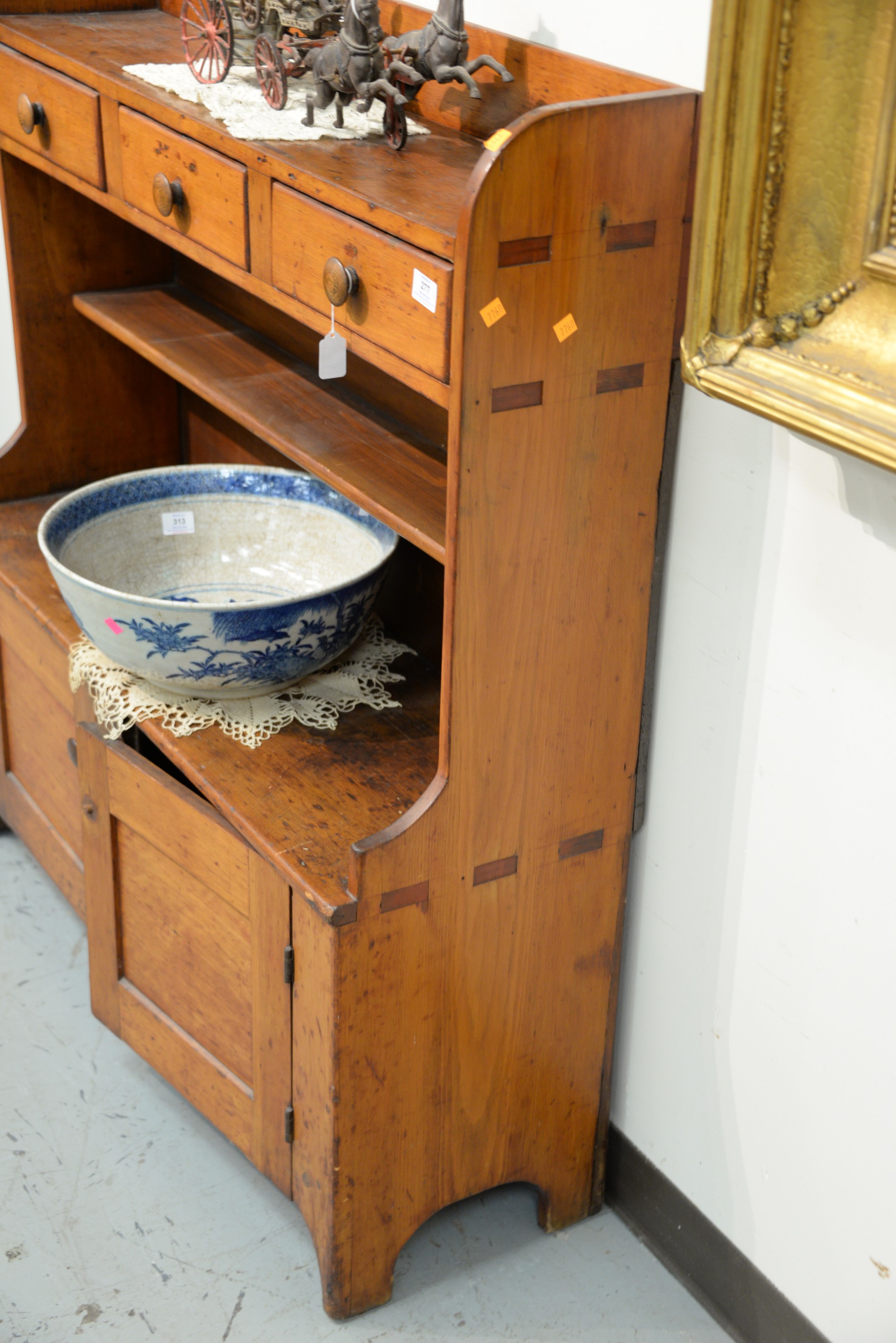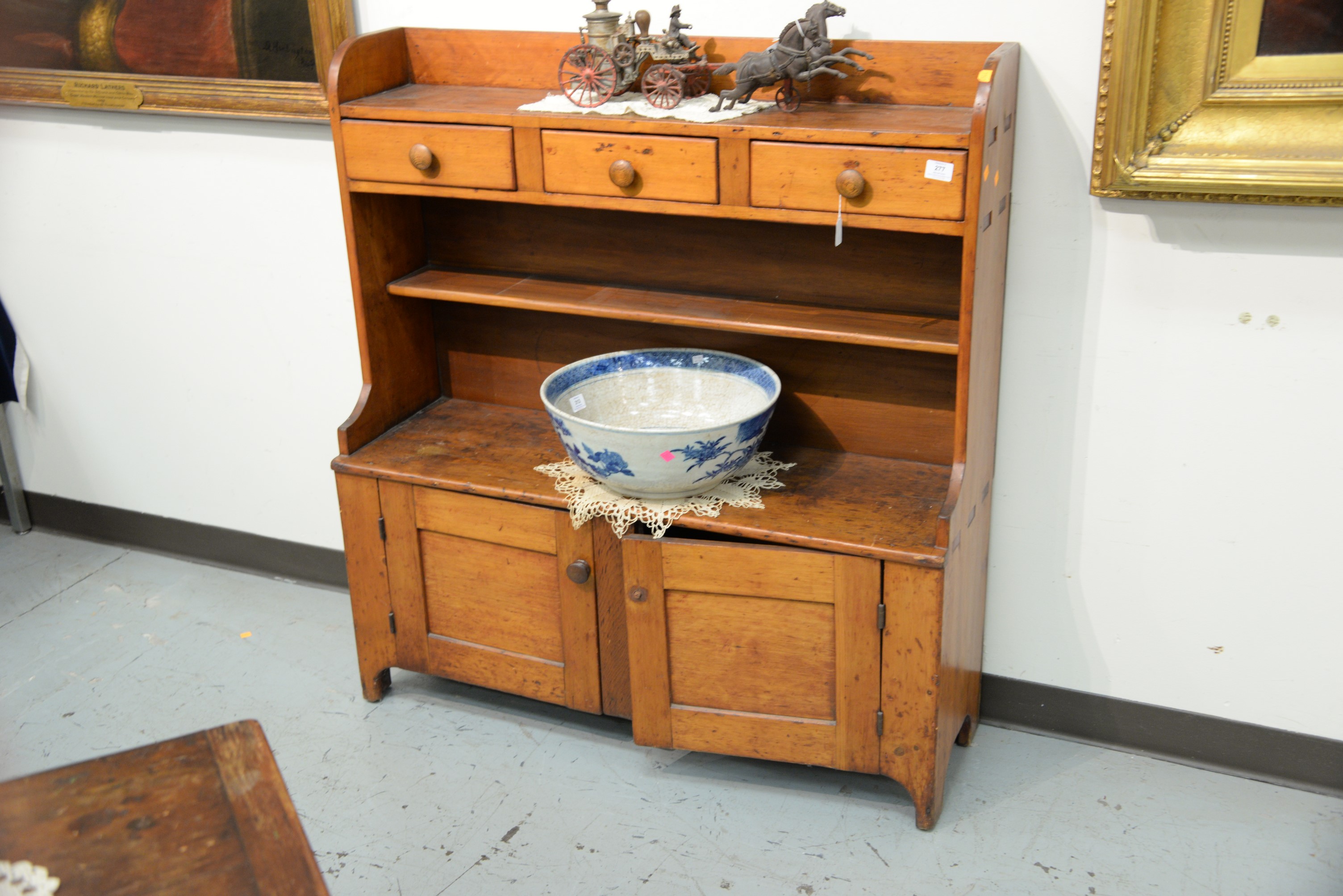 Lot 277: Primitive cupboard having top shelf over three drawers over shelves over two doors all set on boot jack ends. ht. 47 in. wd. 43…