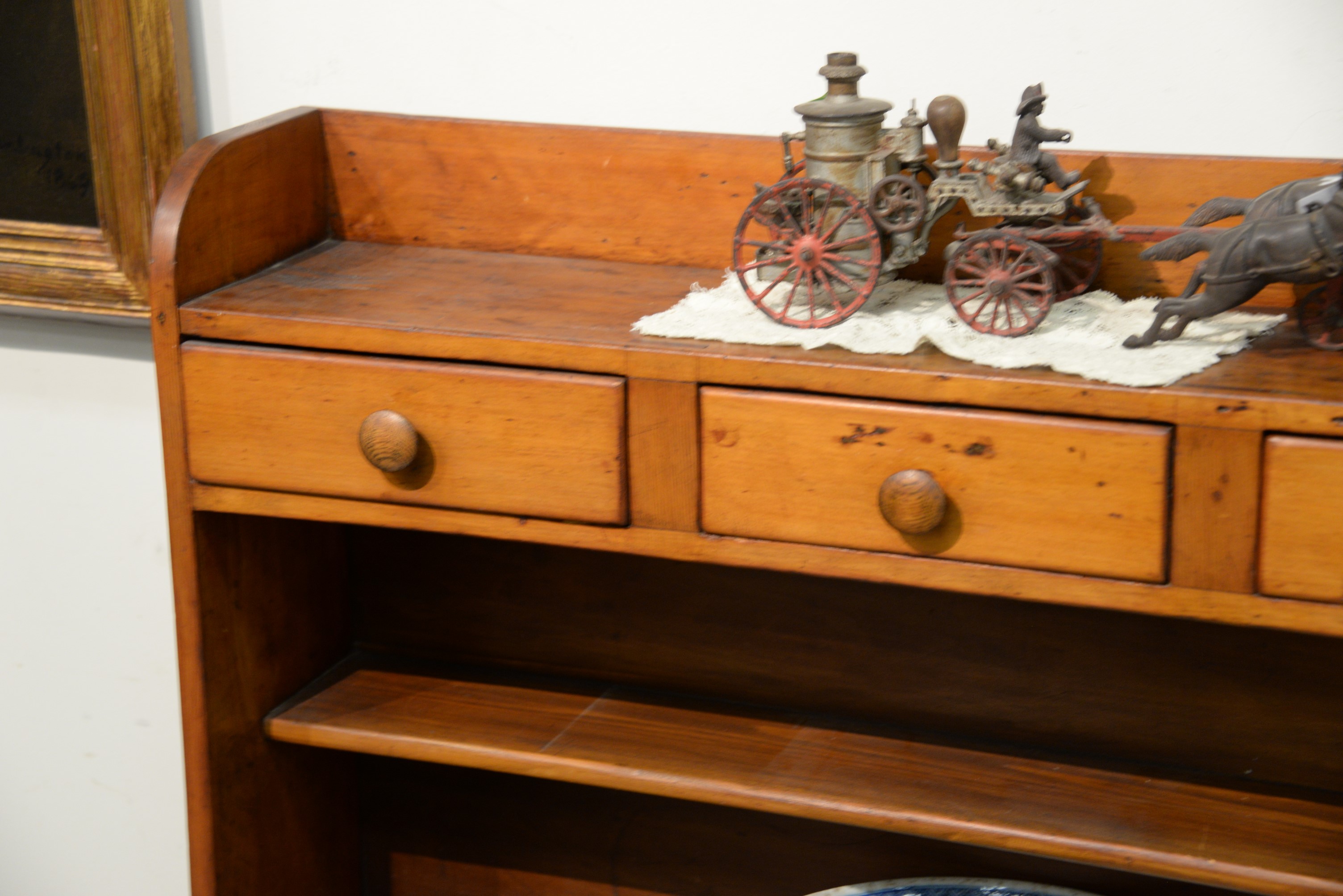 Primitive cupboard having top shelf over three drawers over shelves over two doors all set on boot jack ends. ht. 47 in. wd. 43 1/2 in. dp. 14 in. Provenance: The Estate of Natalie Rafferty