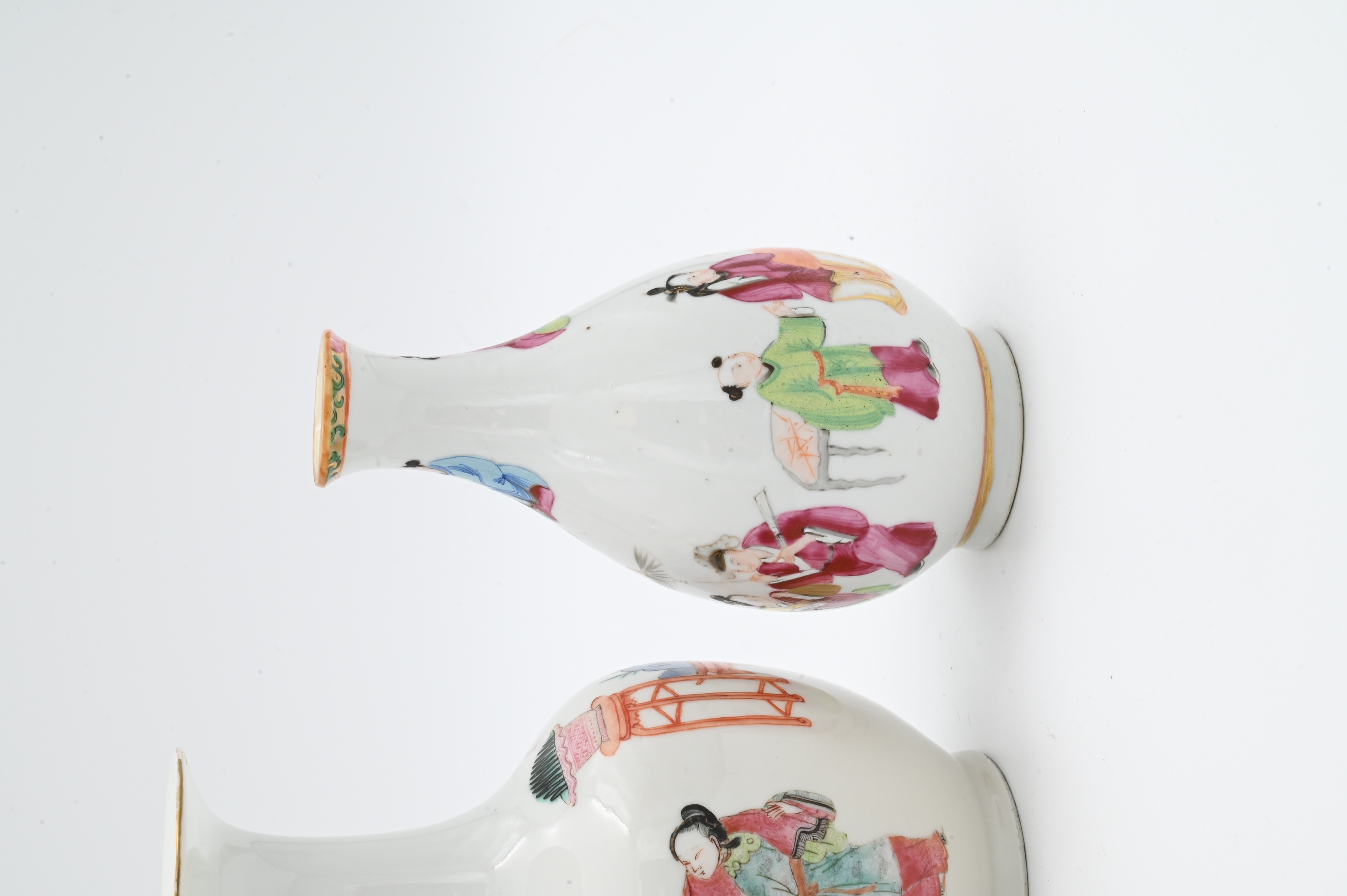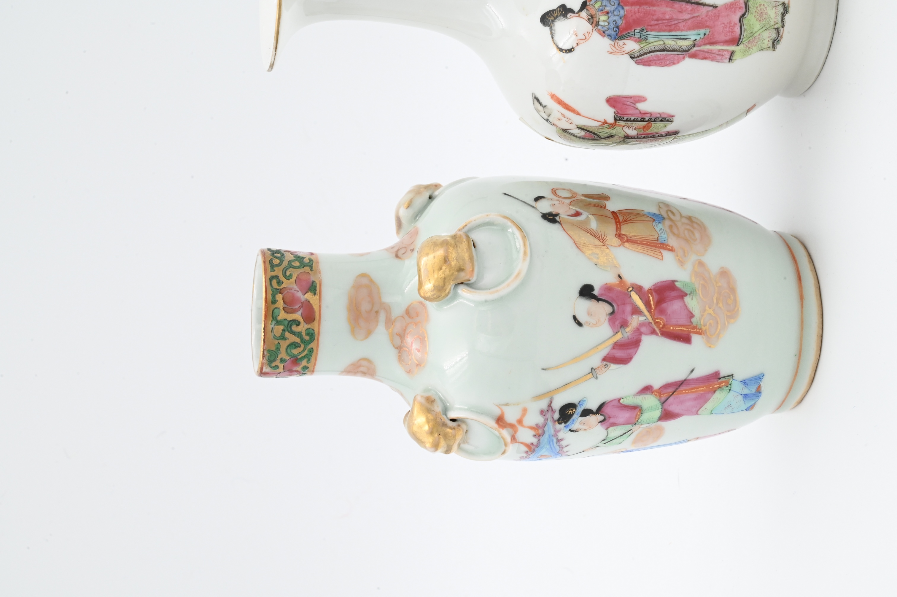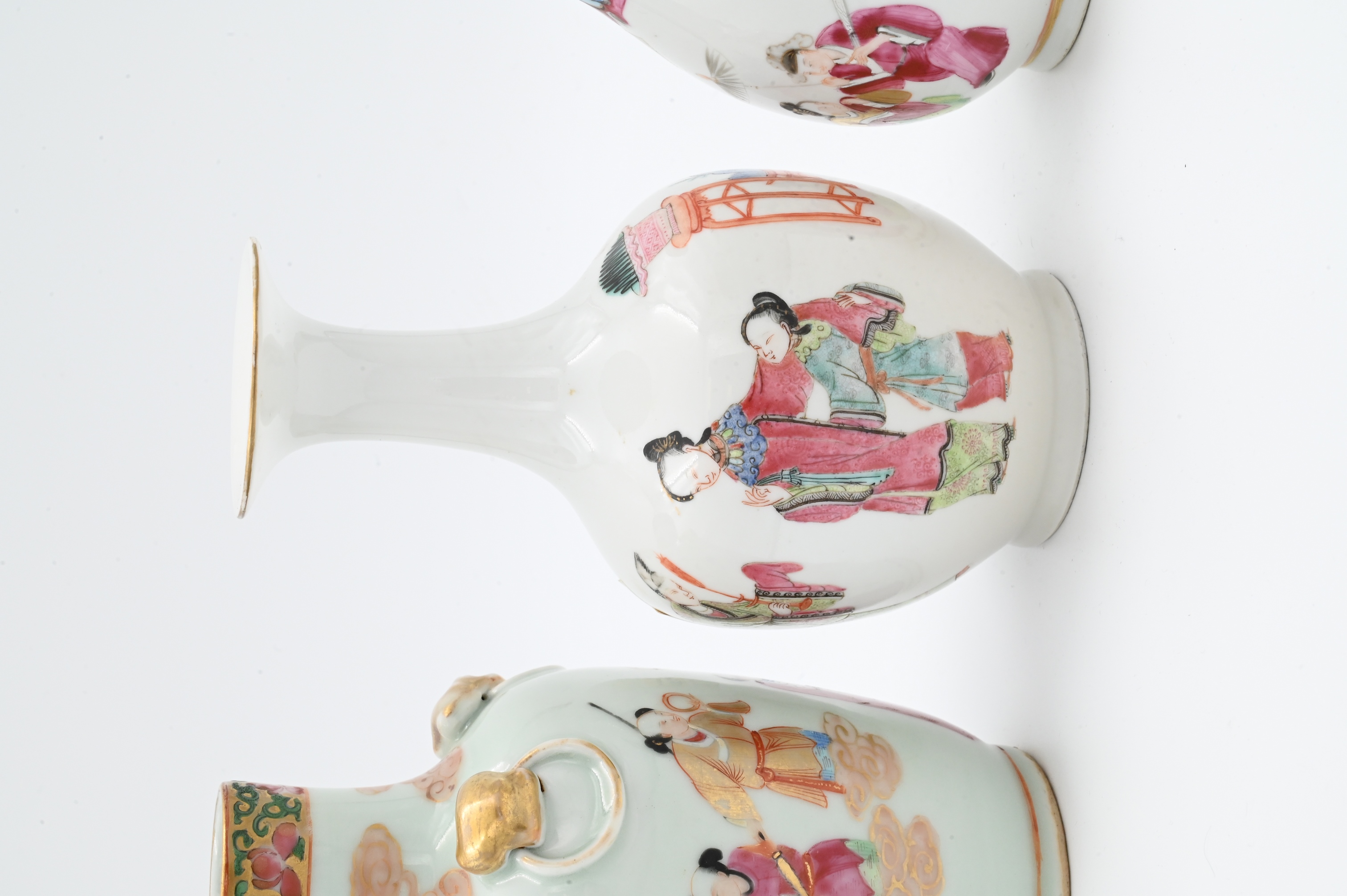 to include two cylindrical fluted vases, one having court scene, the other having scholar scene, the third vase having scholar and court scene as well as four gilt high relief foo dog accents, 19th century