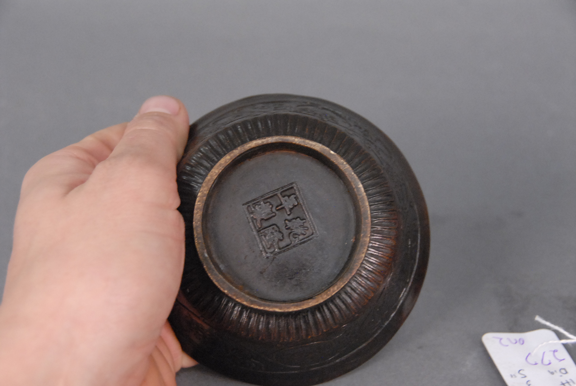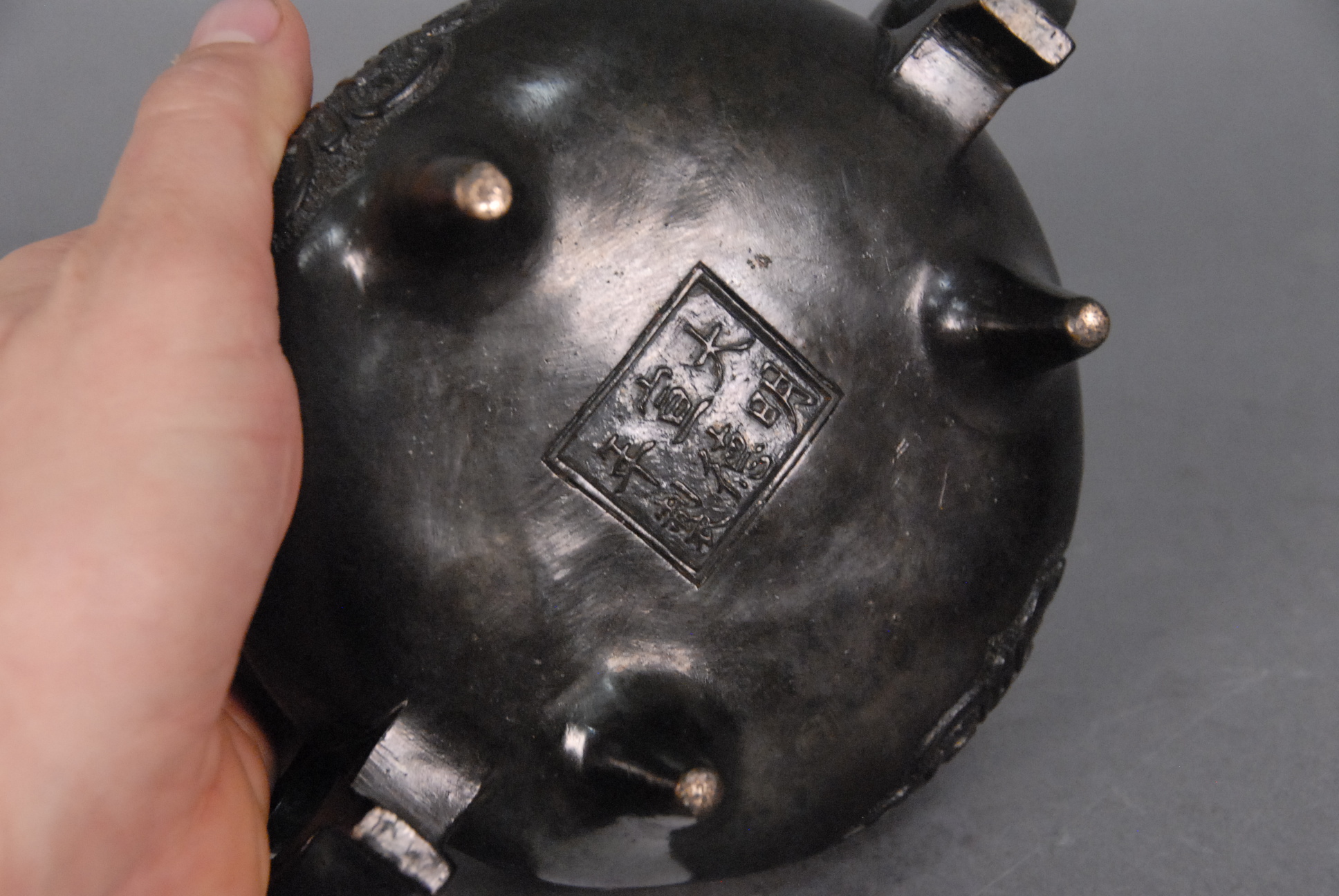Lot 277: Two bronze incense burners one with scrolling flowers and four character mark on bottom dia. 4in. and the other having tripod base …
