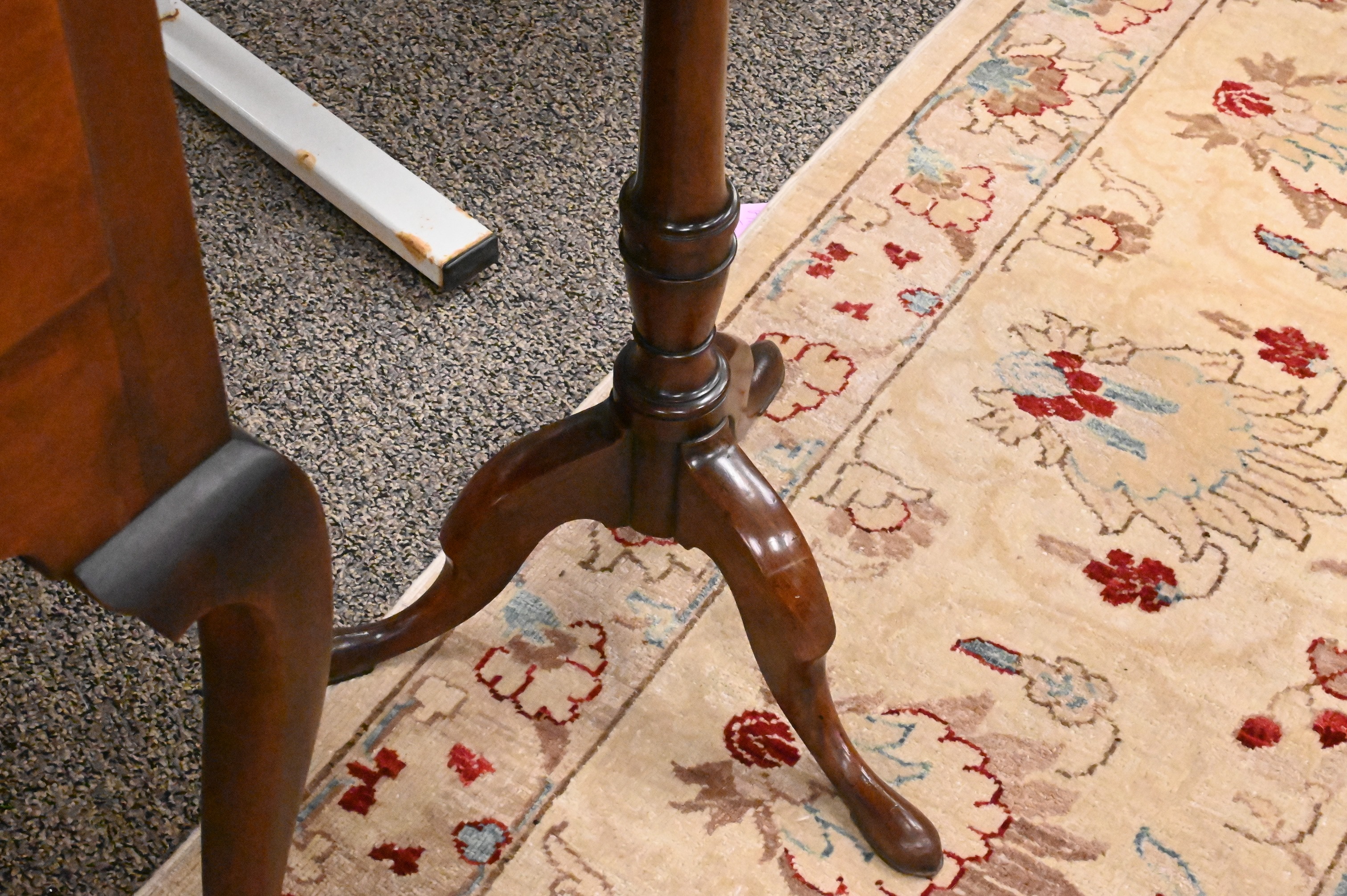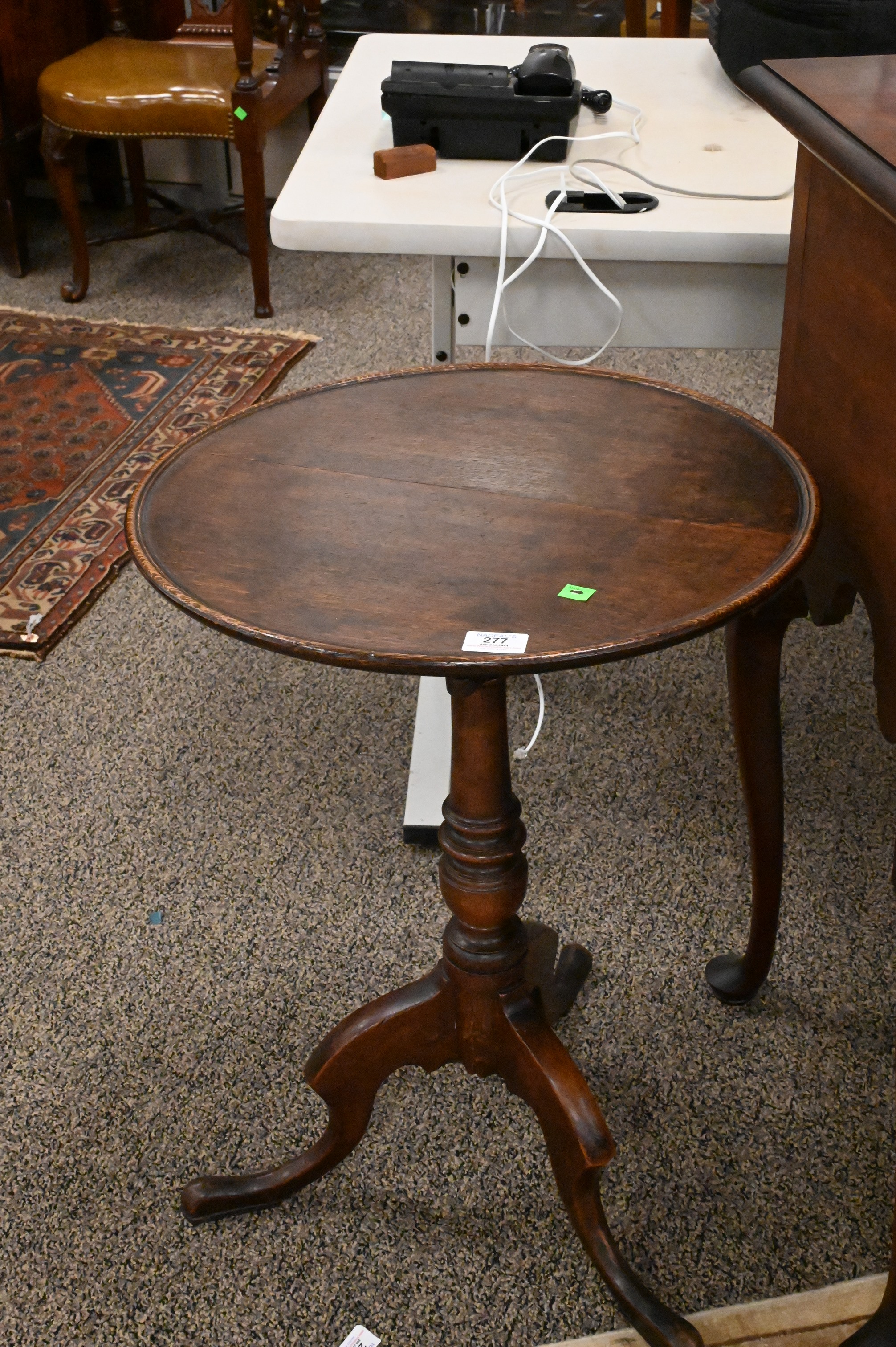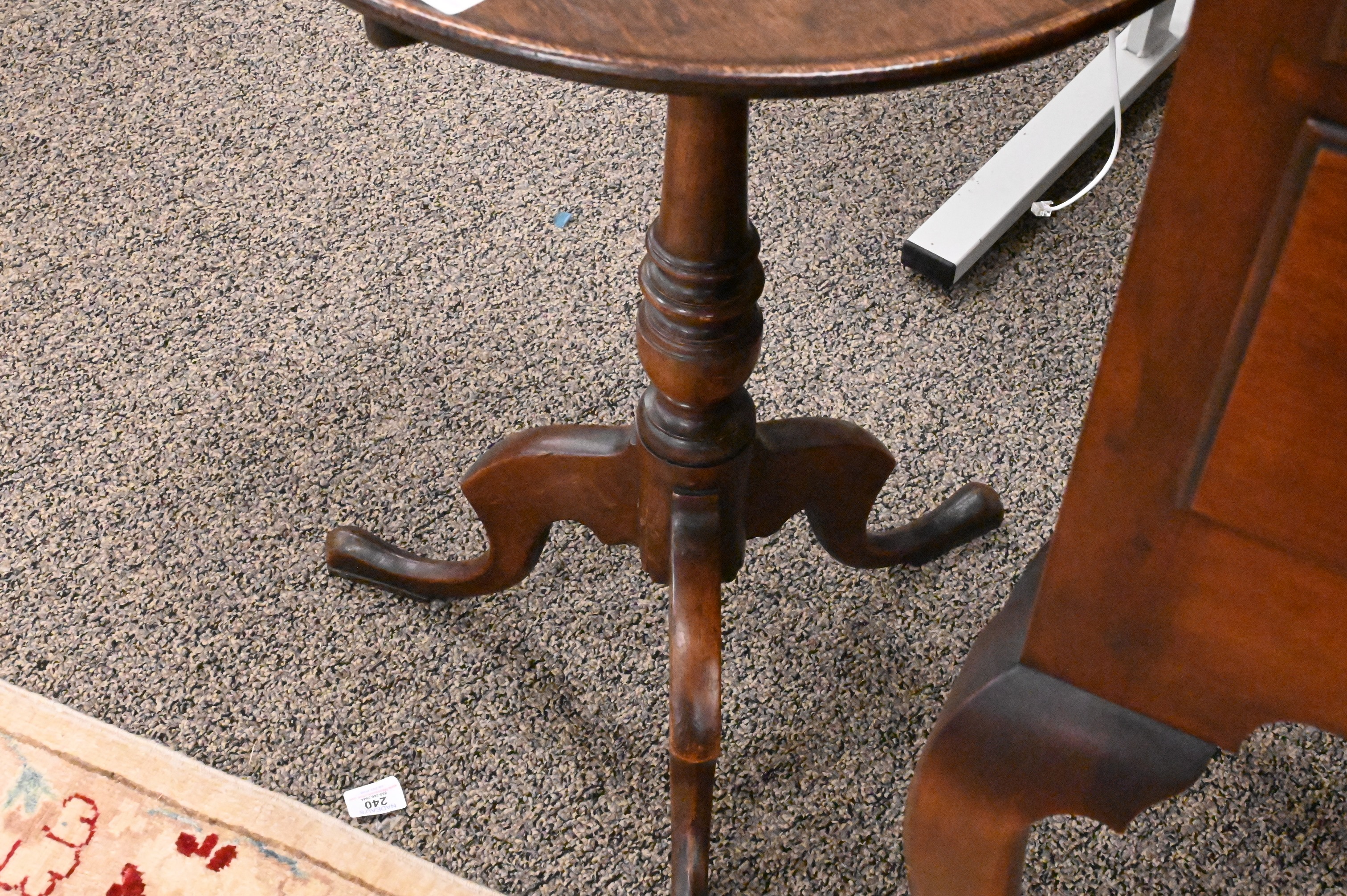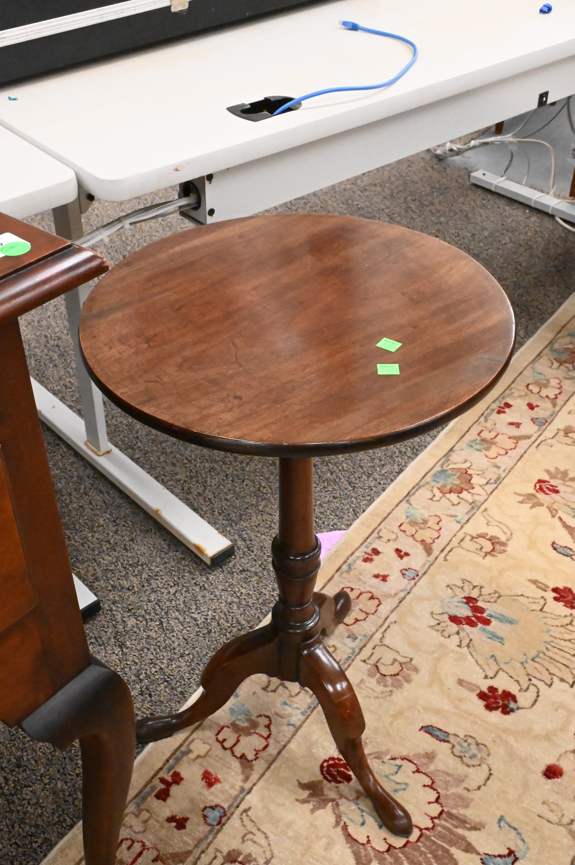 Two English Candle Stands, one oak and one mahogany, each set on tripod bases, 19th century, tallest height 27 1/2 inches, diameter 18 inches.
