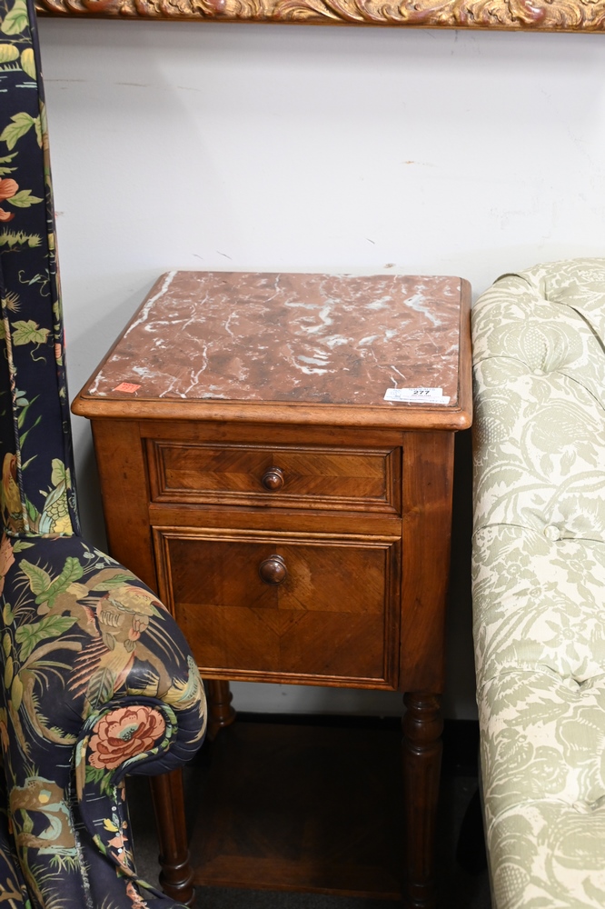 Lot 277: Two Louis XV Style Marble Top Stands, non matching, heights 32 and 33 inches, tops 15 x 15 inches.