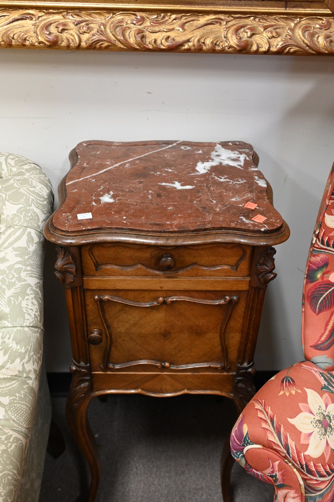 Two Louis XV Style Marble Top Stands, non matching, heights 32 and 33 inches, tops 15 x 15 inches.