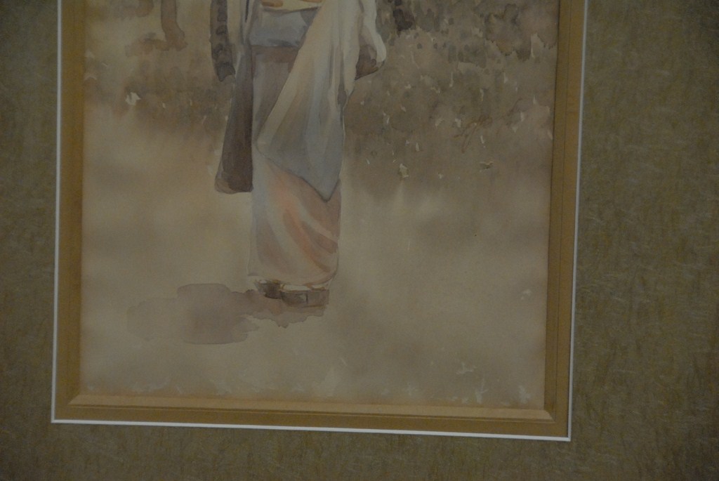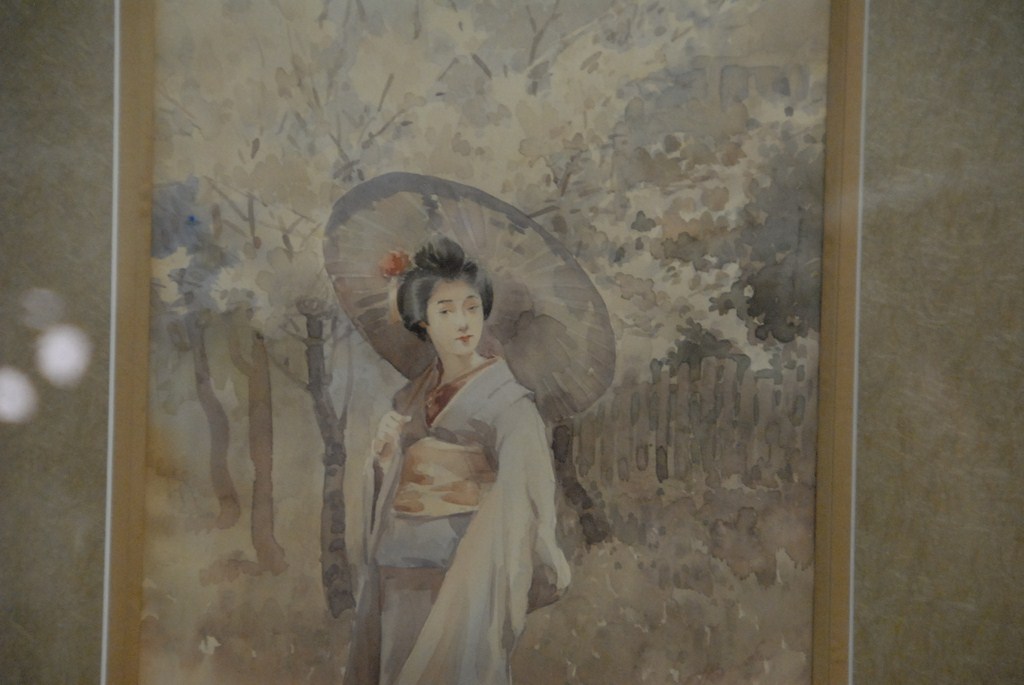 Watercolor Japanese woman with umbrella, 16 x 9 1/2.