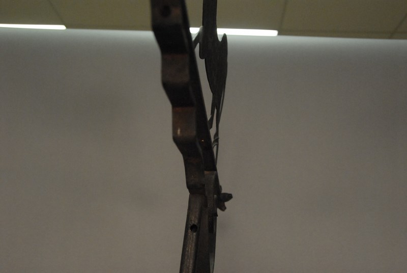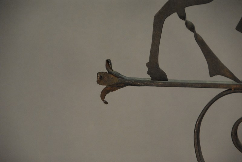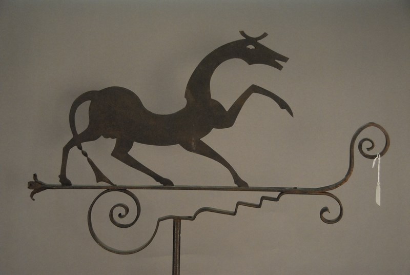 Lot 277: Wilhelm Hunt Diederich 1884 – 1953 wrought iron figural floor lamp circa 1925 of prancing stallion with one foreleg raised resting on adjustable stand with scroll side support ending on tripod base. Reference similar lamp Nadeau’s Auction Gallery s