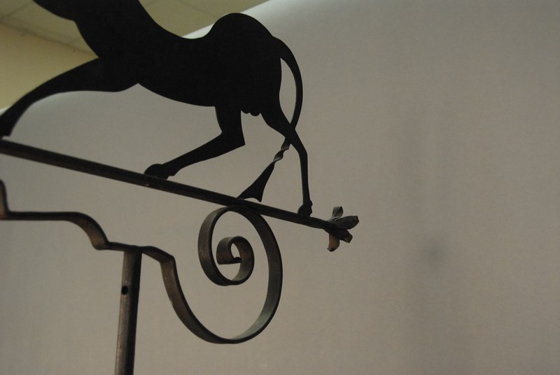 Wilhelm Hunt Diederich 1884 – 1953 wrought iron figural floor lamp circa 1925 of prancing stallion with one foreleg raised resting on adjustable stand with scroll side support ending on tripod base. Reference similar lamp Nadeau’s Auction Gallery sold #251 January 1, 2008 for 52,500. 56 1/2in. lg. 31in., extends to ht. 6ft. 2in.