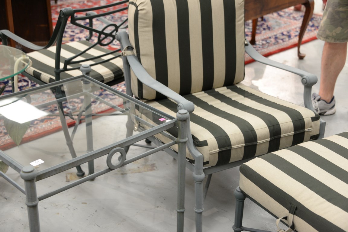 Lot 277: Woodard five piece set including two armchairs with ottomans and clean cushions, and a glass top table. ht. 22 in. top: 24 1/2 x 2…