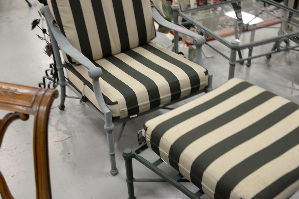 Woodard five piece set including two armchairs with ottomans and clean cushions, and a glass top table. ht. 22 in. top: 24 1/2 x 24 1/2