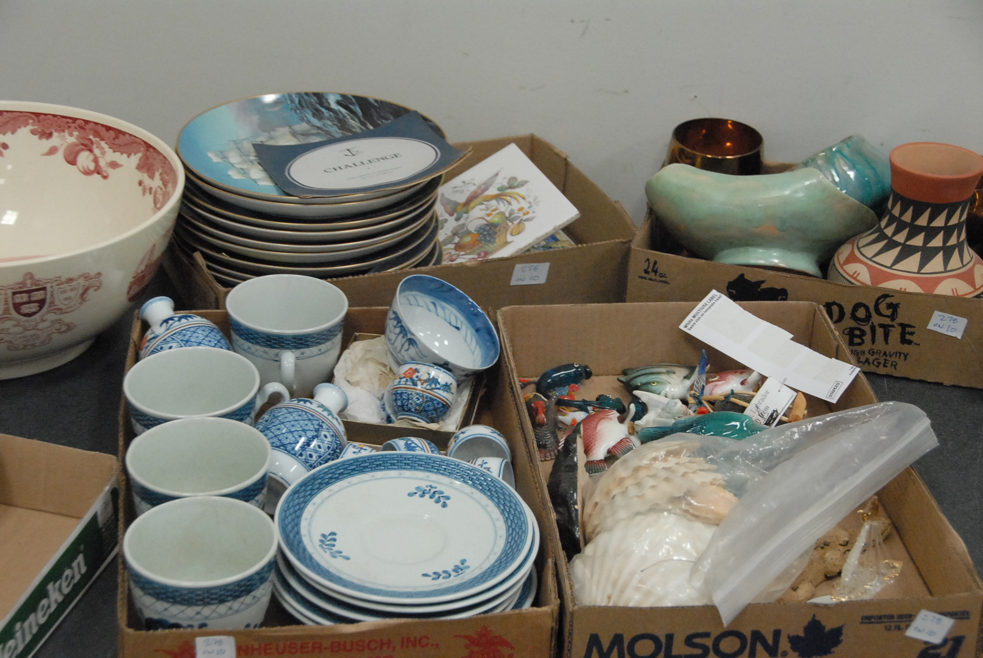 10 box lots to include various cups and saucers, crystal bowls, vases, export plate, covered jar, Danish dishes, collectors plates, Wedgwood punch bowl, fish figures