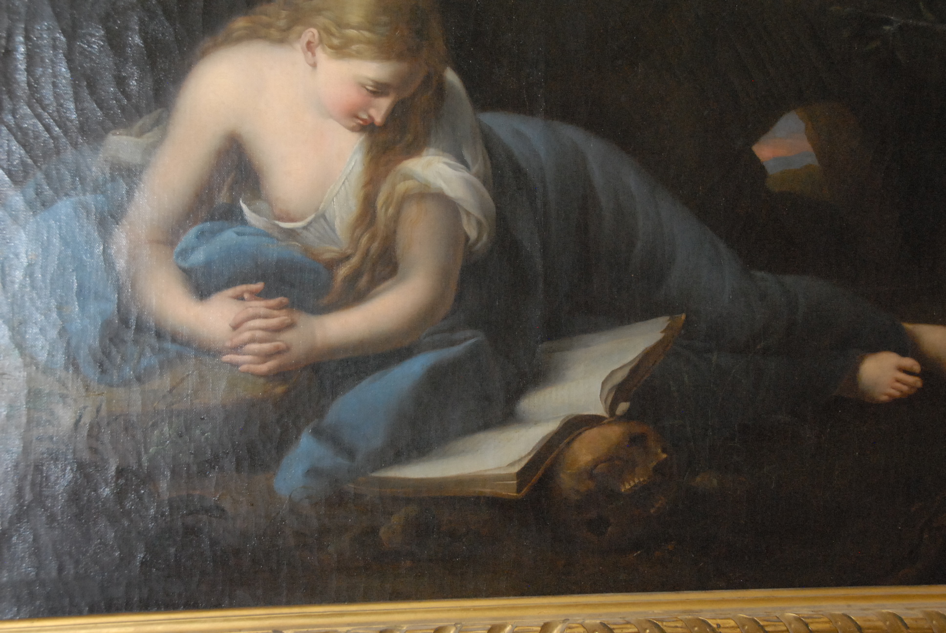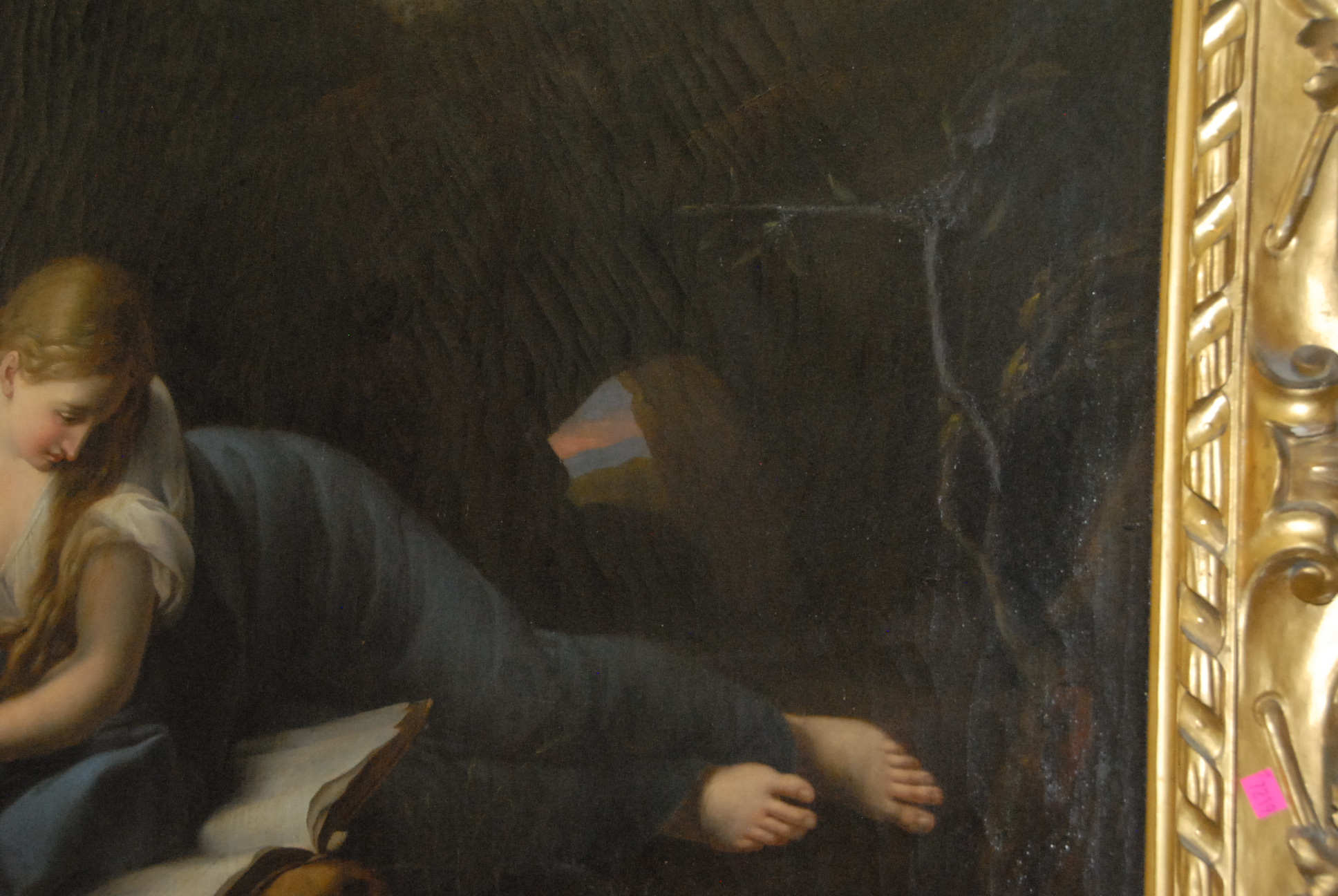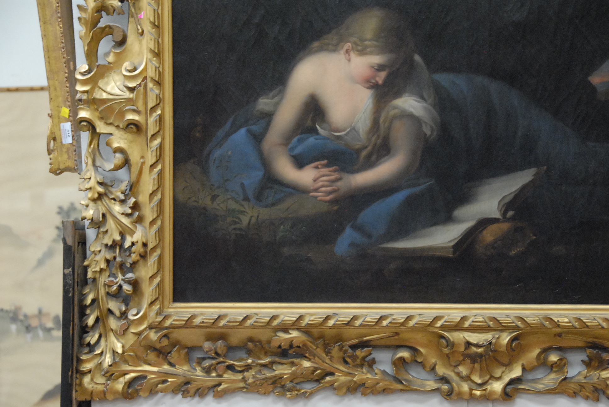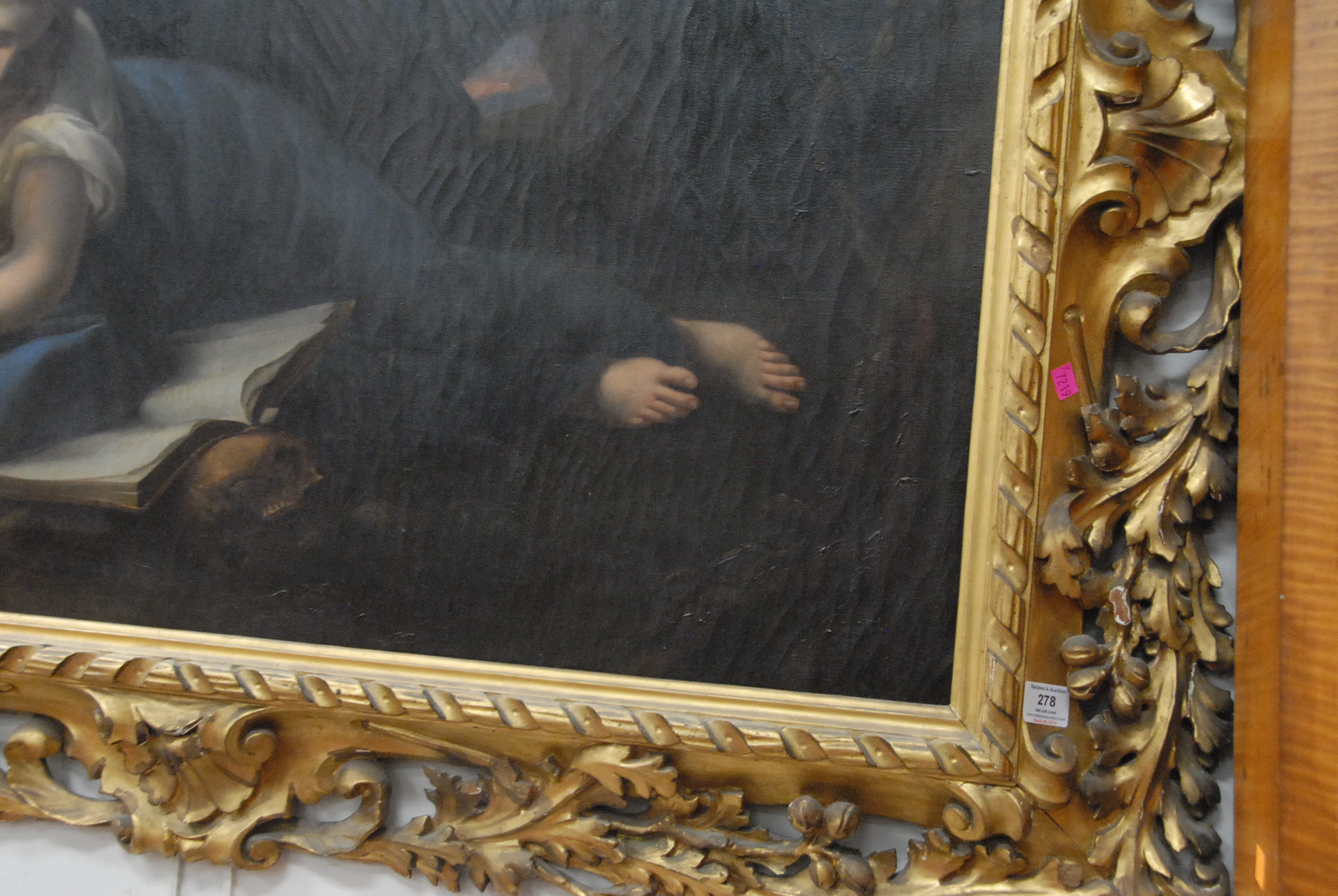 Lot 278: Attributed to Giuseppe Mazzolini 1806-1876 WOMAN READING BOOK RESTING AGAINST SKULL oil on canvas unsigned inscribed on verso Mazzolini 30 x 44