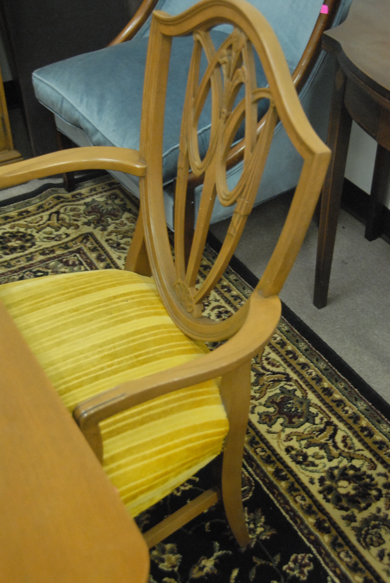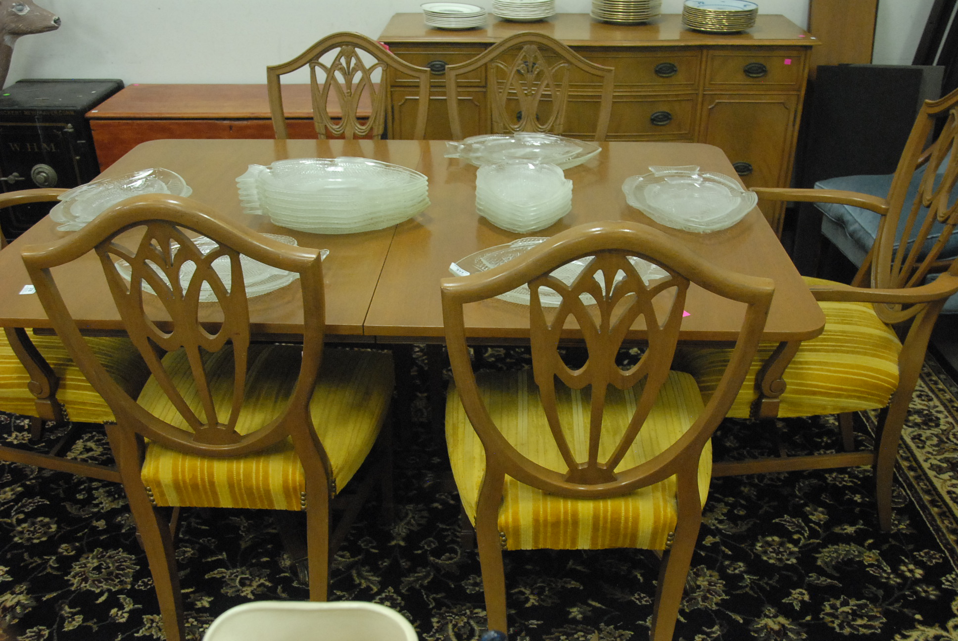 Lot 278: Eight piece mahogany dining room set.server: ht. 36 in. wd. 60 in. table: ht. 30 in. wd. 42 in. lg. 62 in. with four 9 in. leave…