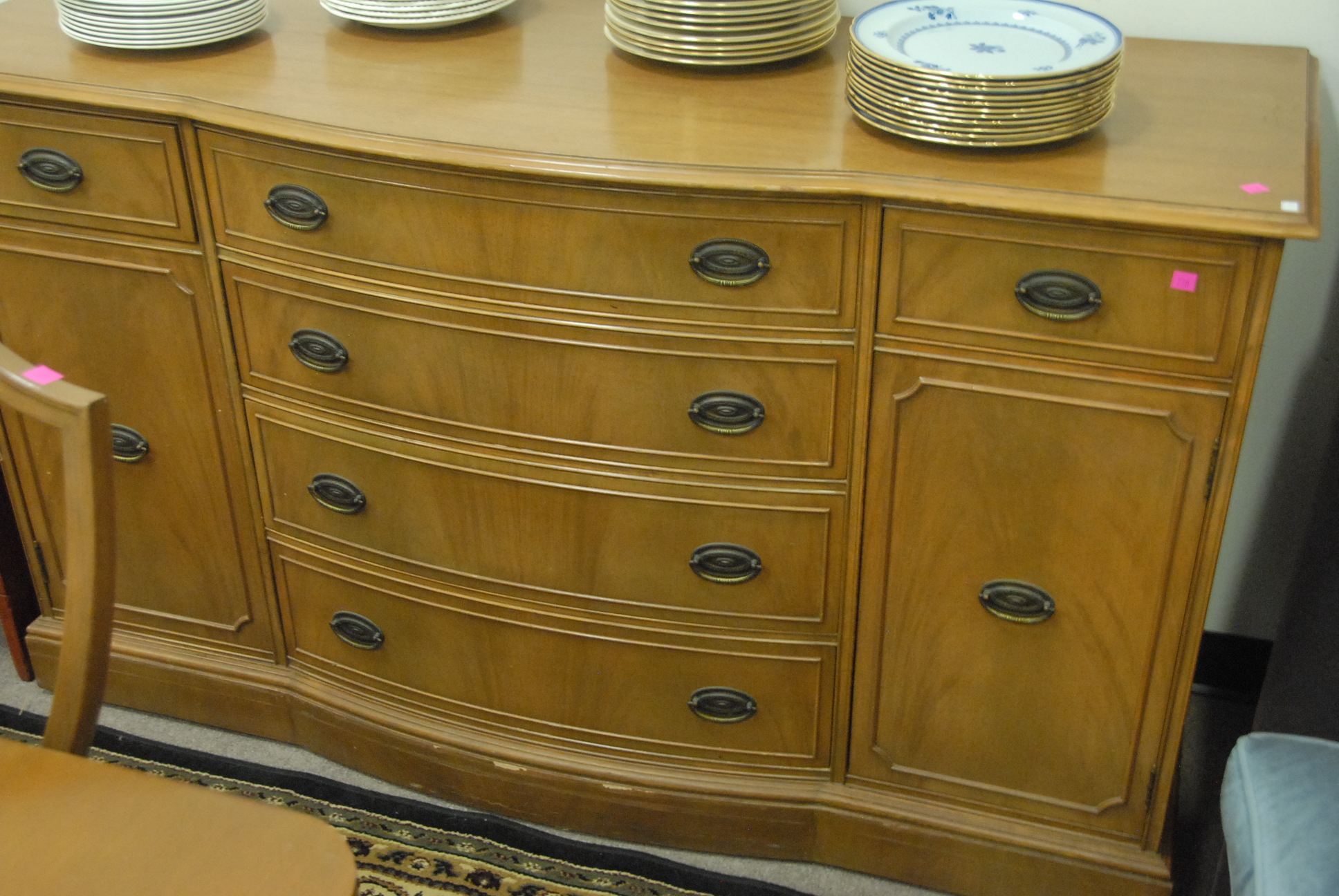 Eight piece mahogany dining room set.server: ht. 36 in. wd. 60 in. table: ht. 30 in. wd. 42 in. lg. 62 in. with four 9 in. leaves opens to 98 in.