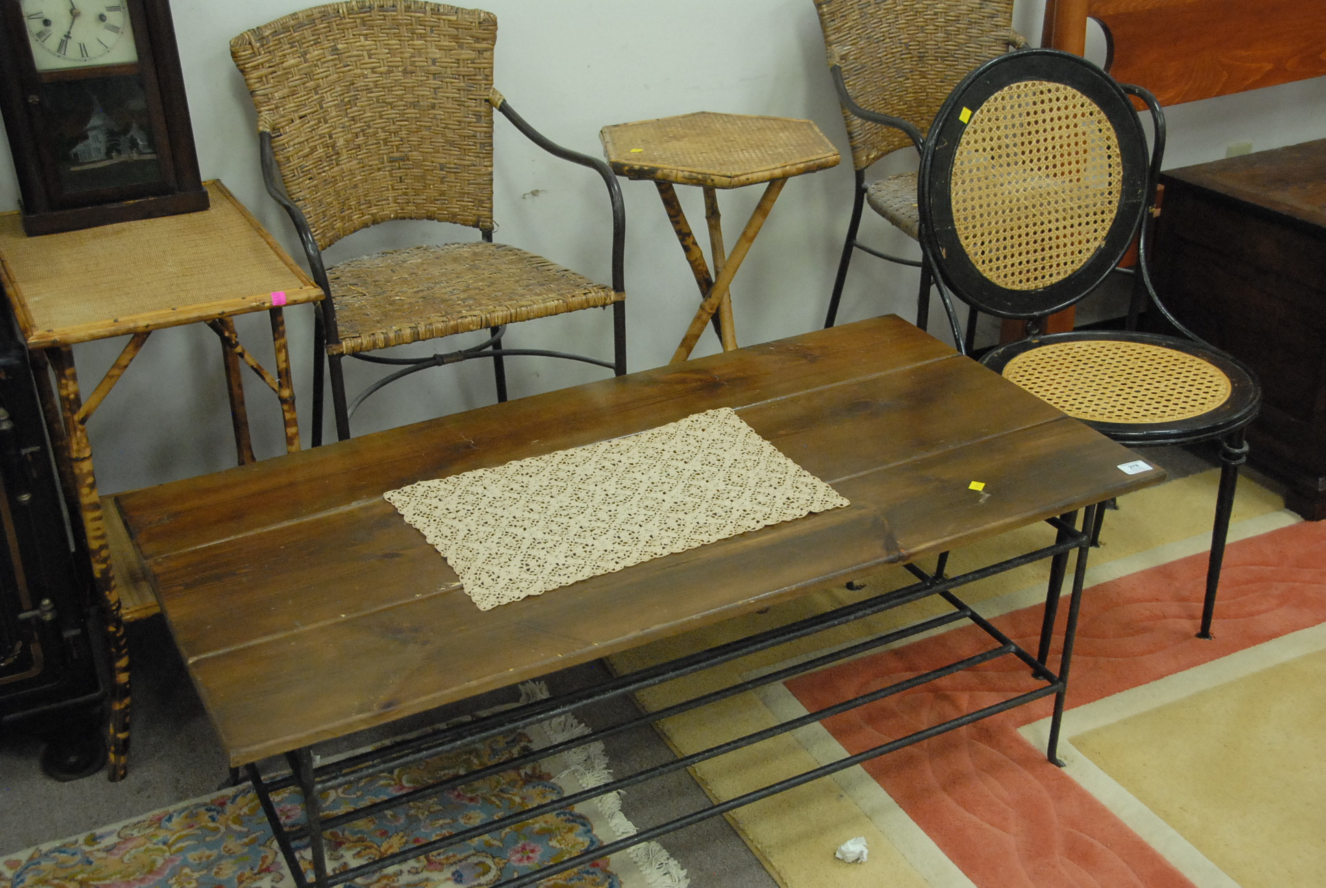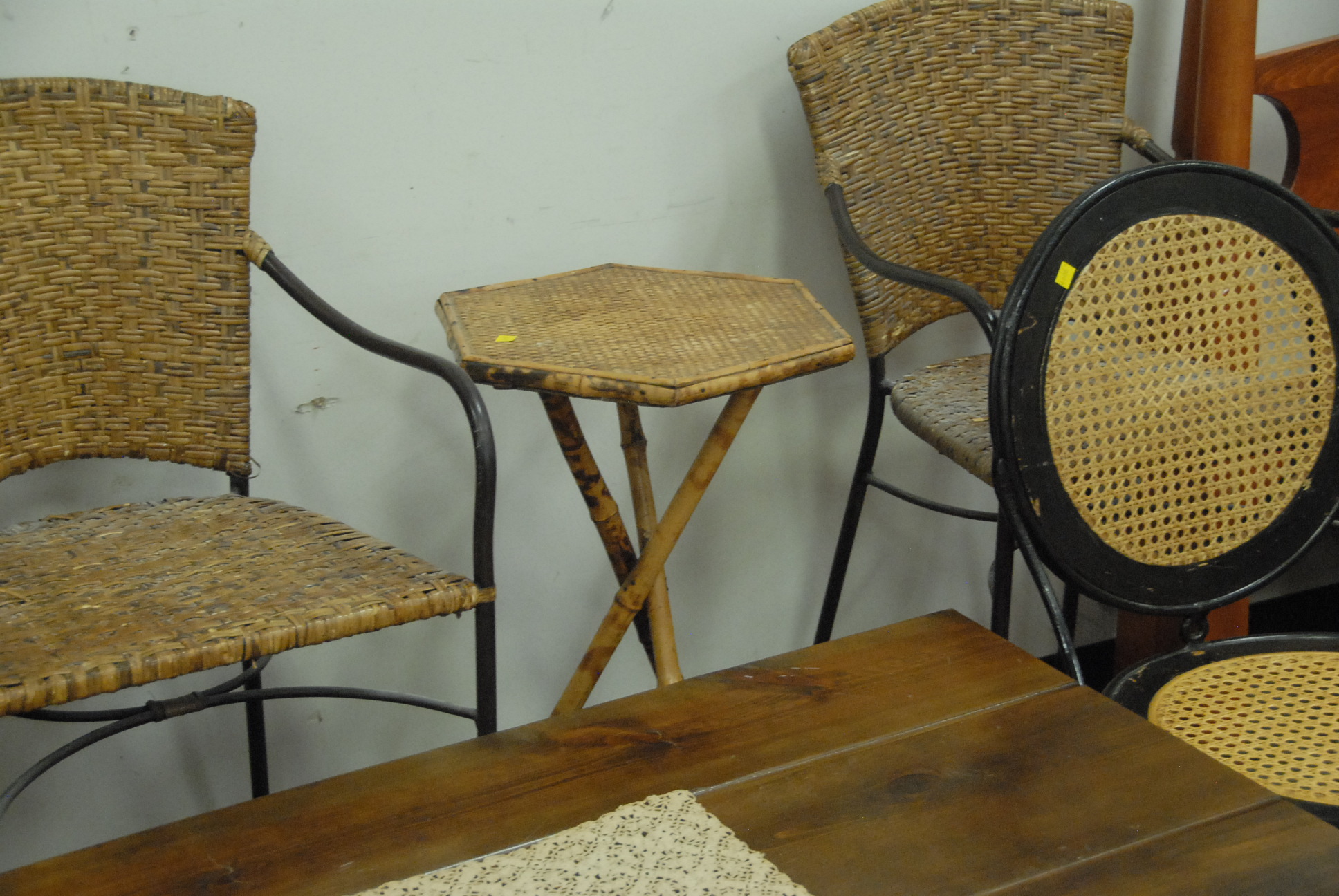 Five piece lot to include three iron base and two bamboo tables.