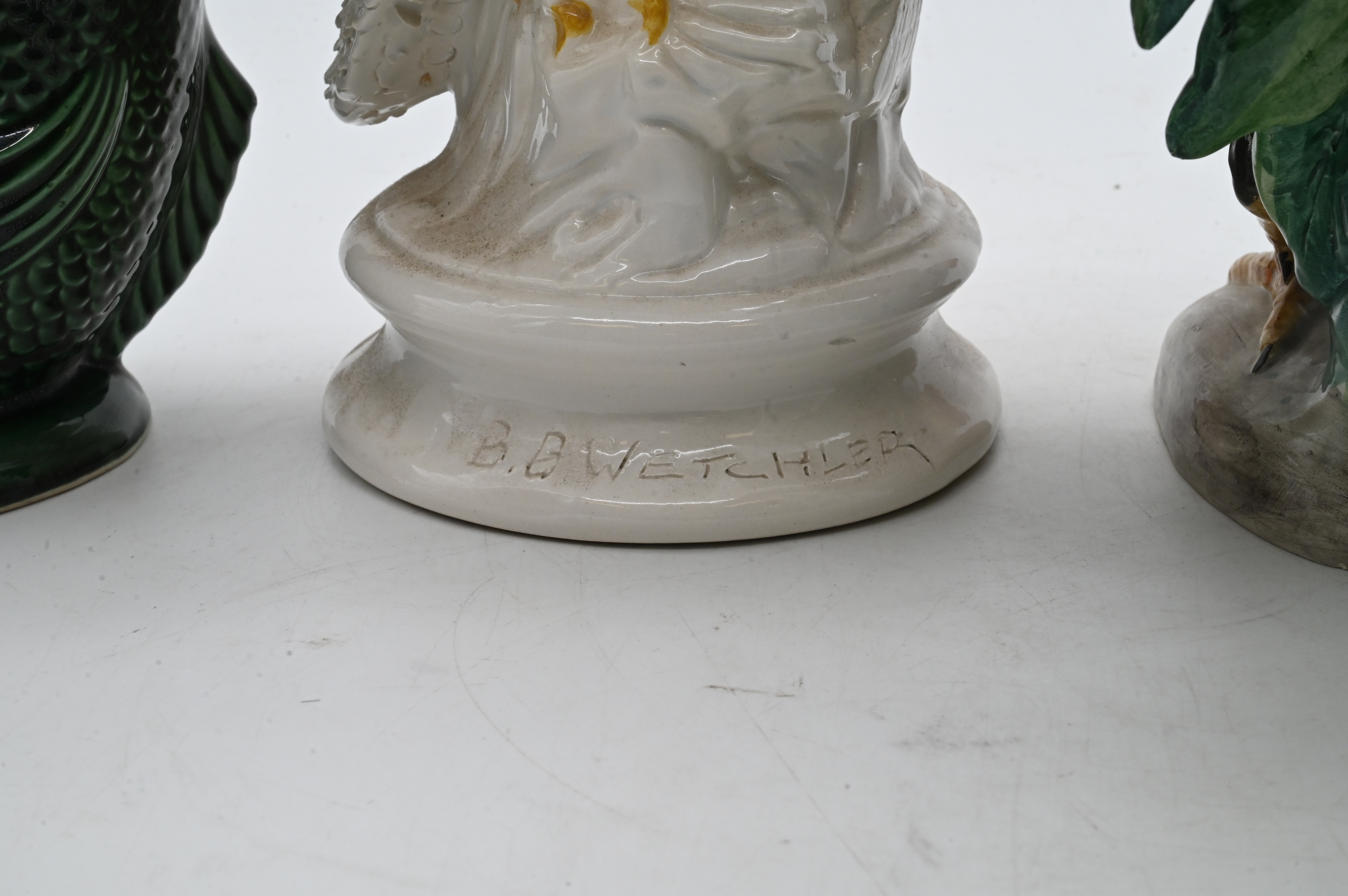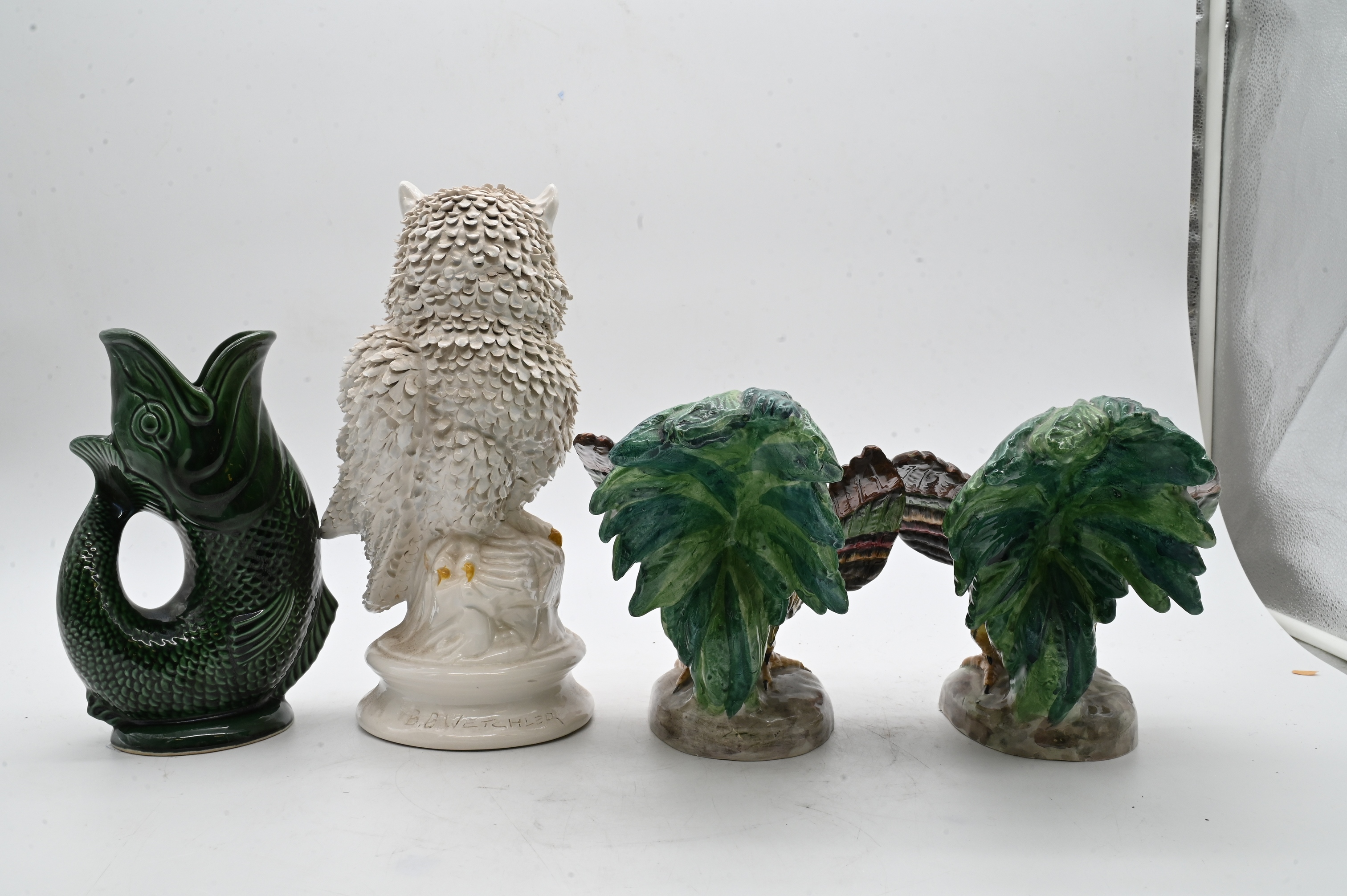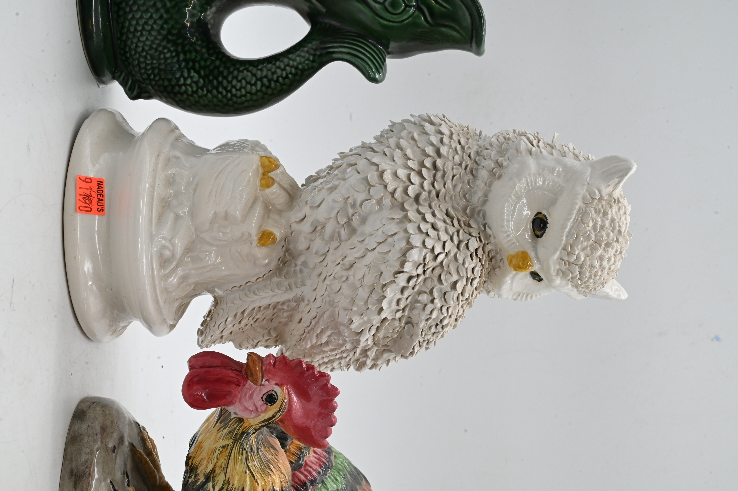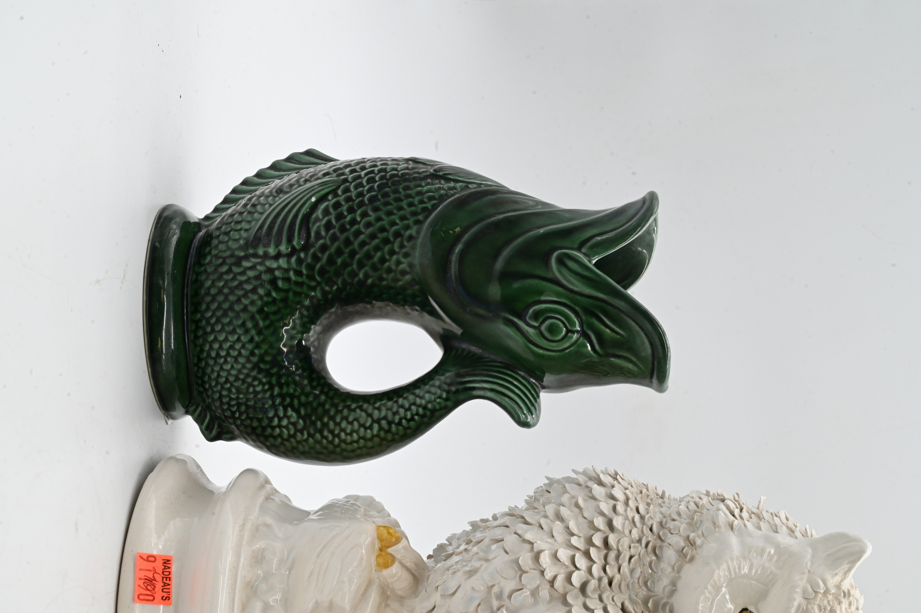 Dartmouth Majolica green gurgling fish pitcher, height 9 1/2 inches, Mid Century ceramic owl with textured feathers, signed B.B.Wetchler, height 12 inches, along with a pair of polychrome roosters marked Italy