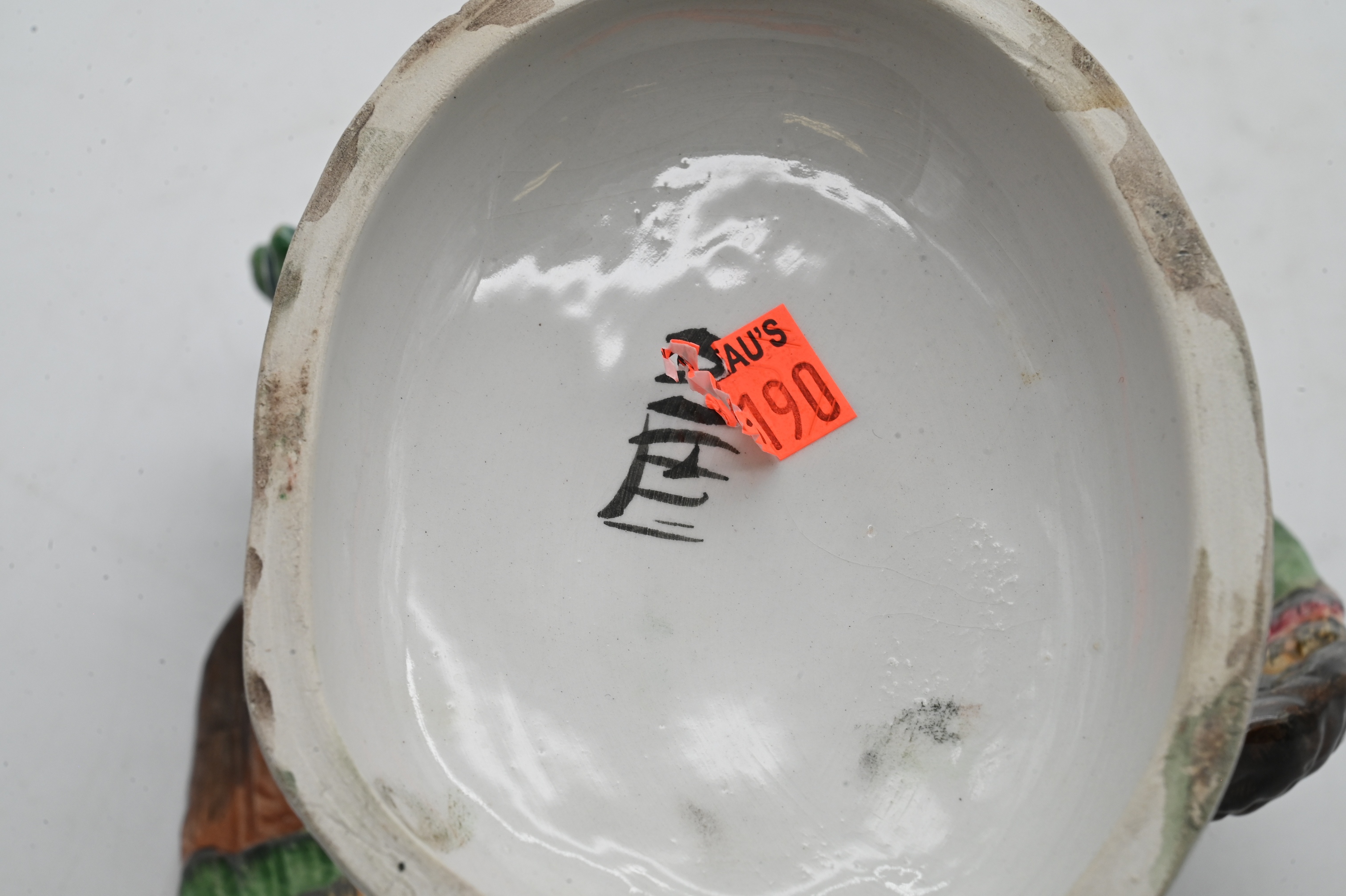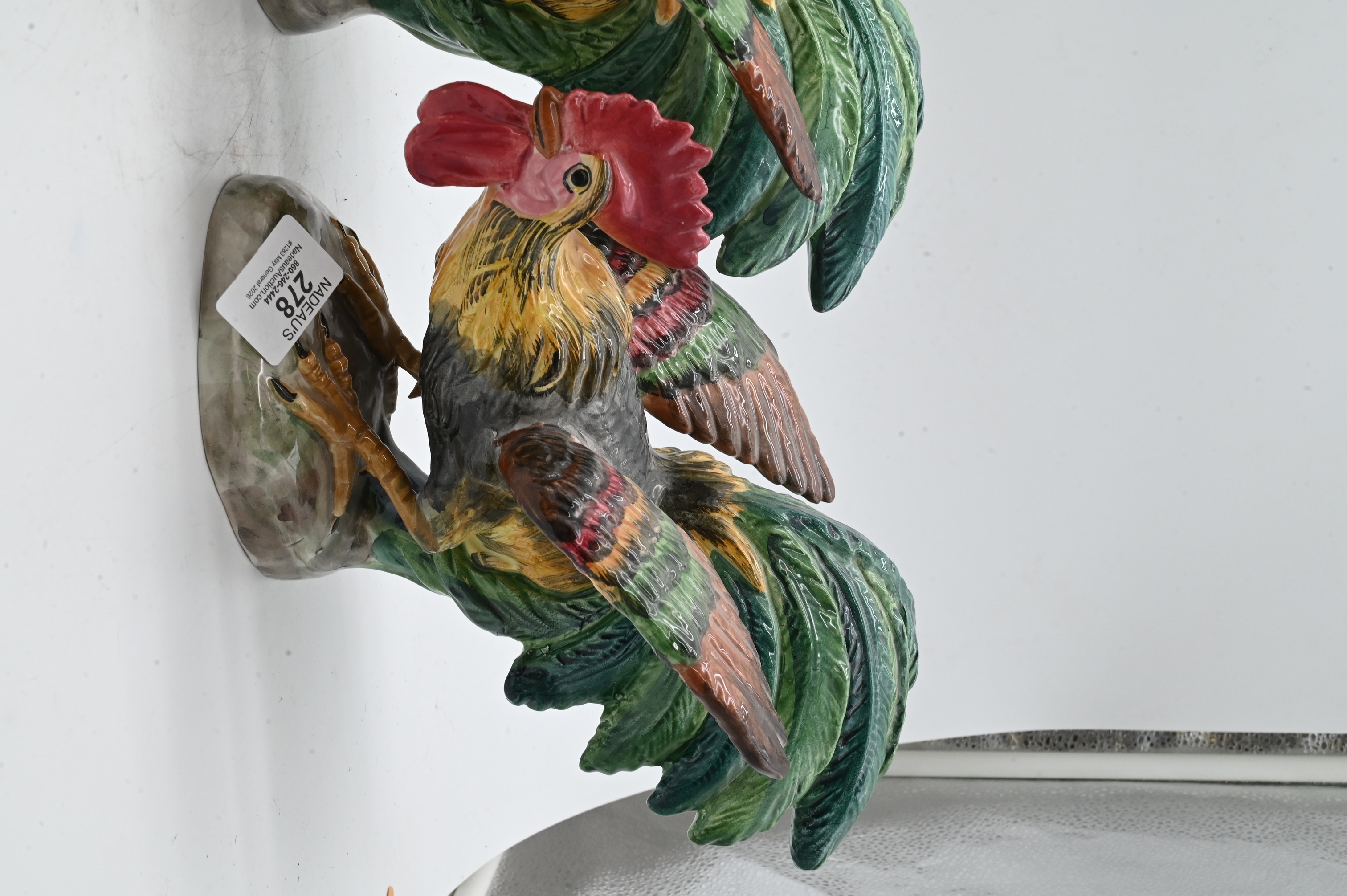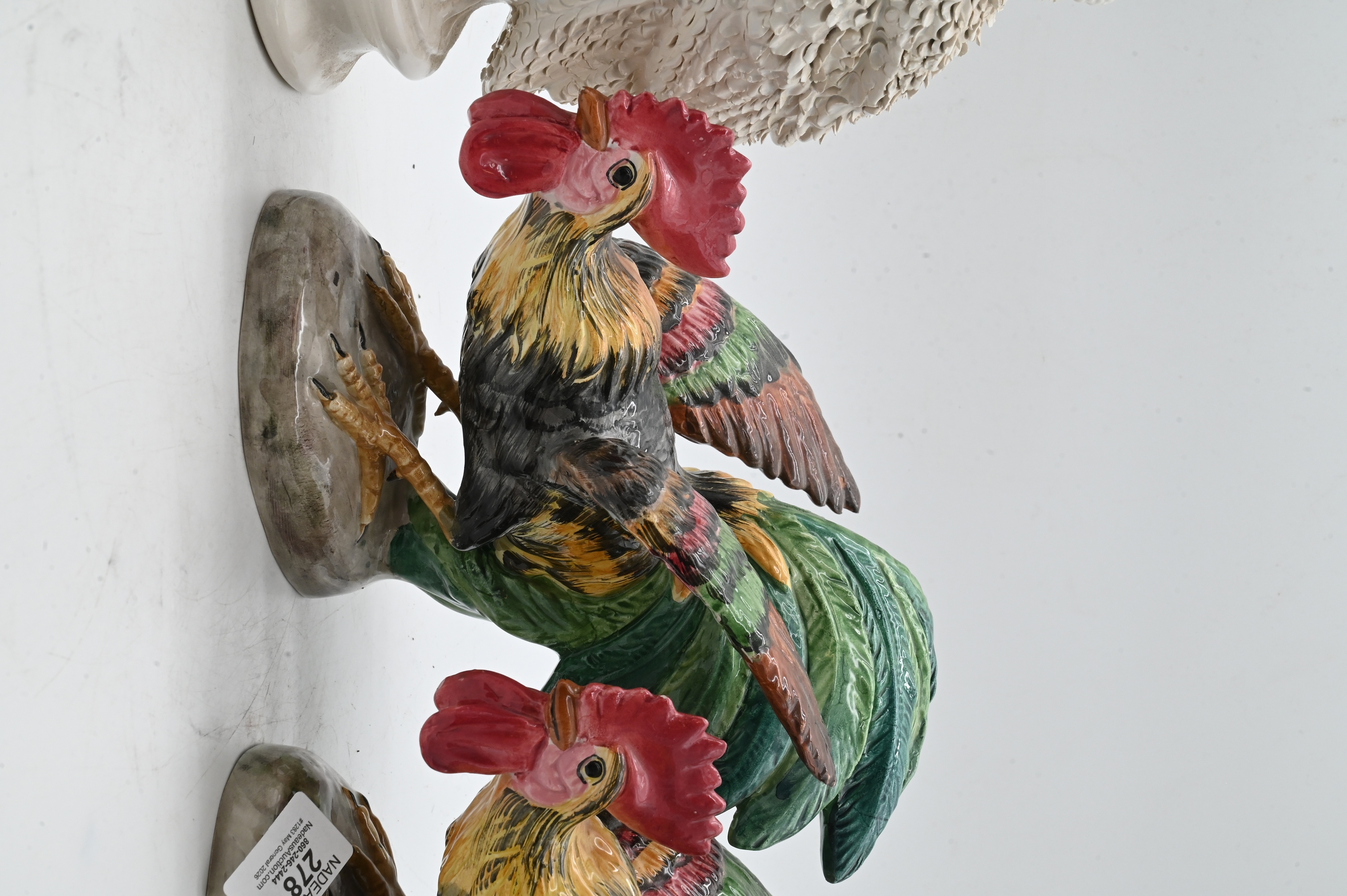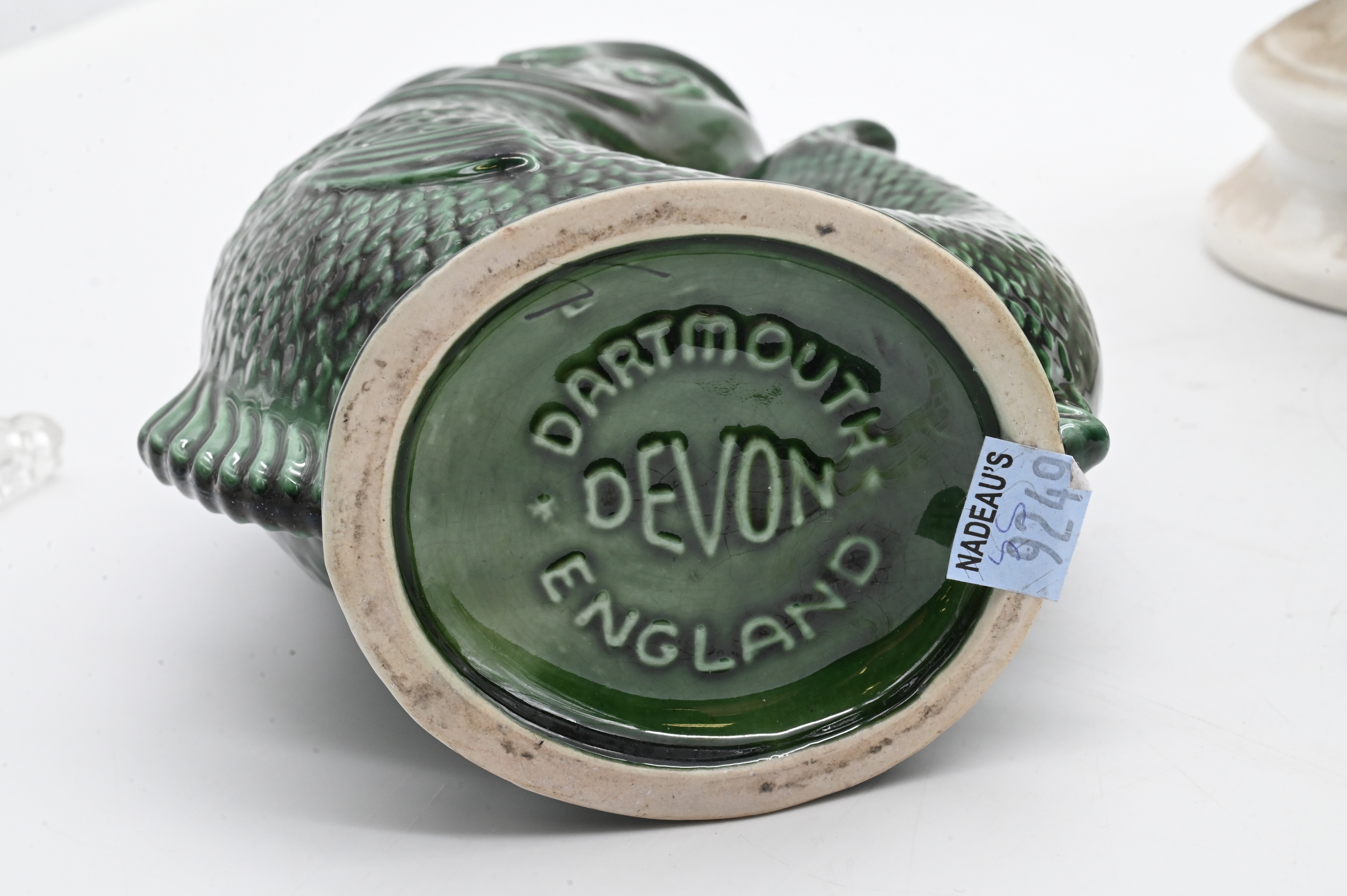 Dartmouth Majolica green gurgling fish pitcher, height 9 1/2 inches, Mid Century ceramic owl with textured feathers, signed B.B.Wetchler, height 12 inches, along with a pair of polychrome roosters marked Italy