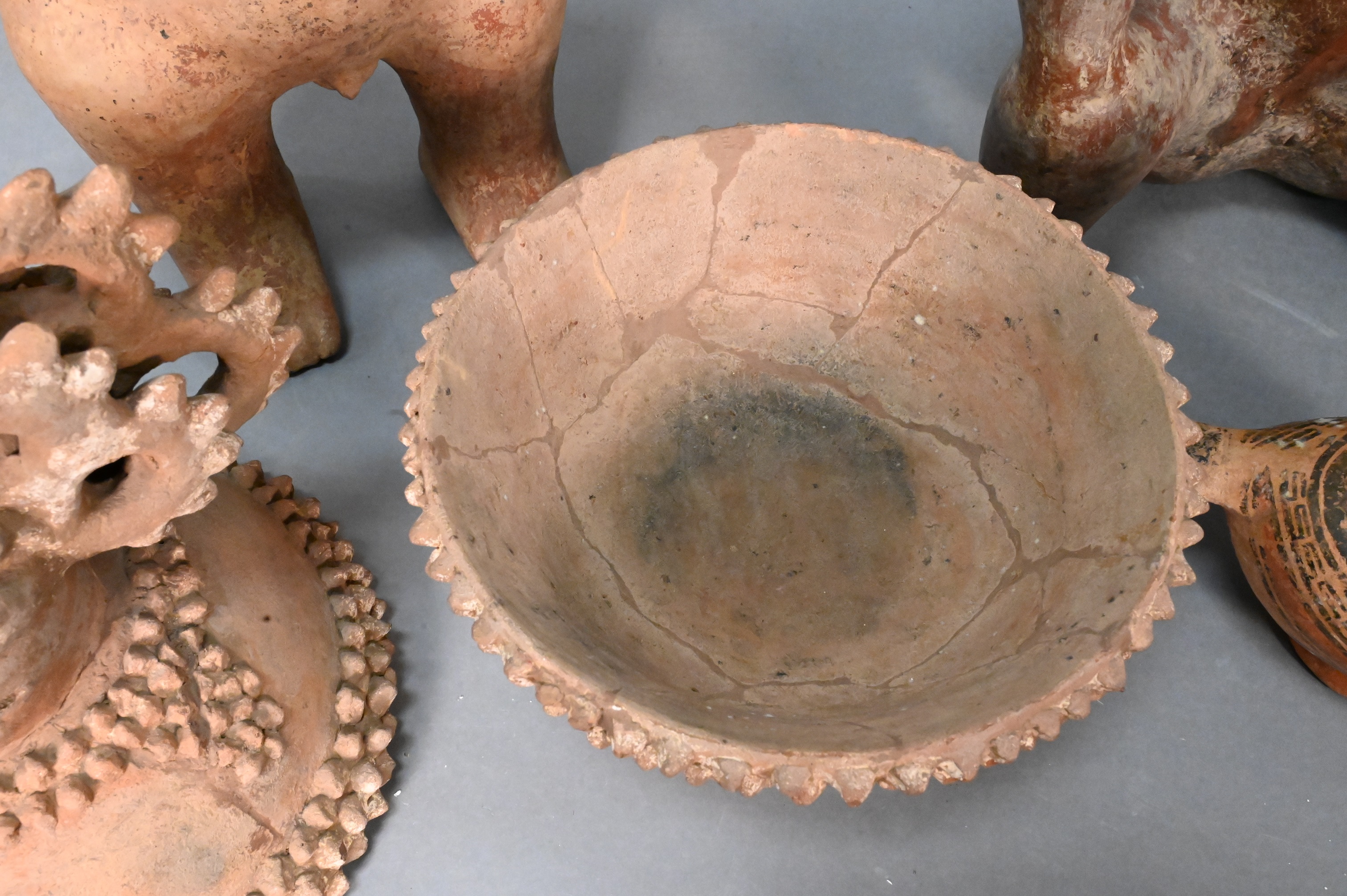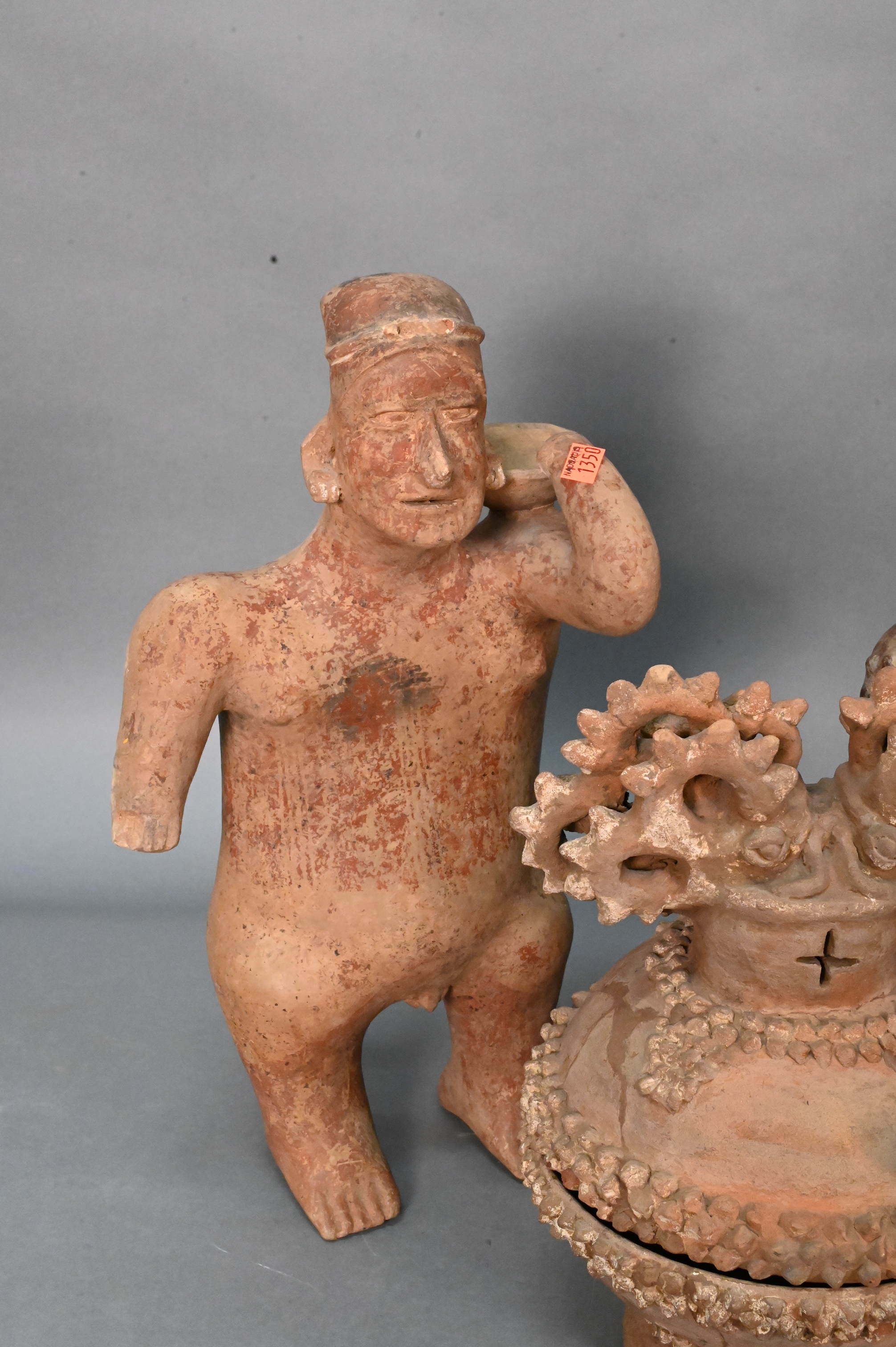 Four South American Pottery Pieces, to include two large figures, small bird vase, along with a large covered compote possibly 18th/19th century, (as is), tallest 20 inches. Provenance: Property from a private New York collection sold to benefit charitable foundations.