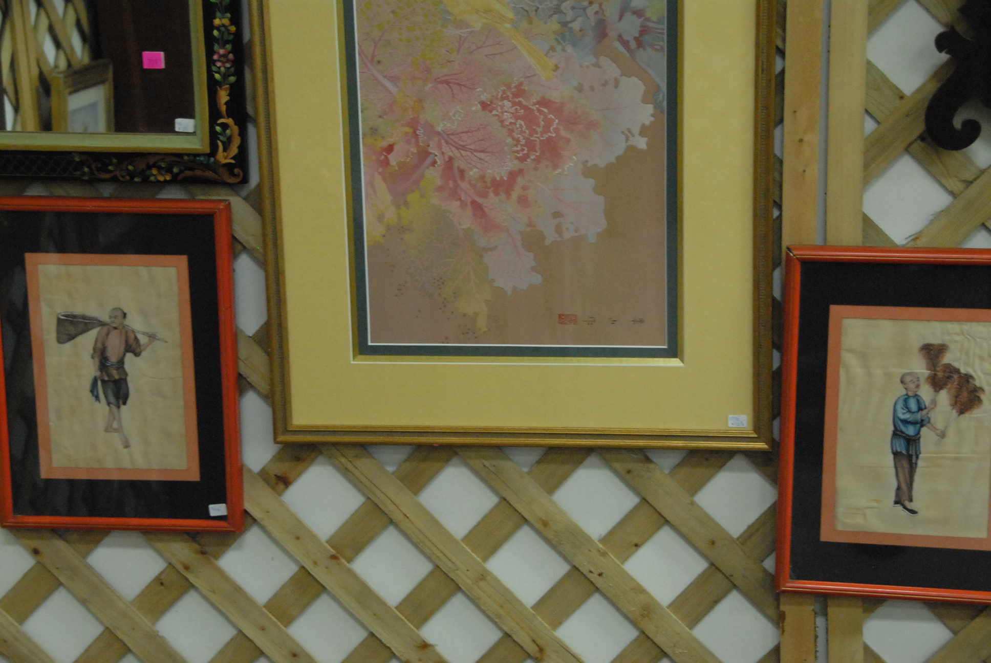 Lot 278: Group of five framed Oriental pieces to include pair of watercolor on silk of figures, two prints, and a mirror.