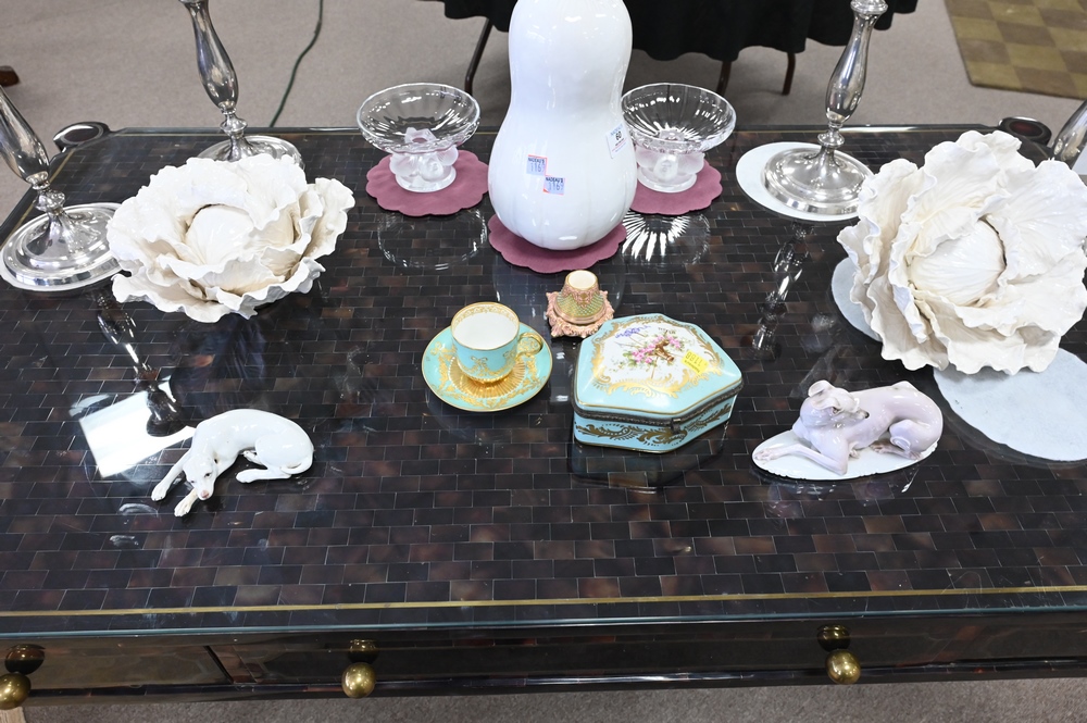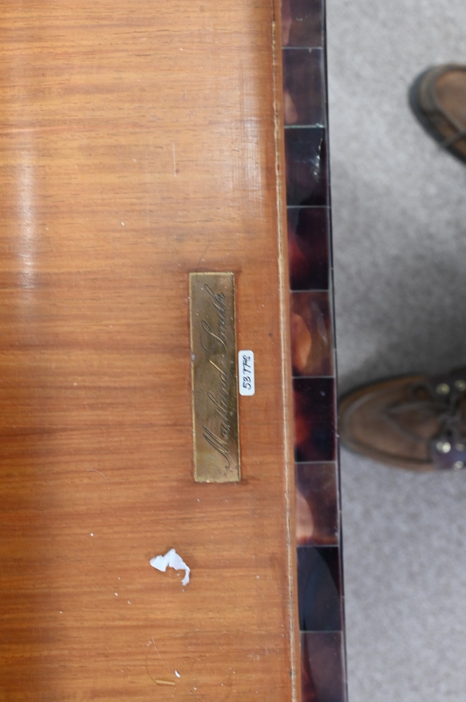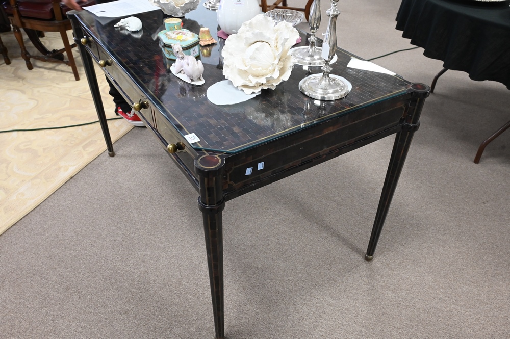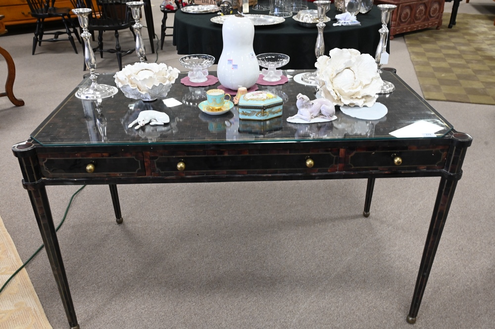 Lot 278: Maitland Smith Bureau Plat, having faux tortoise shell inlaid top and turret corners over three short drawers, all raised on turned …