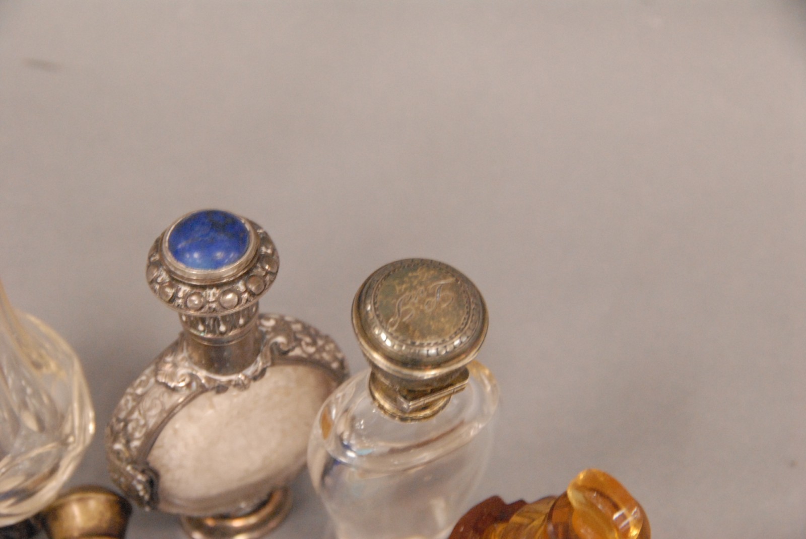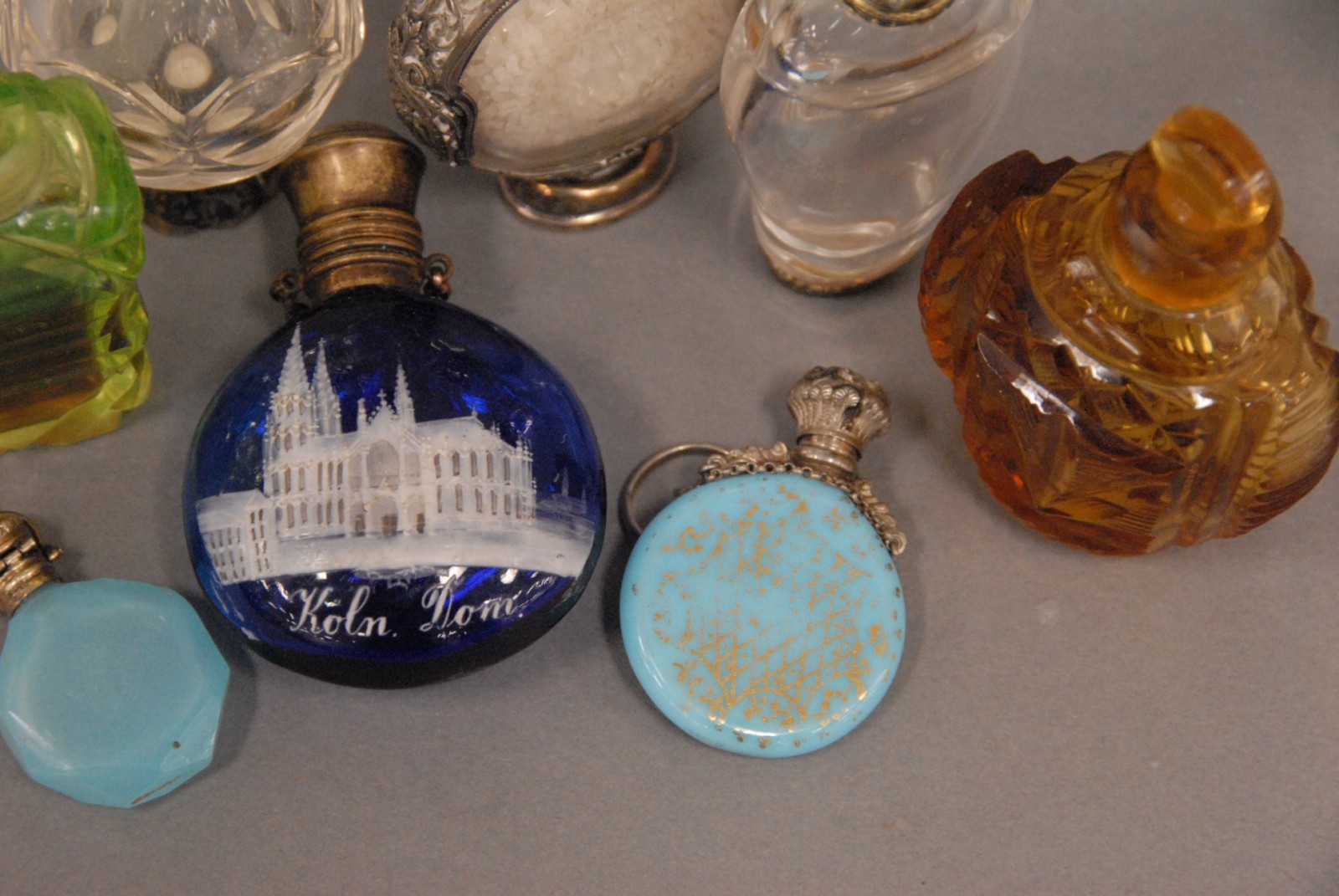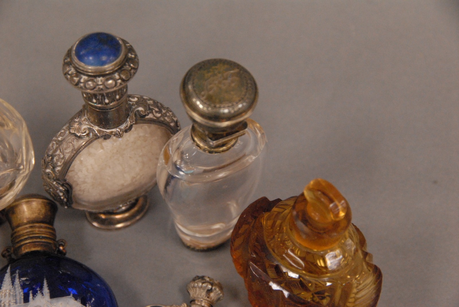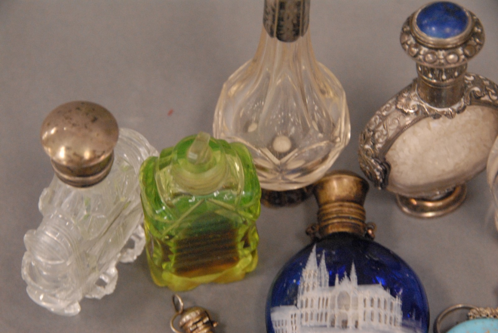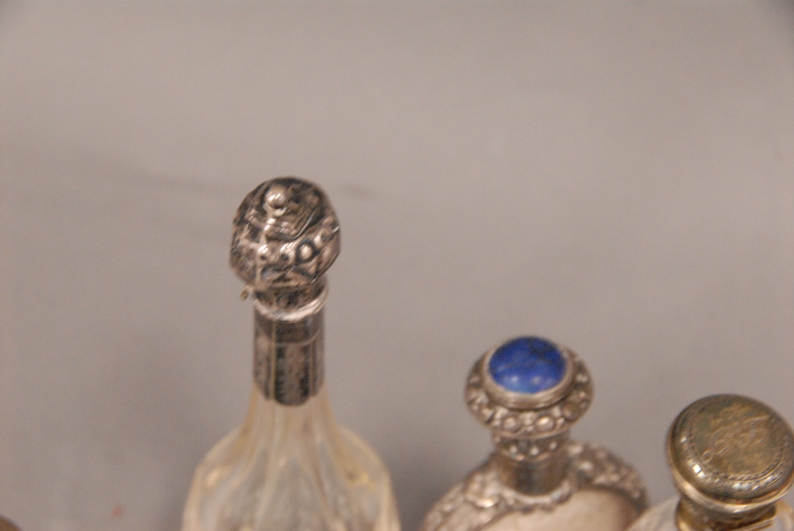 Nine scent bottles seven with silver tops.