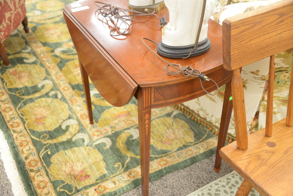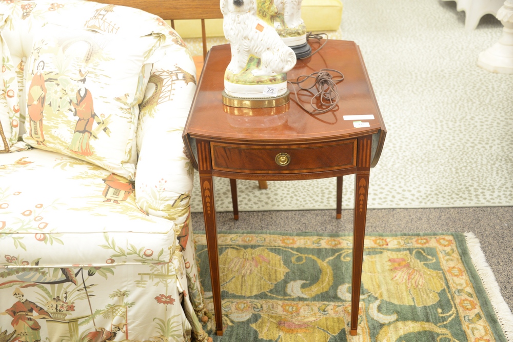 Lot 278: Pair of Baker Custom Mahogany Pembroke Federal Style Drop Leaf Tables, with drawer, height 28 inches, closed top 29 1/2″ x 20 1/2″