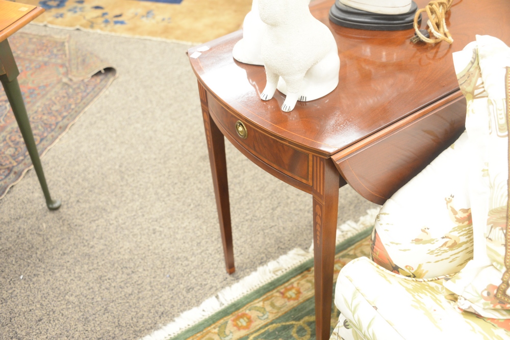 Pair of Baker Custom Mahogany Pembroke Federal Style Drop Leaf Tables, with drawer, height 28 inches, closed top 29 1/2″ x 20 1/2″