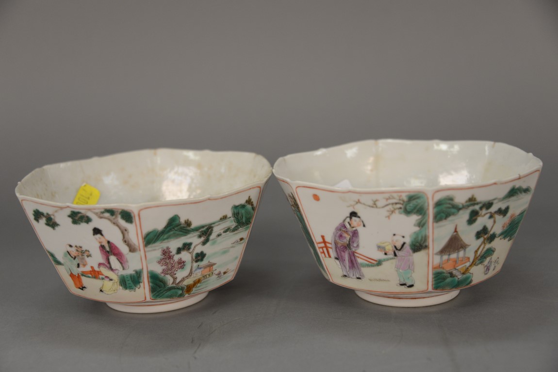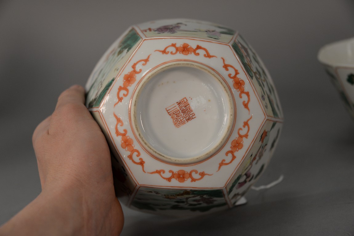 Lot 278: Pair of Famille Rose hexagon bowls, each with six painted panels, Jiaqing mark on bottom. ht. 3 1/2 in. wd. 6 1/2 in.