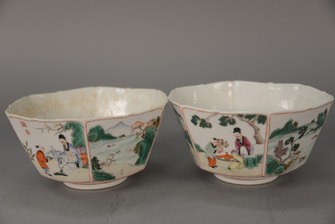 Pair of Famille Rose hexagon bowls, each with six painted panels, Jiaqing mark on bottom. ht. 3 1/2 in. wd. 6 1/2 in.