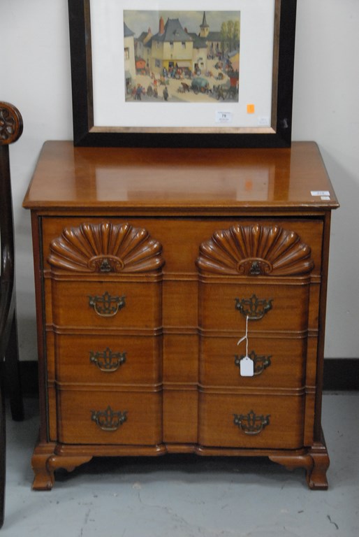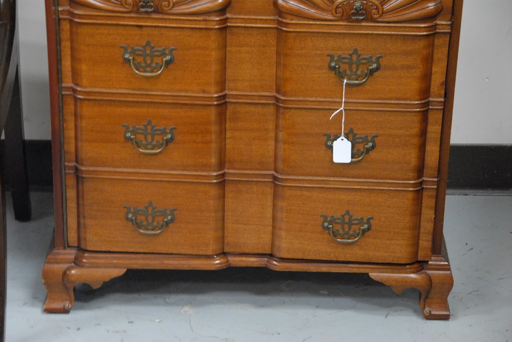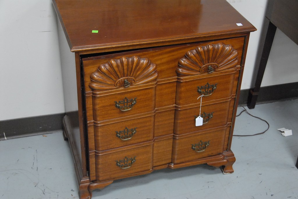 Lot 278: Pair of signed Margolis mahogany cabinets with carved block fronts and four faux drawers as doors opening to reveal stereo, speaker,…