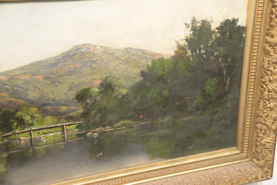 Thaddeus Defrees 1855-1888, oil on canvas, River Running Through New Hampshire, landscape, unsigned, old paper label on verso, 14 x 24 1/4. Provenance: Estate of Arthur C. Pinto, MD