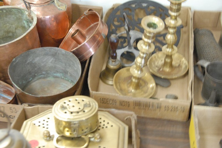 Lot 278: Three box lots brass lot, copper and brass powder horn, copper tea kettle, iron coin safe, and misc.