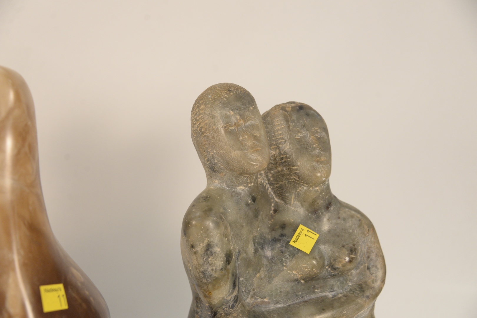 Three Carved Marble Sculptures, to include kissing dove, two figures, and a white marble figure of a nude woman, all unsigned, heights: 6 1/2″, 14″, and 13 1/2″.