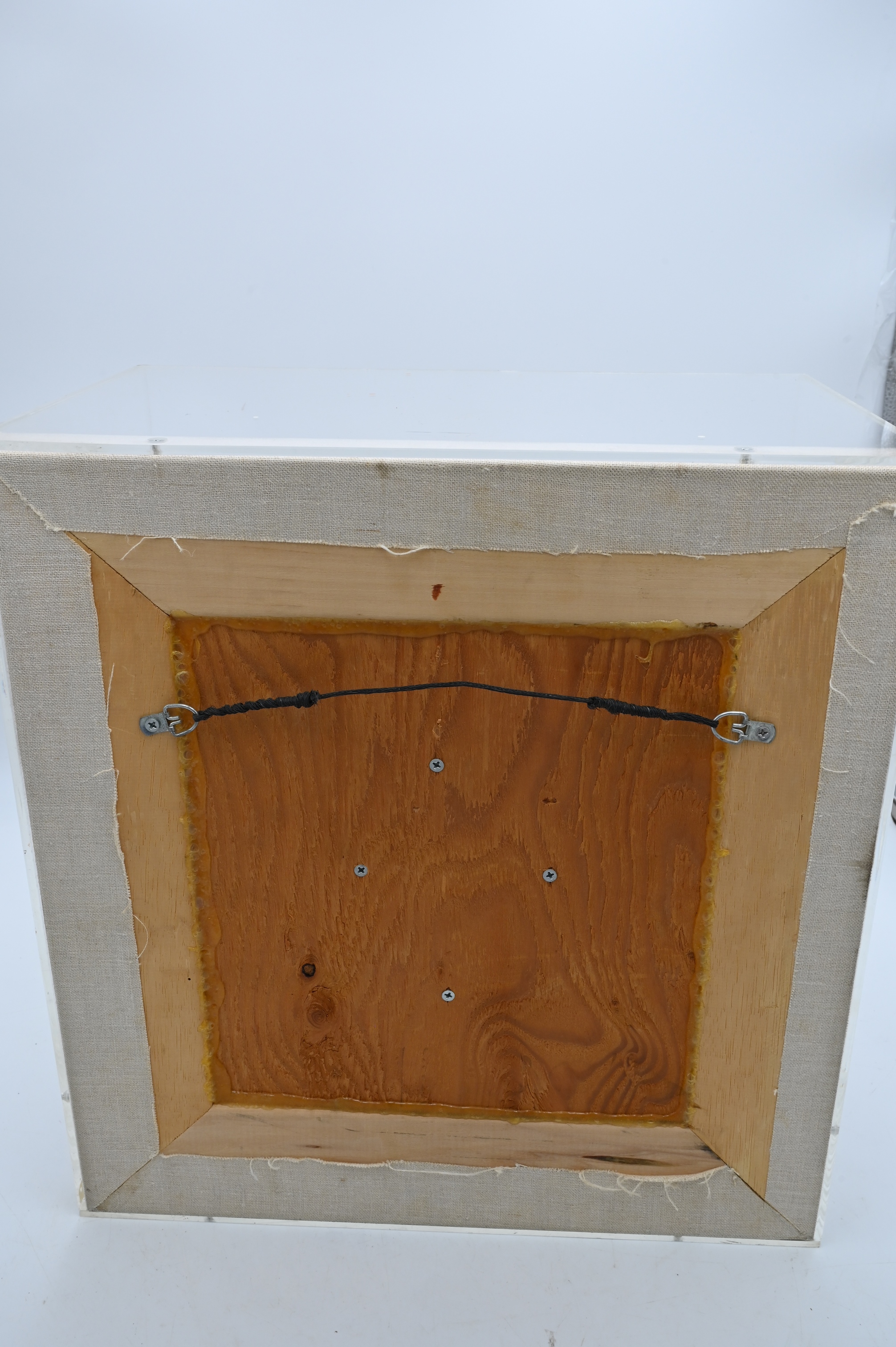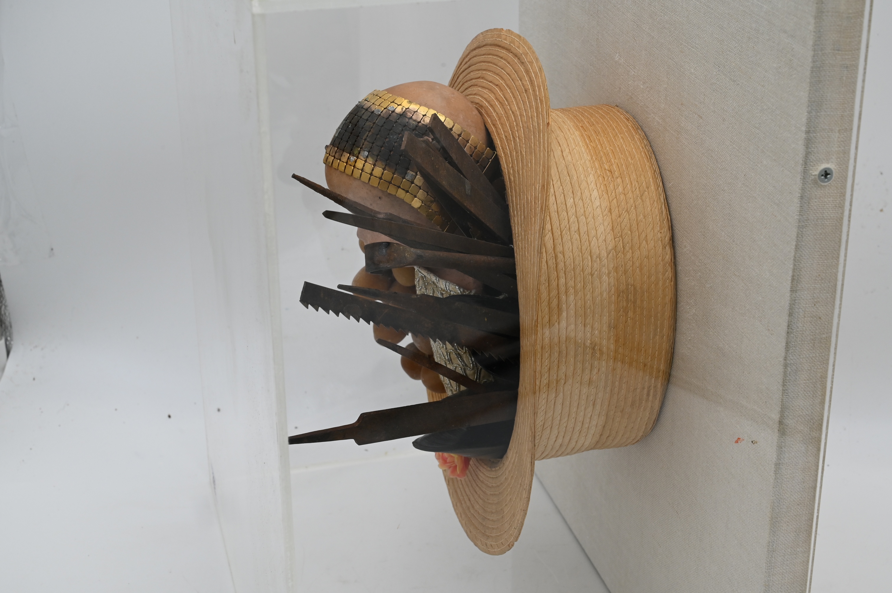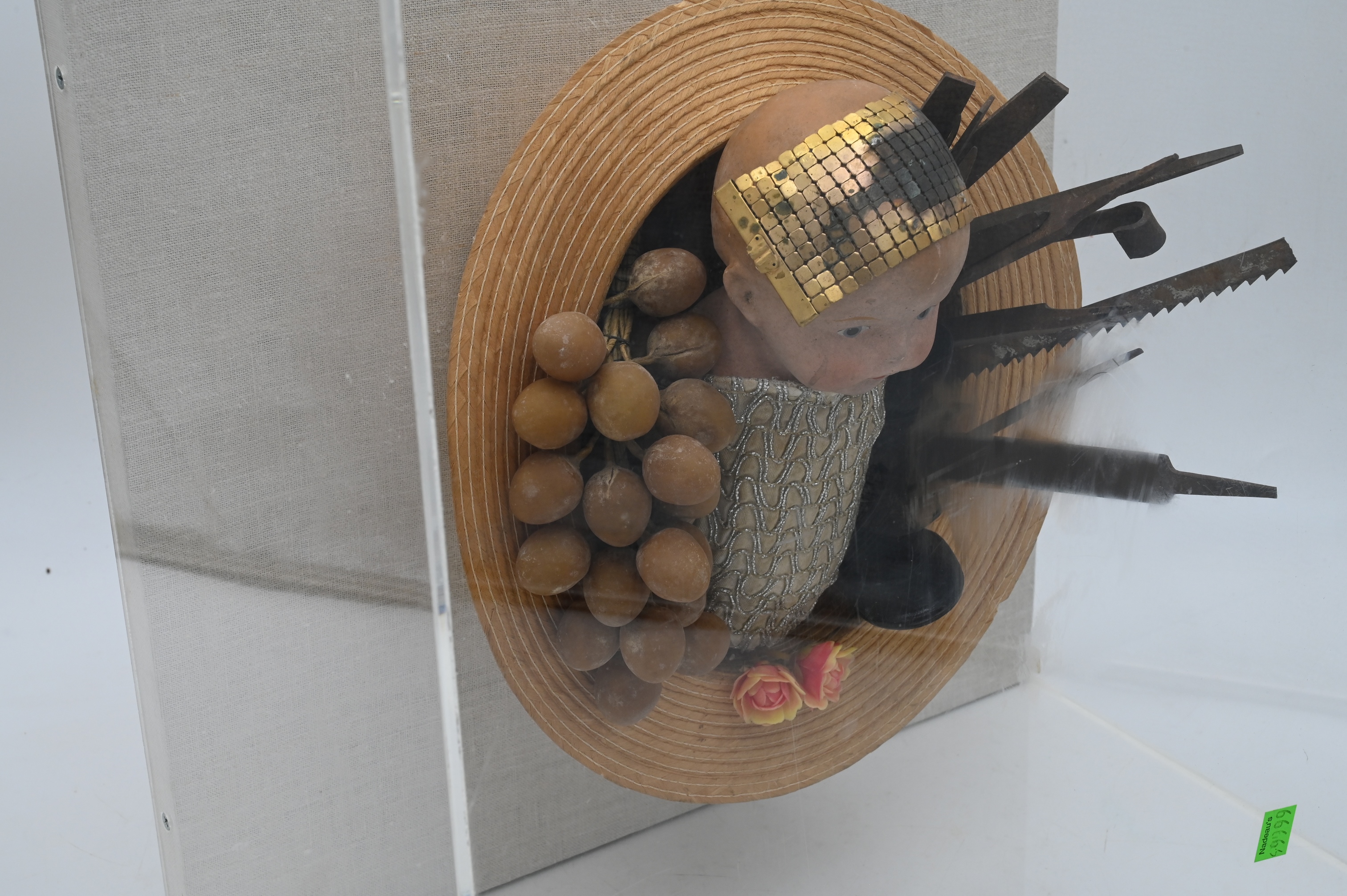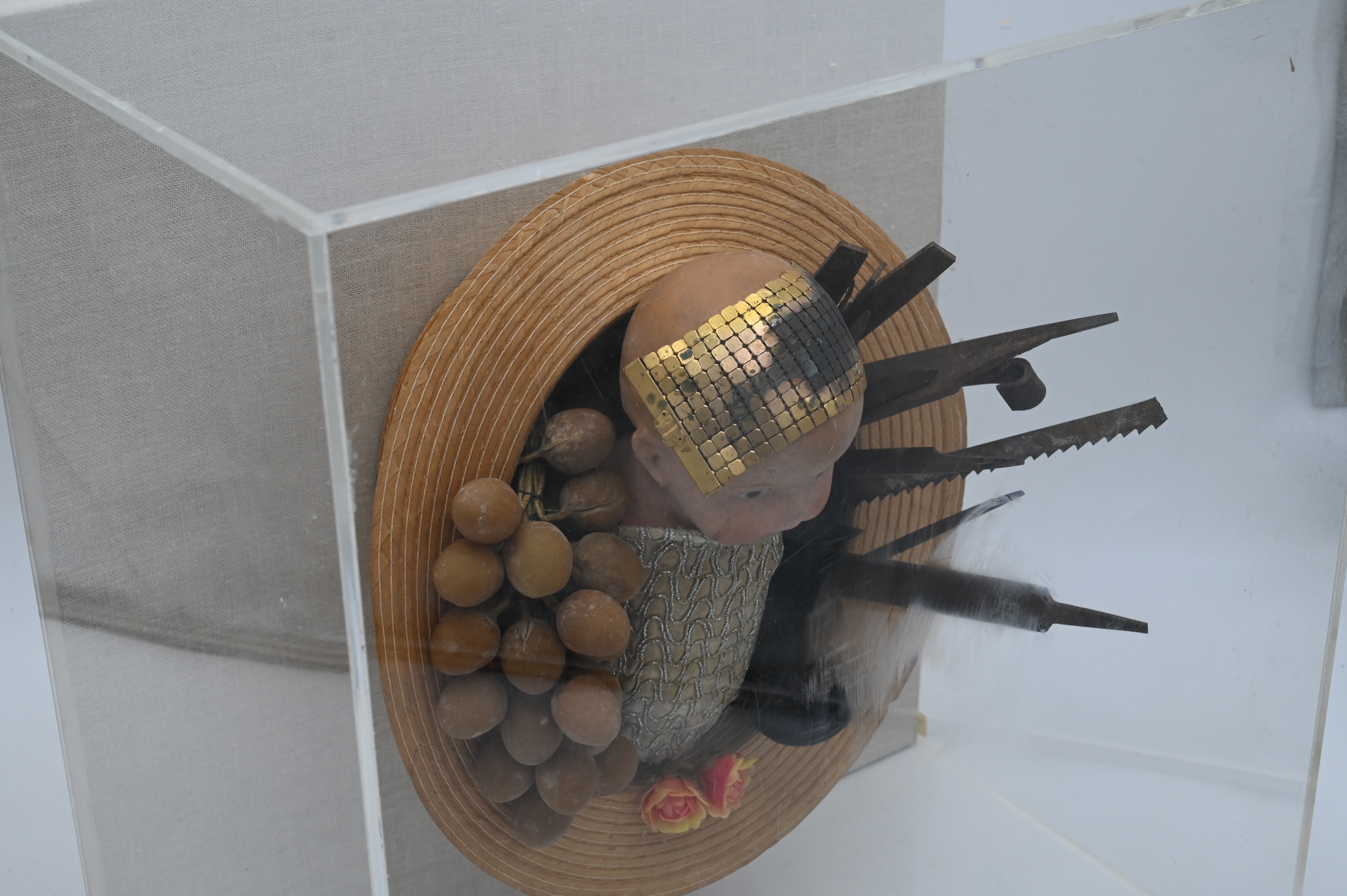 Three Dimensional Sculpture Artist Unknown sculpture of a doll, grapes, mussels, and tools in a hat all set in a plexiglass case