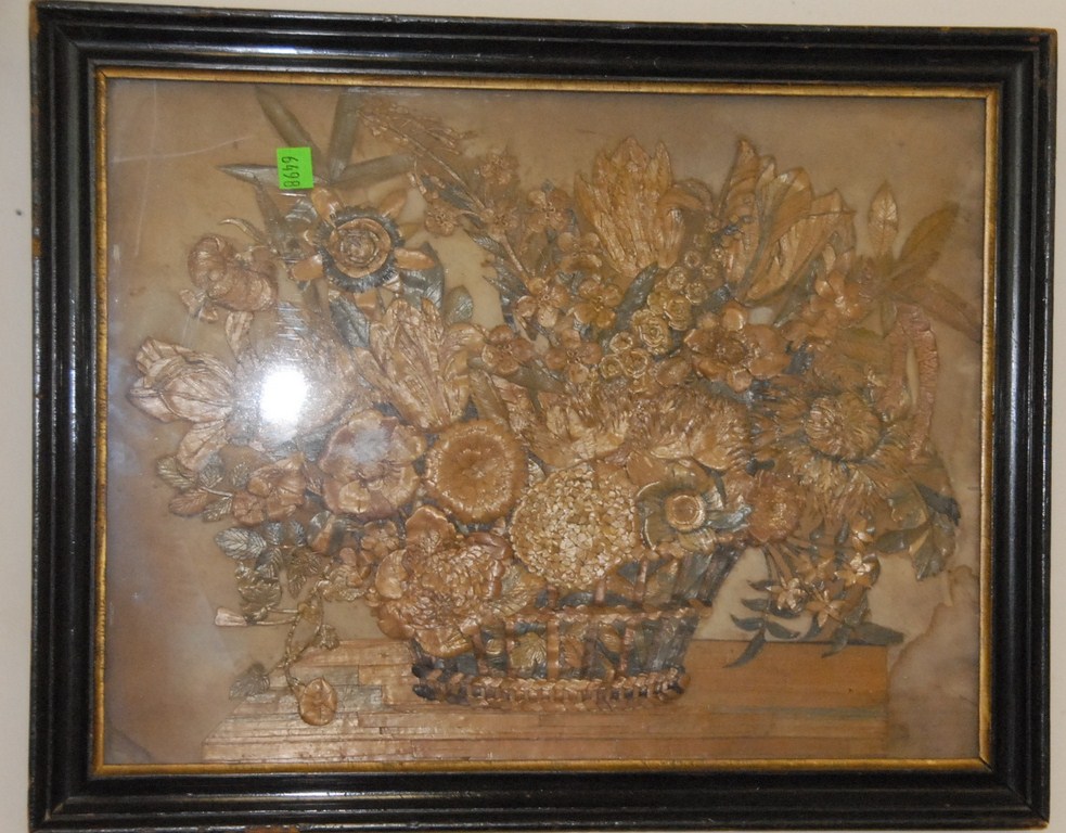 Three framed pieces picture of dog, watercolor, and collage of basket of flowers.