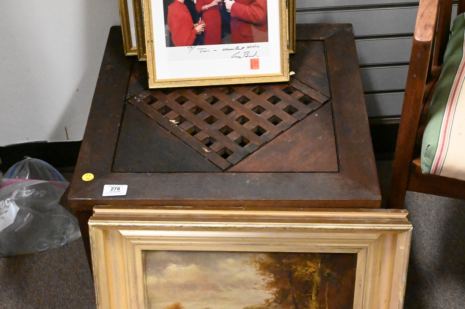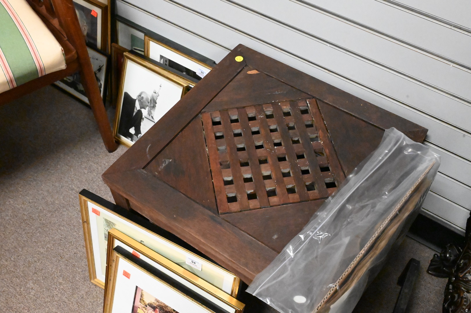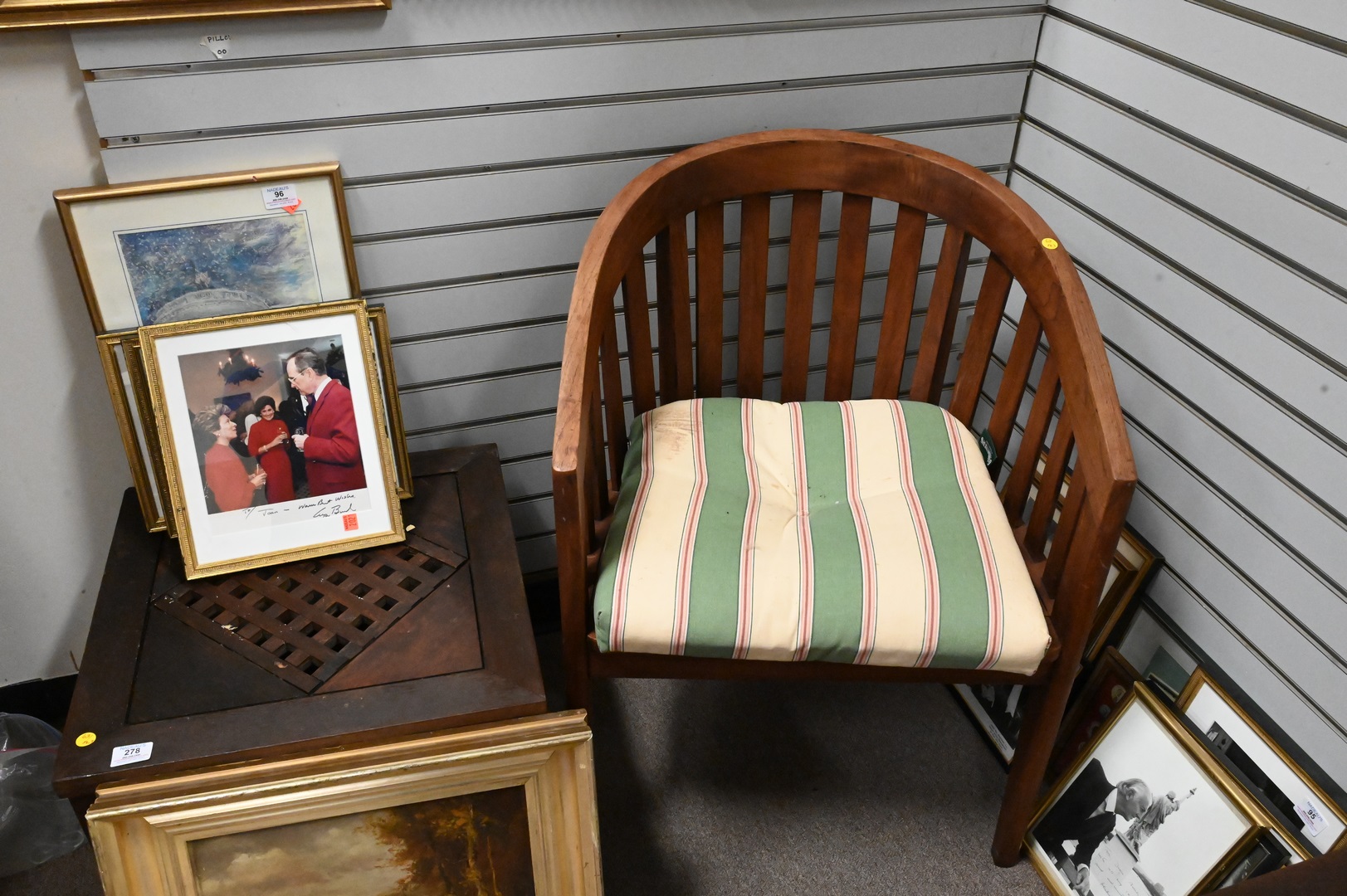 Three Piece Outdoor Teak Lot, to include barrel back armchair along with pair of side tables, table heights 16 1/2 inches, tops 20″ x 20″.