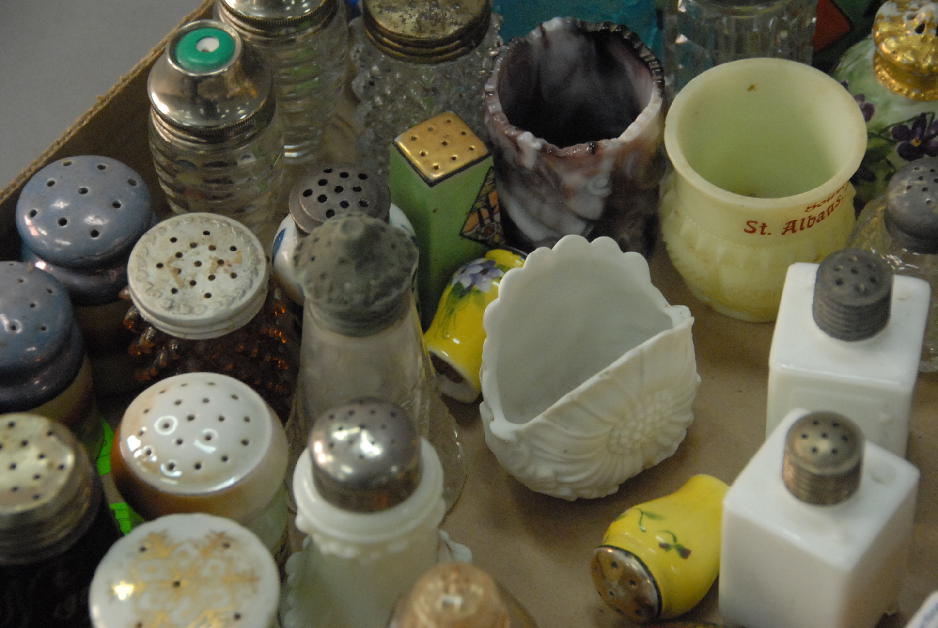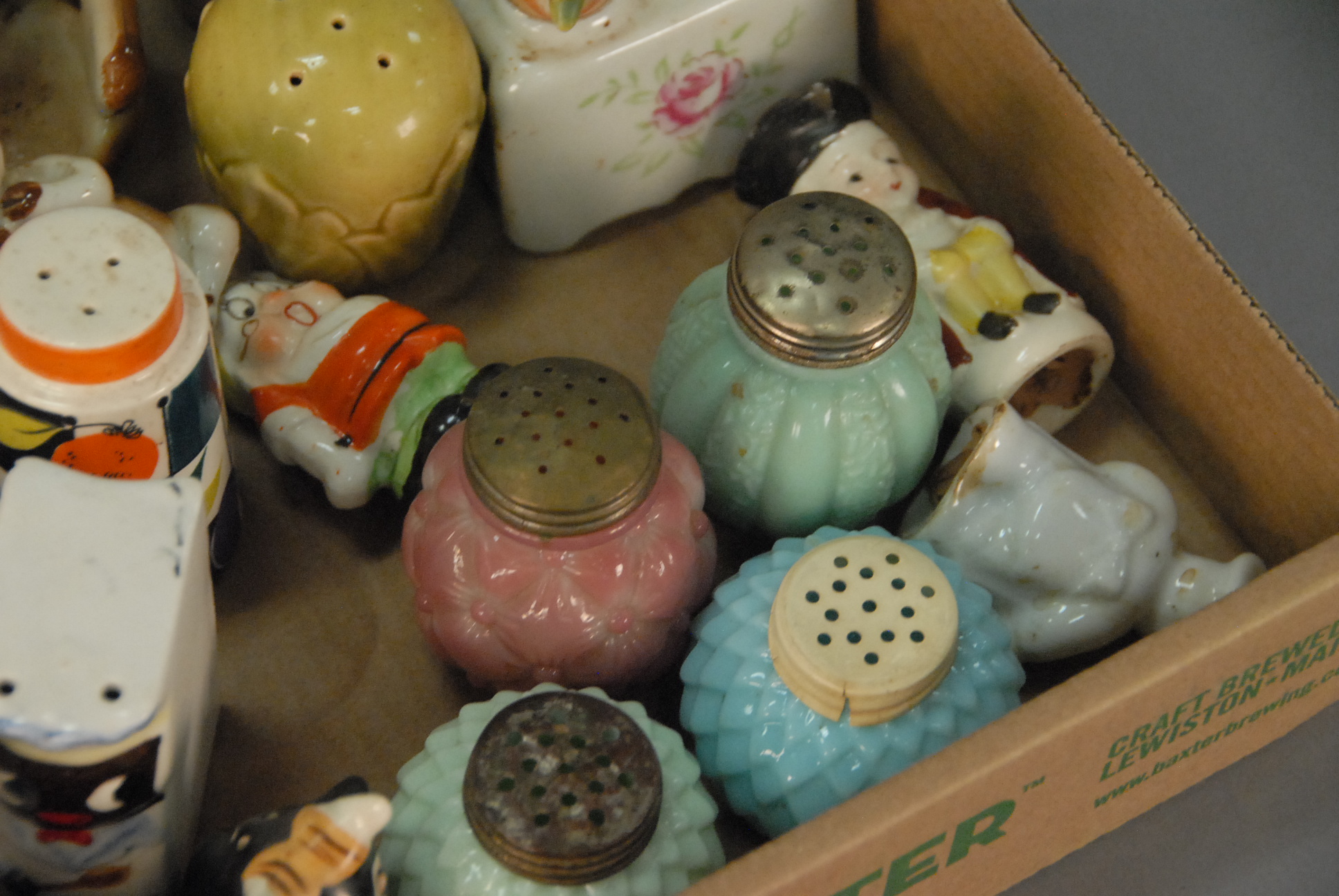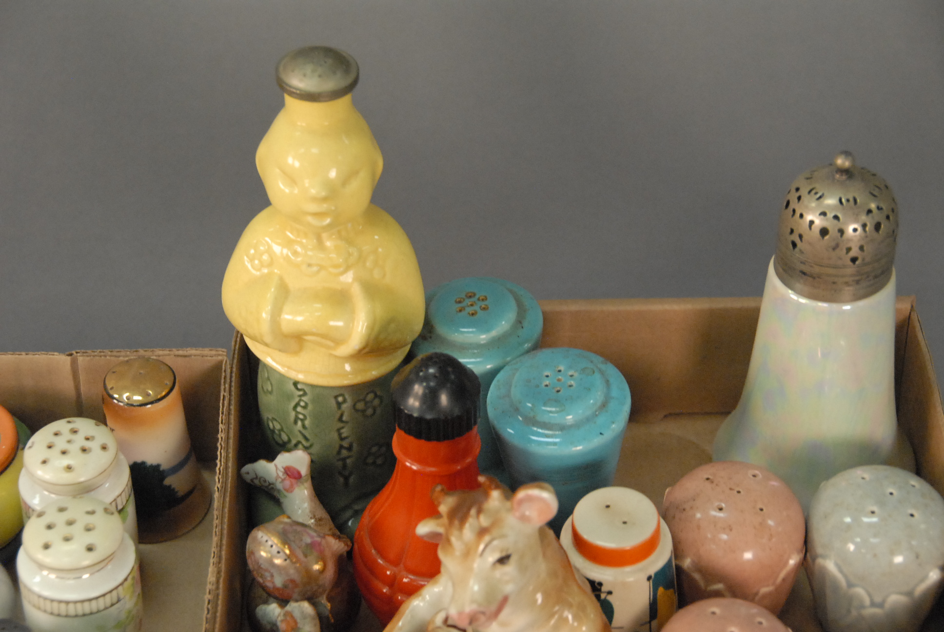 Two box lots of salt and pepper shakes, some figural, Nippon, glass, and porcelain.