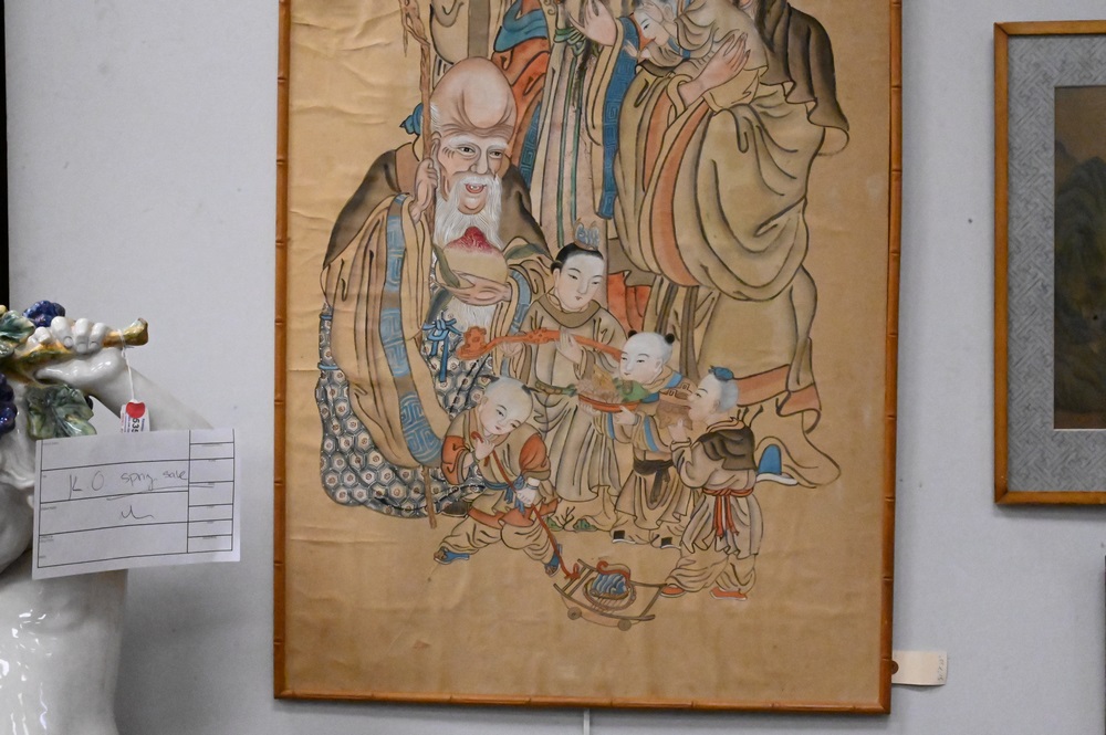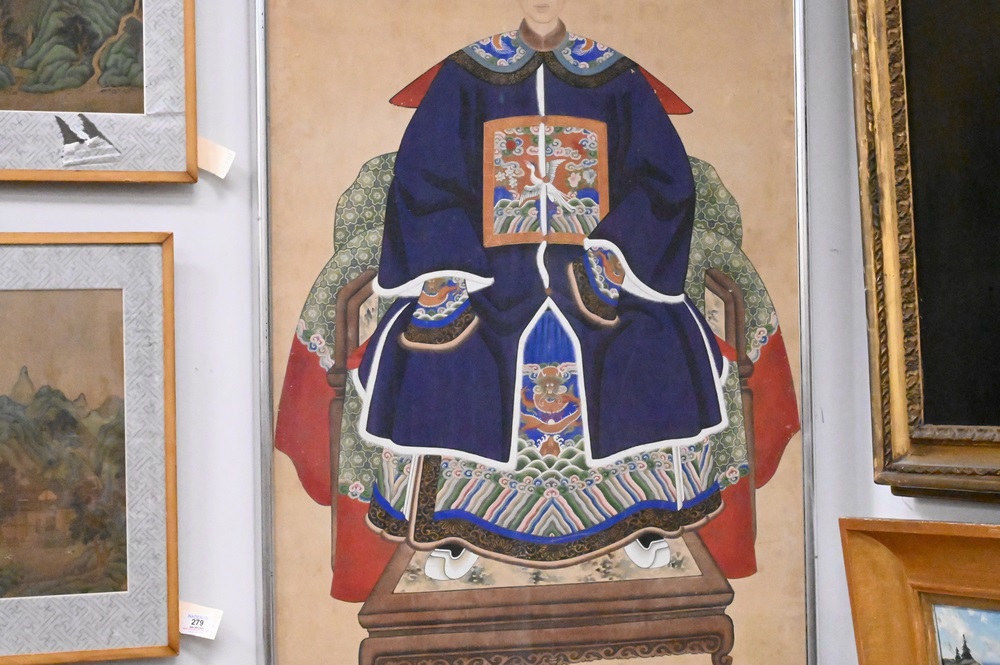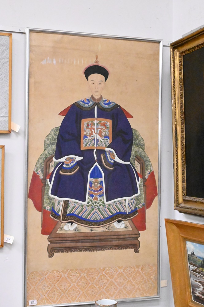 Lot 278: Two Chinese Watercolor on Paper, to include one depicting the Immortals, 50″ x 25″; along with male ancestral portrait, 53 1/2″ x 27 1/2″.